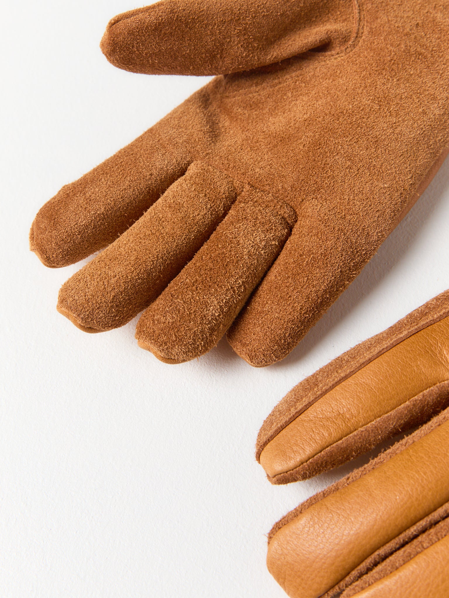 Boa gloves made from cowhide leather with a textured finish. Sheepskin boa lines the back, while Bemberg® fabric lines the palms for grip. Includes a brand tag.