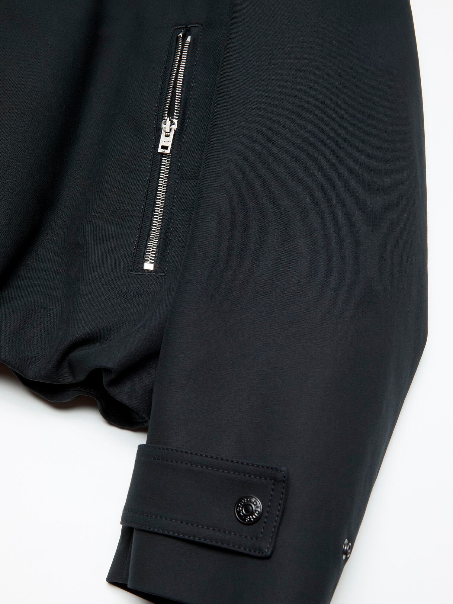 Crafted from smooth cotton satin with a distinctive double weave. Leather collar and snap button front combine with zippered side pockets. Adjustable tab cuffs and gathered hem with drawcord. Regular fit, below waist length, with leather logo patch at back neckline