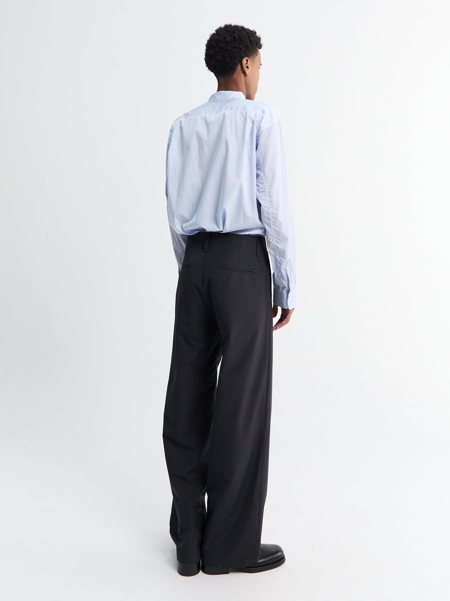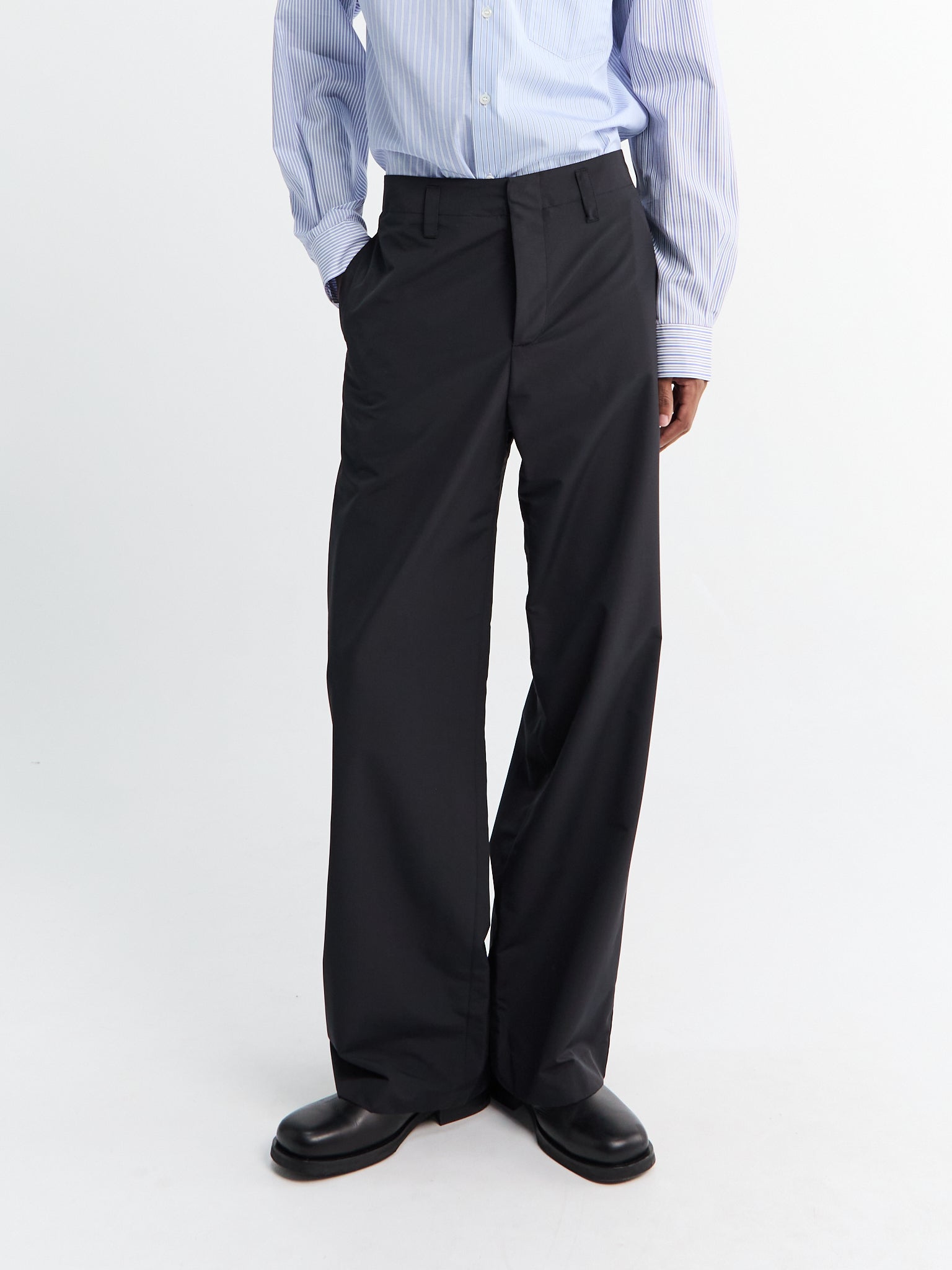 The Sargeant Pant Loro is cut with a wide-leg silhouette in black fabric. A front crease runs the length of the pant and breaks over the shoe. The pant features a mid-rise waist and belt loops.
