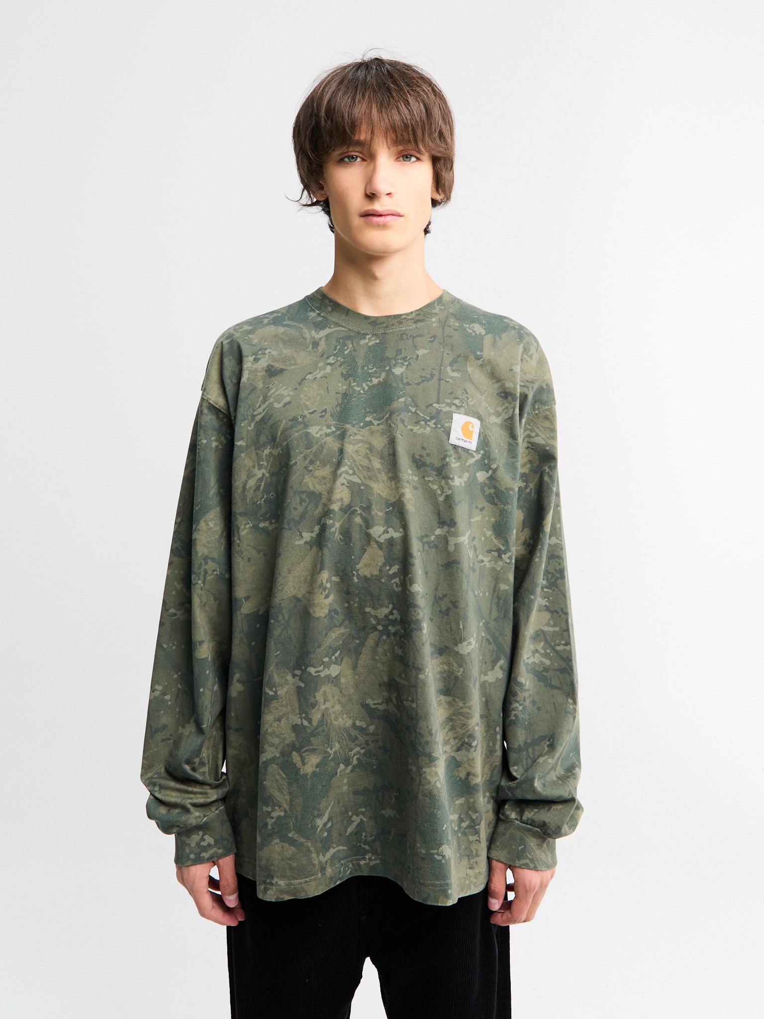 This long-sleeve tee features an all-over camouflage print with a ribbed crew neck and stretch cuffs for comfort. Made from 100% organic cotton single jersey, it offers a loose fit and durability. The Carhartt woven label on the chest adds a subtle brand detail