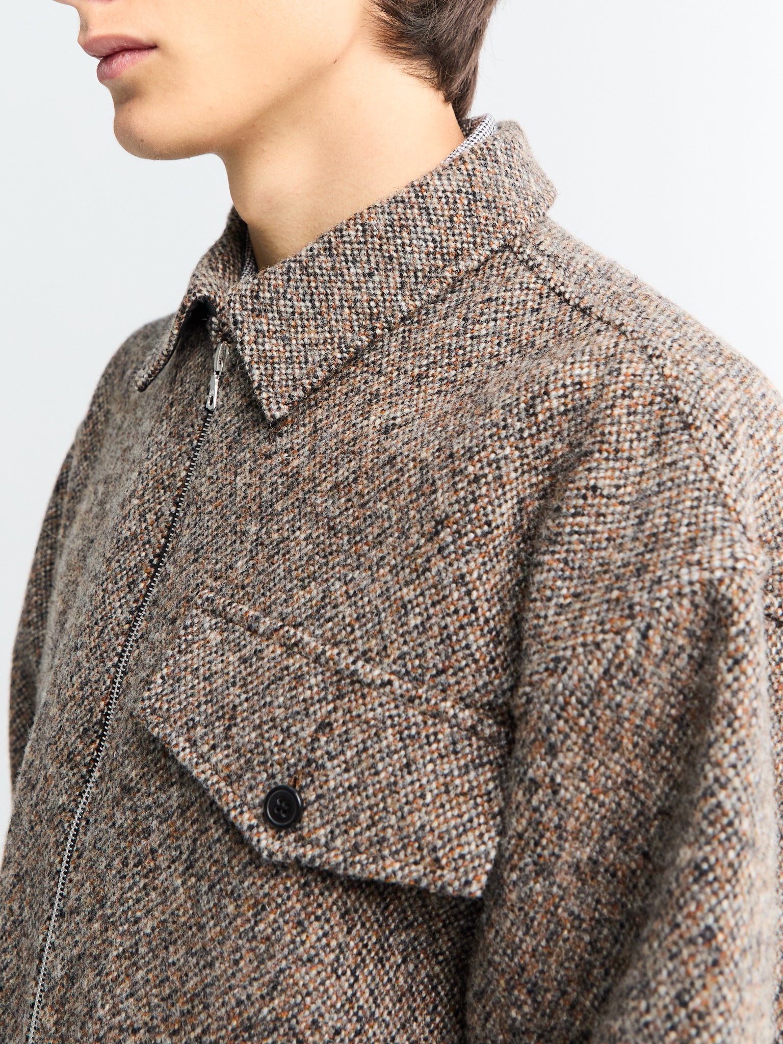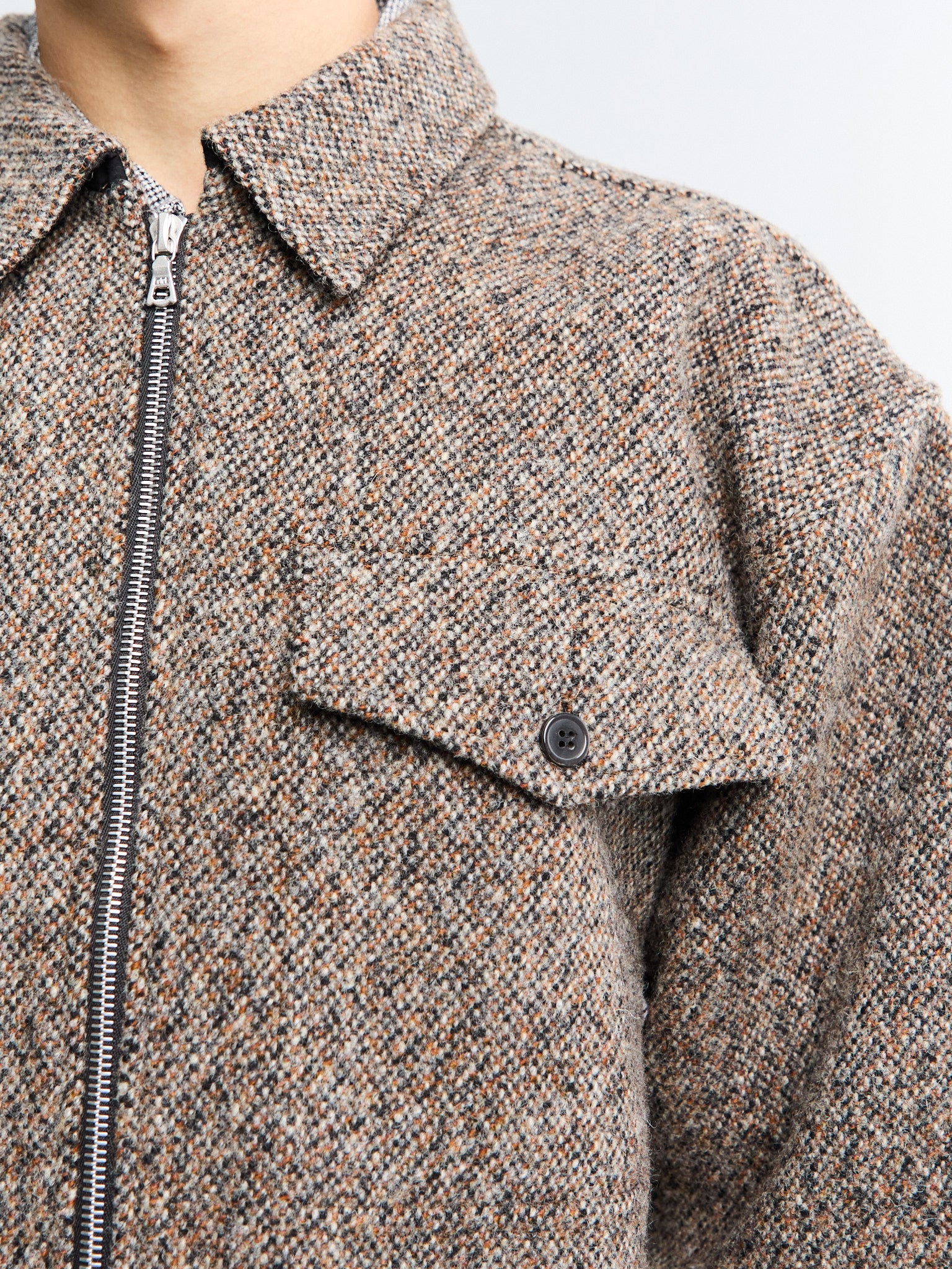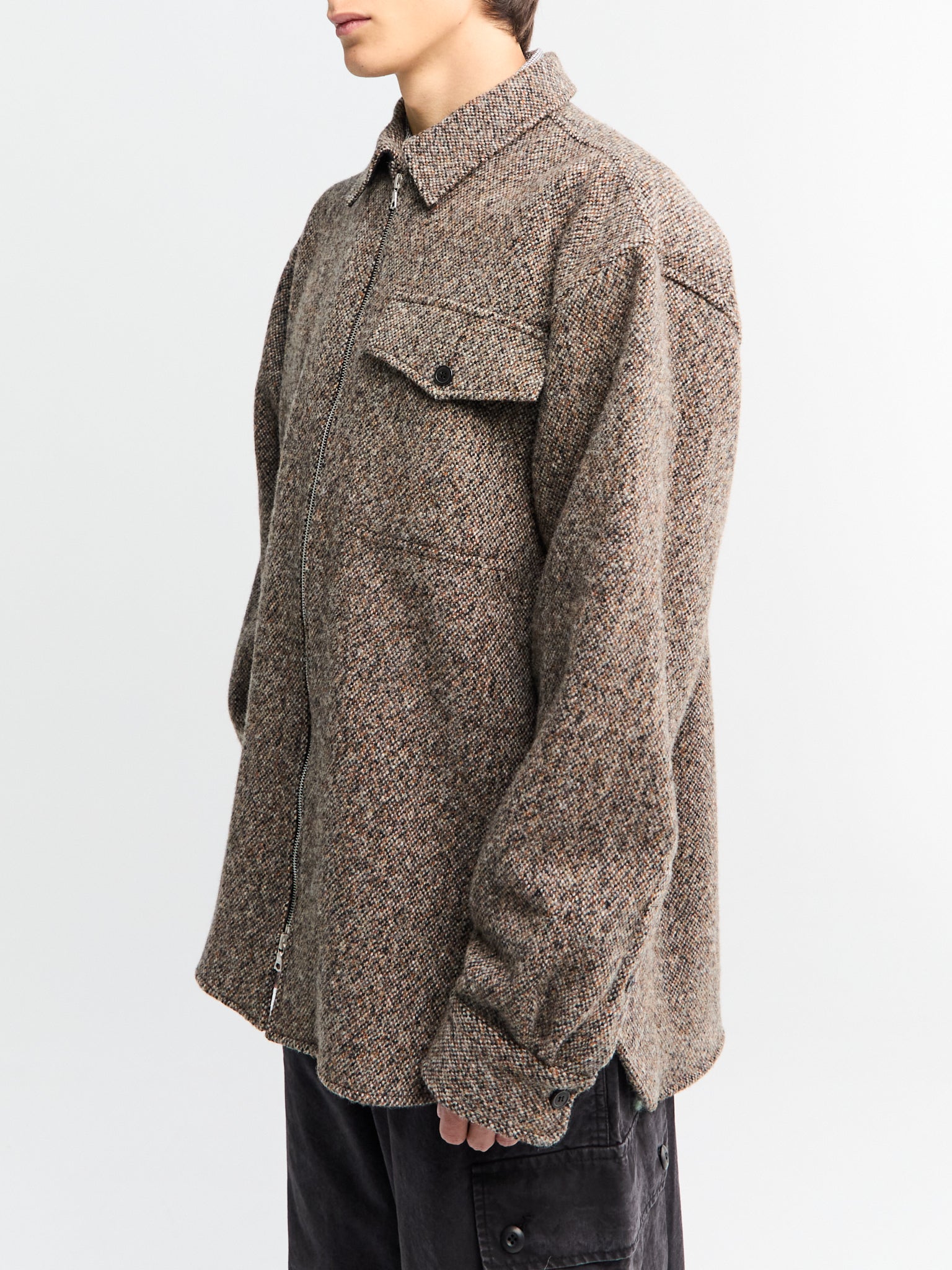 This mid-weight wool-blend overshirt, designed in a relaxed oversized fit with a zip closure, allows for easy layering, combining practical comfort with timeless design.