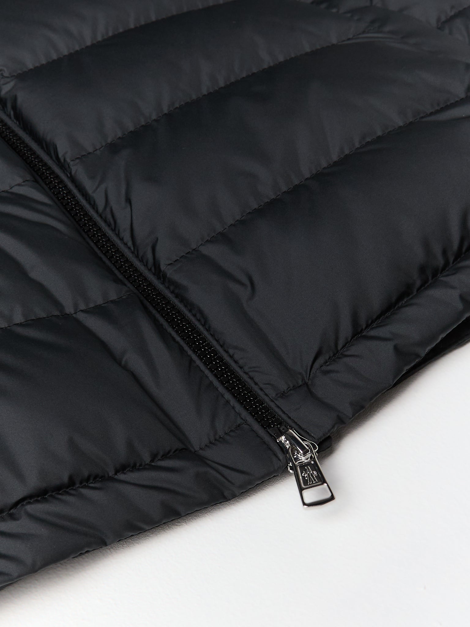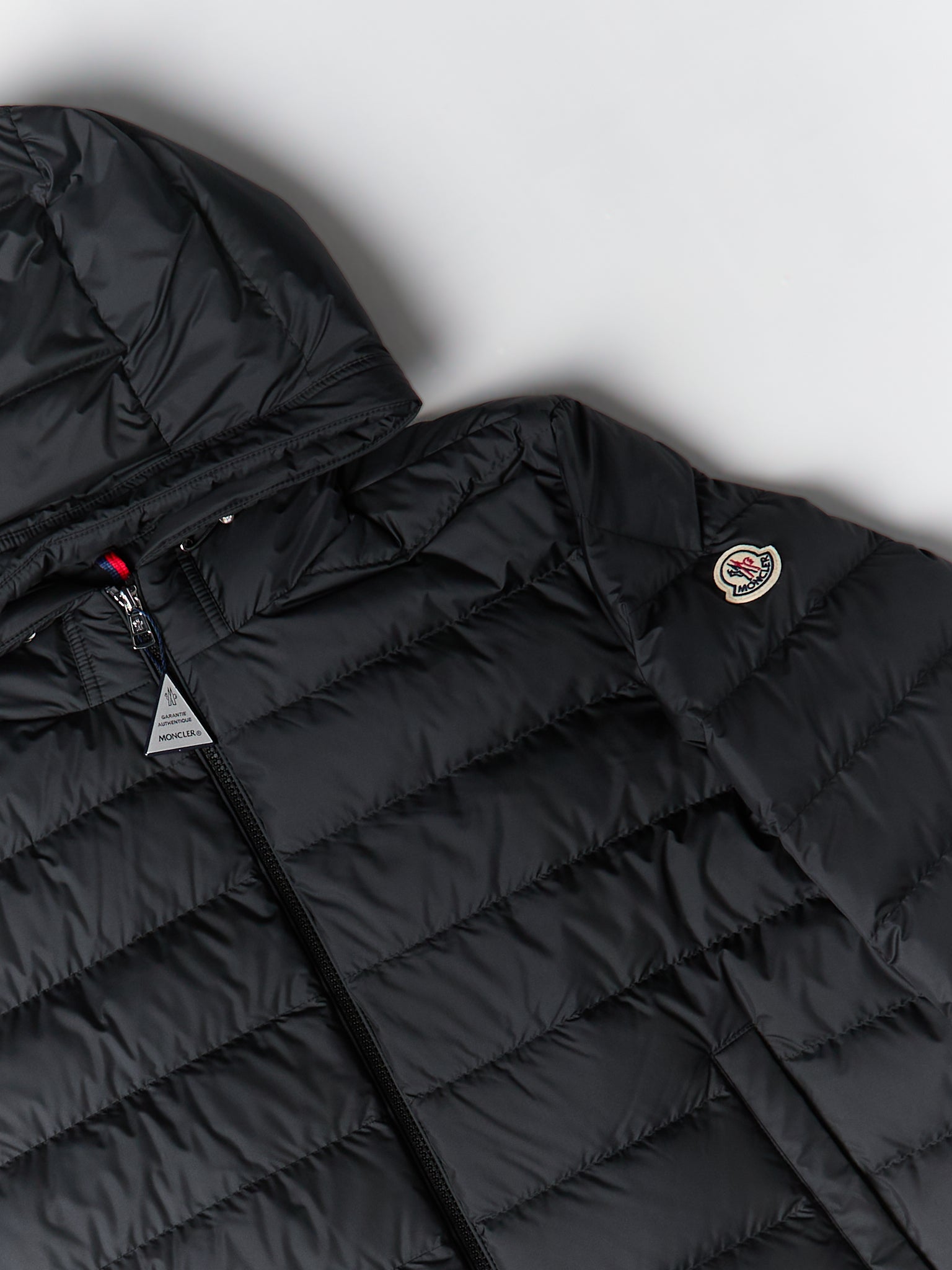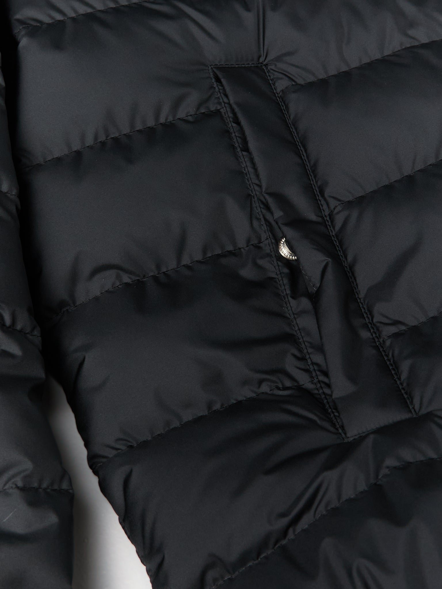 Made from fabric that resists rain. It features a hood and a tricolour detail on the hood that references brand heritage. The short silhouette works as a layering piece for changing weather.