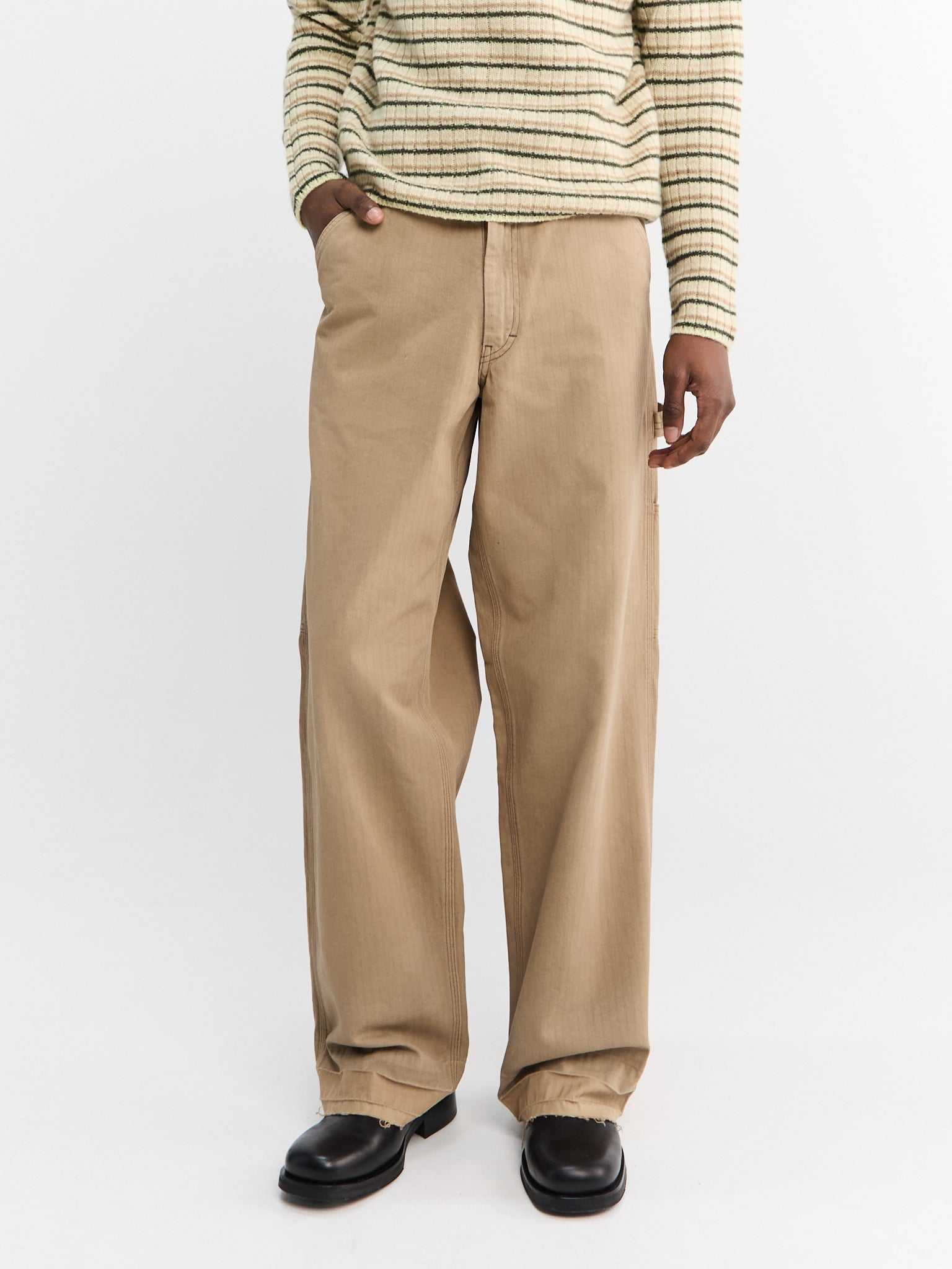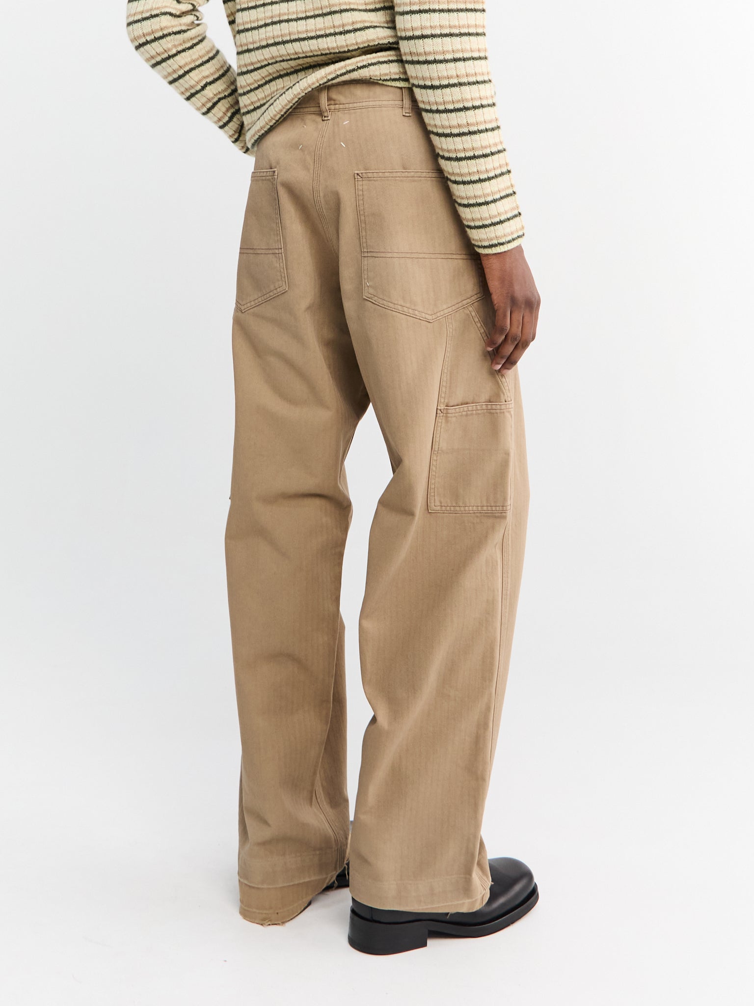 These Maison Margiela jeans showcase a wide-leg design with cargo-style pockets and frayed hems. They feature the brand’s distinctive four stitches at the back. Treated with a stone wash, this pair highlights workwear details such as carpenter loops and deep pockets, complemented by a straight-leg fit that tapers smoothly along the leg.