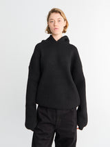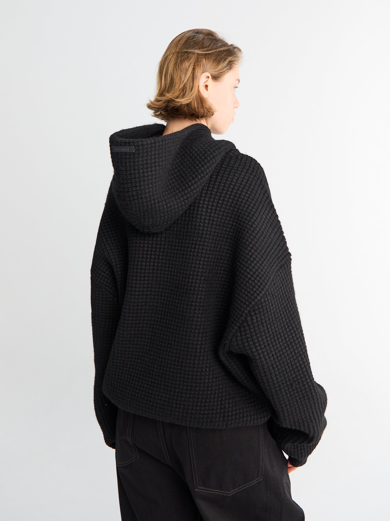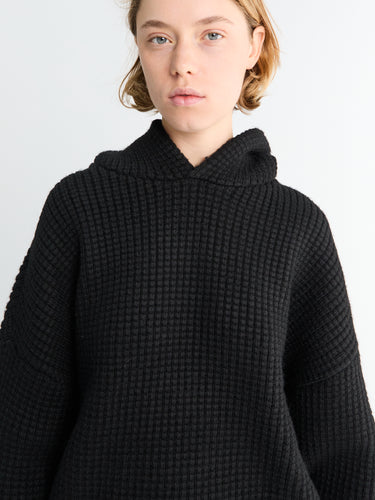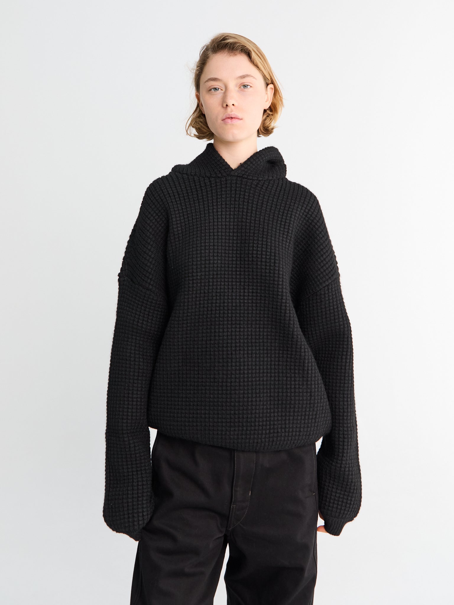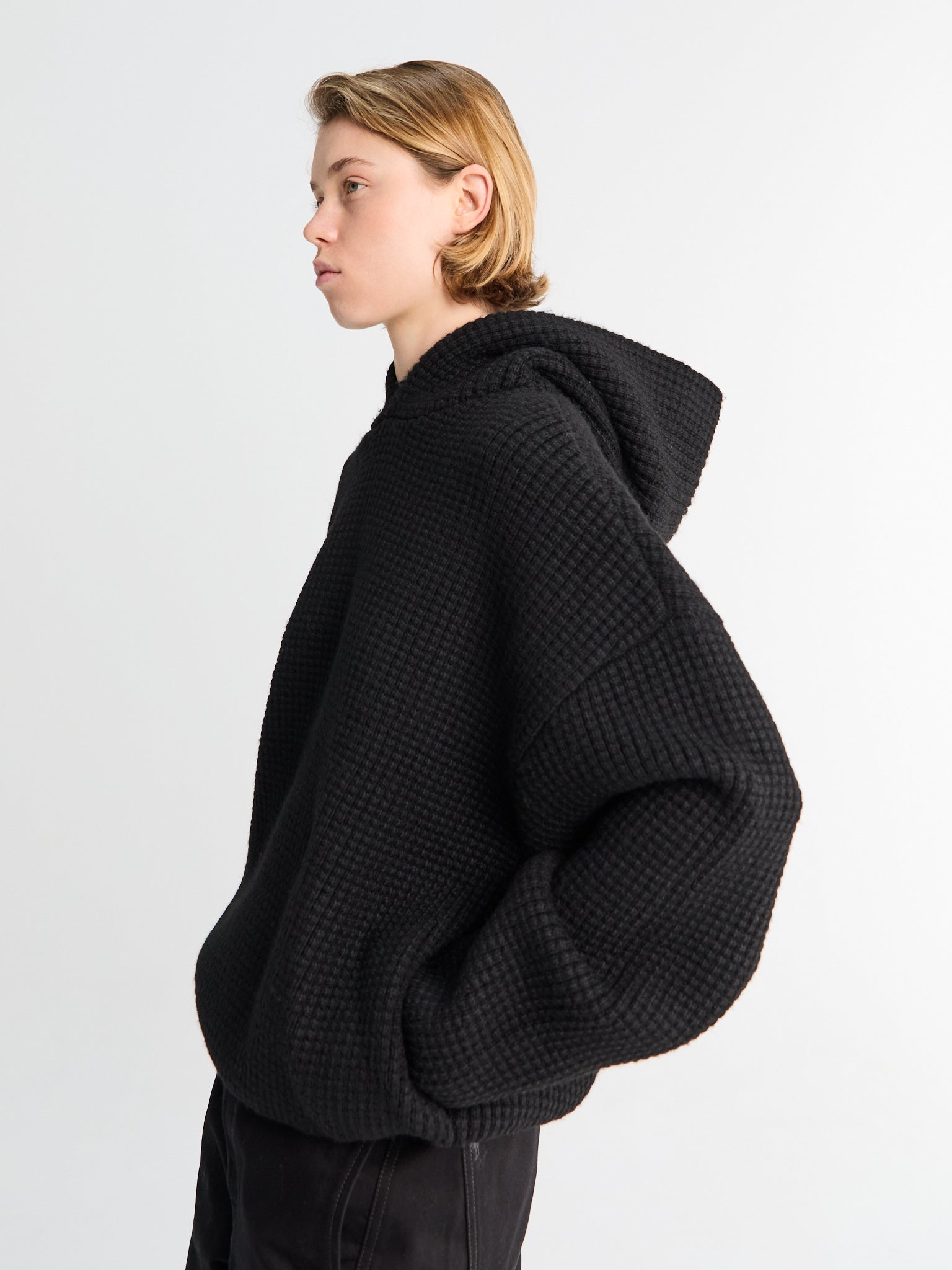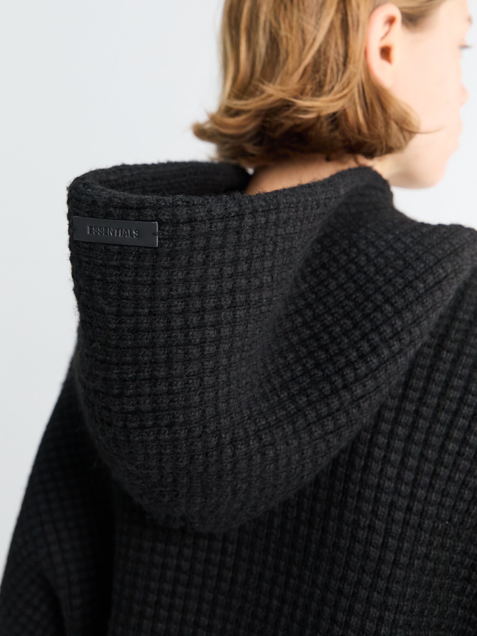 Hoodie is knitted from a heavy waffle knit and cut in oversized proportions and dropped shoulders for a relaxed drape. Refined details include rib-knit cuffs, and waist hem, finished with a Fear of God Essentials rubberized label stitched on the hood