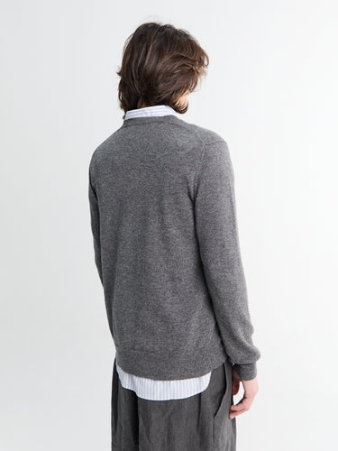 Made with wool, this v-neck sweater features ribbed cuffs and bottom, and a signature red emblem on the chest.