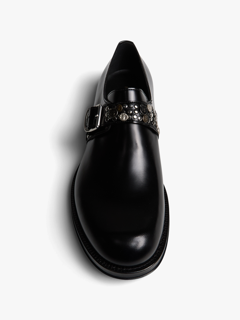 These black leather shoes combine timeless design with a bold edge. A silver buckle strap across the upper adds a refined statement detail. Perfect for both formal occasions and elevating everyday outfits.