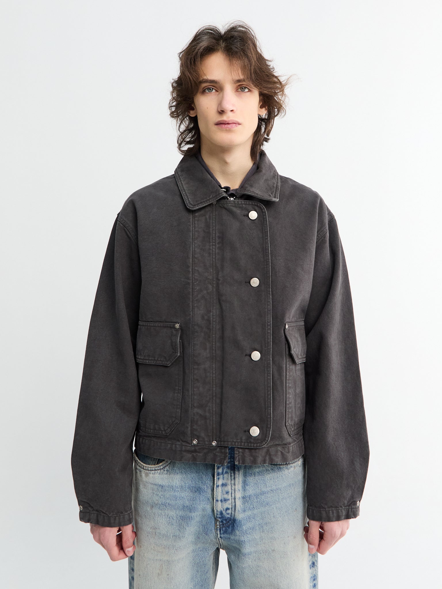 Crafted from softly garment-washed organic cotton canvas in a grey tone, the Courier Jacket combines understated style with practical design. Its relaxed silhouette features drop shoulders and a subtle cropped length, while a spread collar and snap-button placket create an effortless front closure. Functional patch pockets with flaps offer convenient storage.