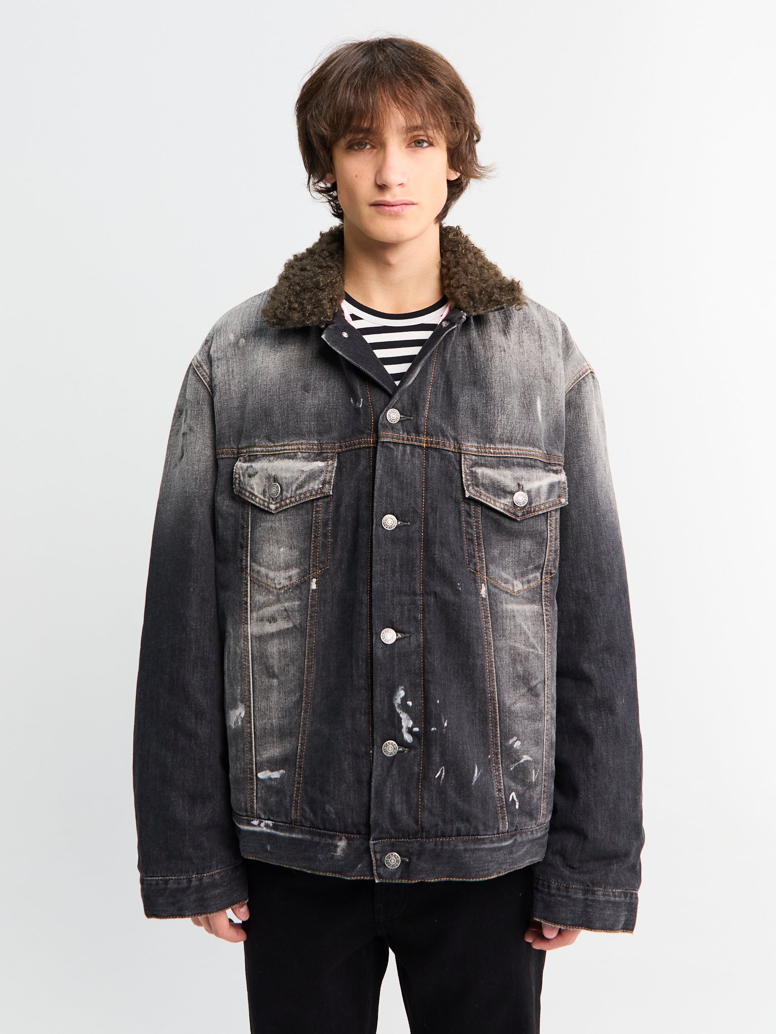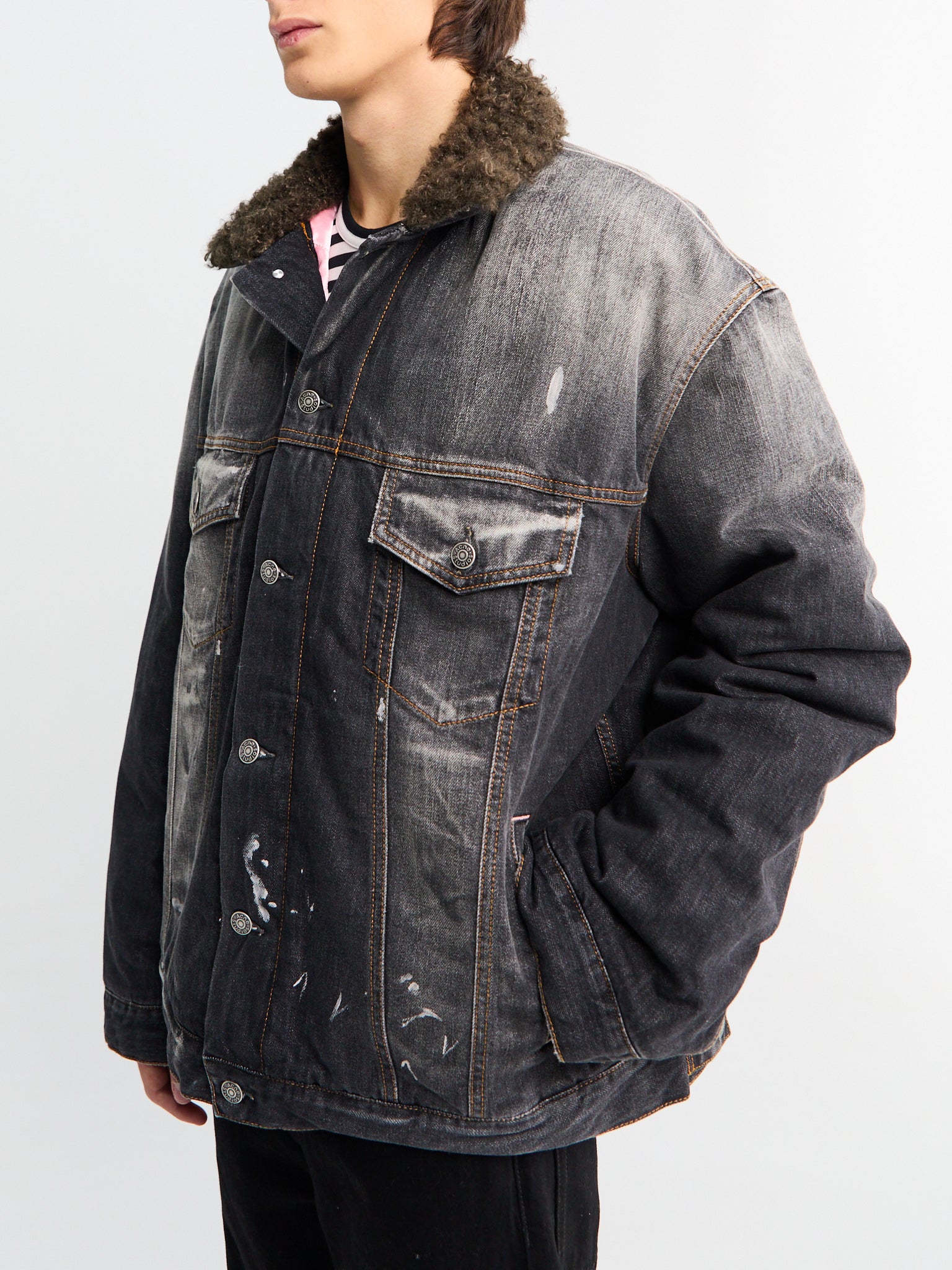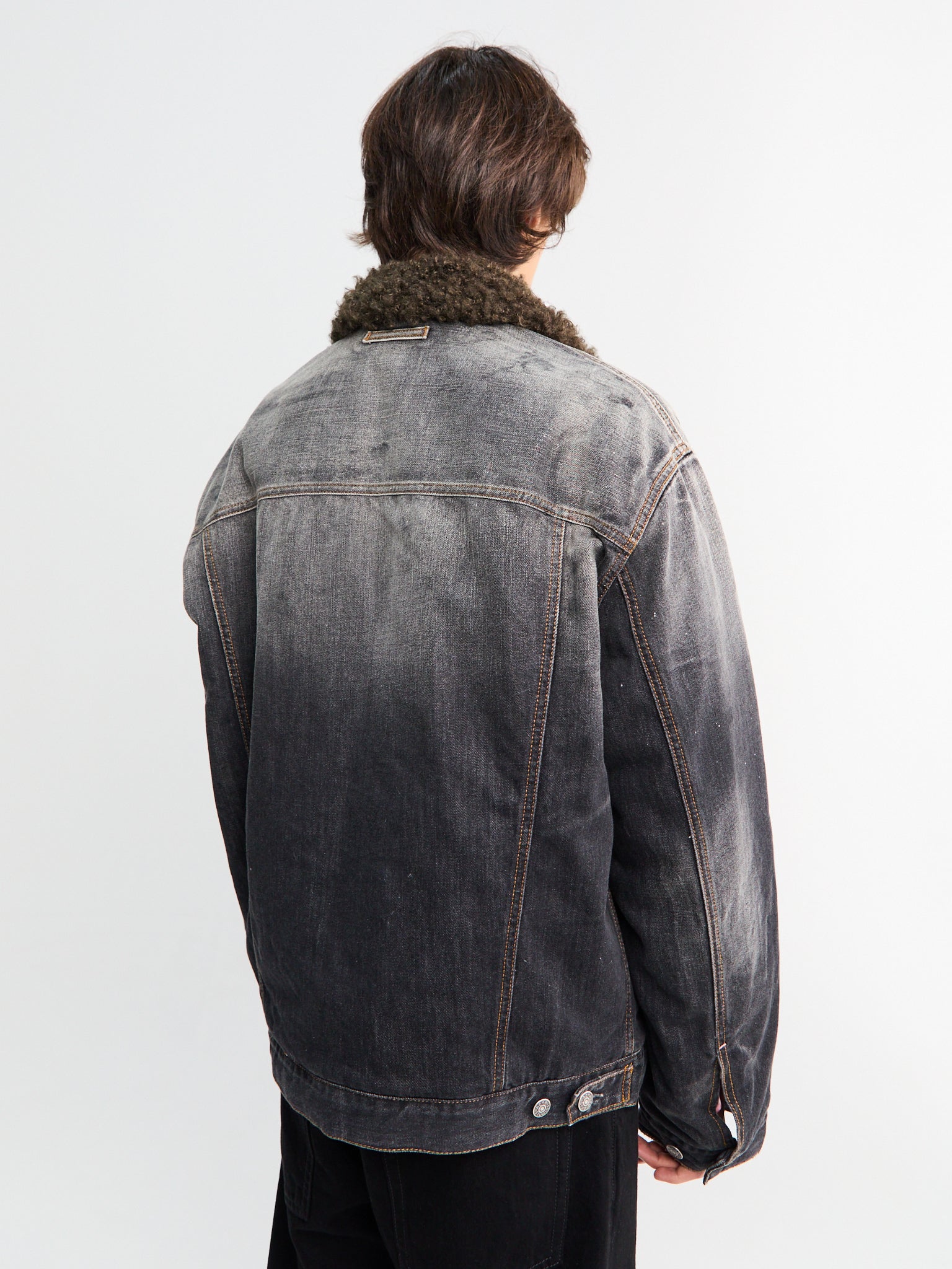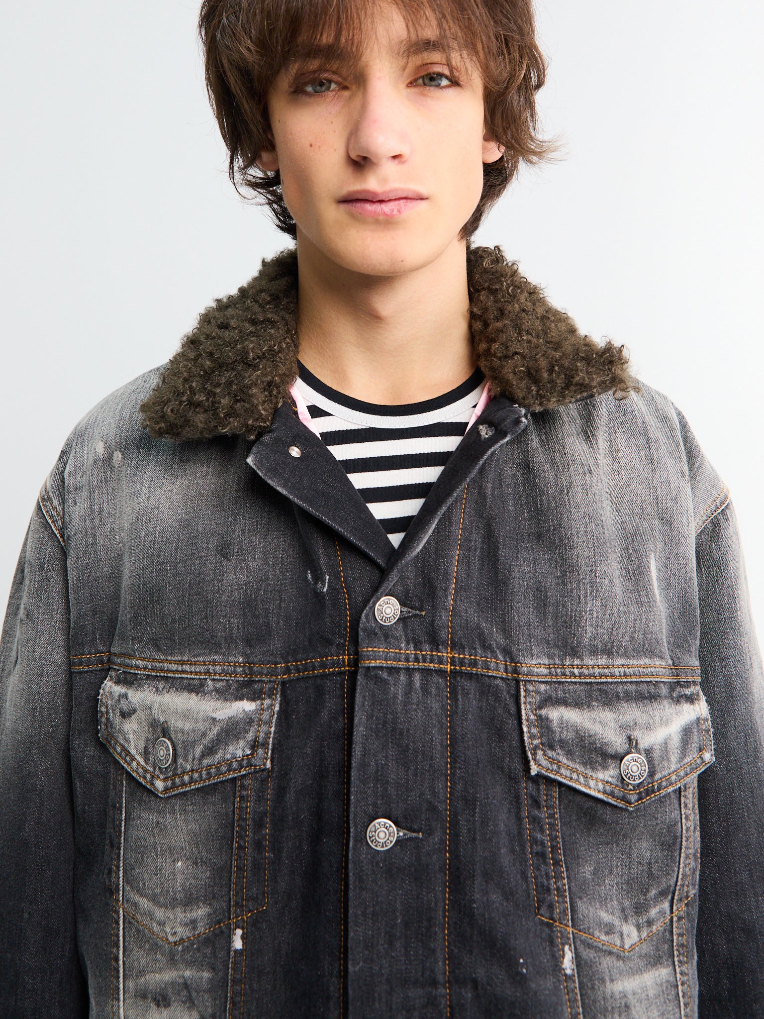 This Acne Studios denim jacket offers a refined take on a timeless silhouette. Crafted from heavyweight washed black denim, it features a vintage-inspired distressed finish and a soft faux fur collar for added warmth and texture contrast.