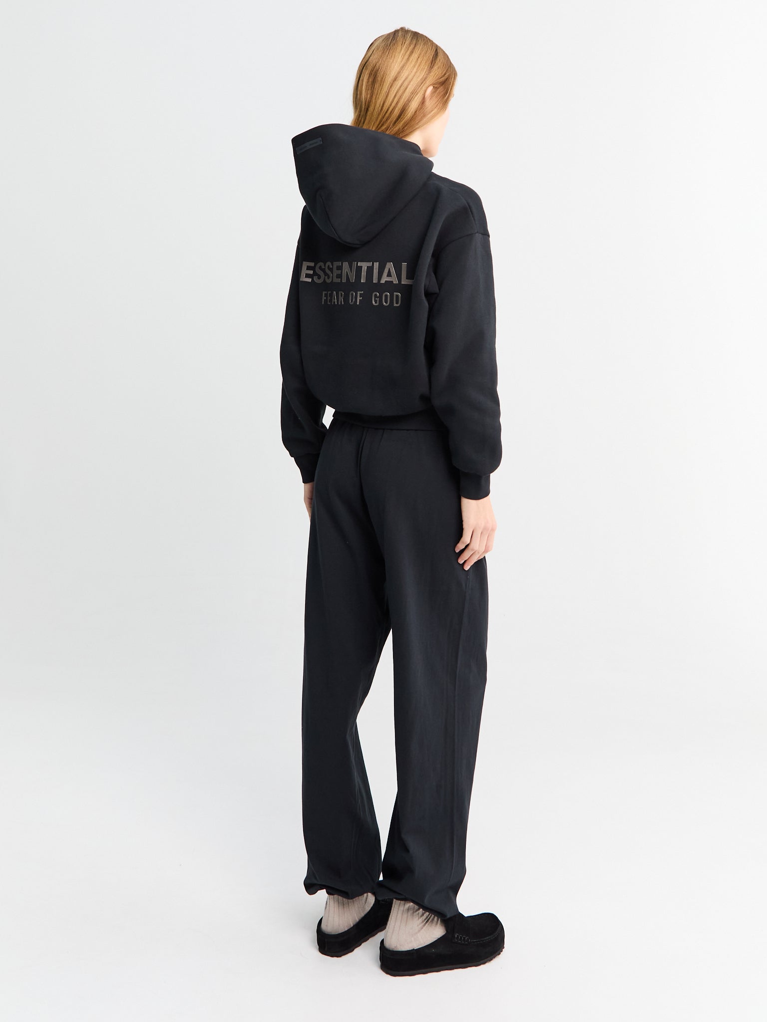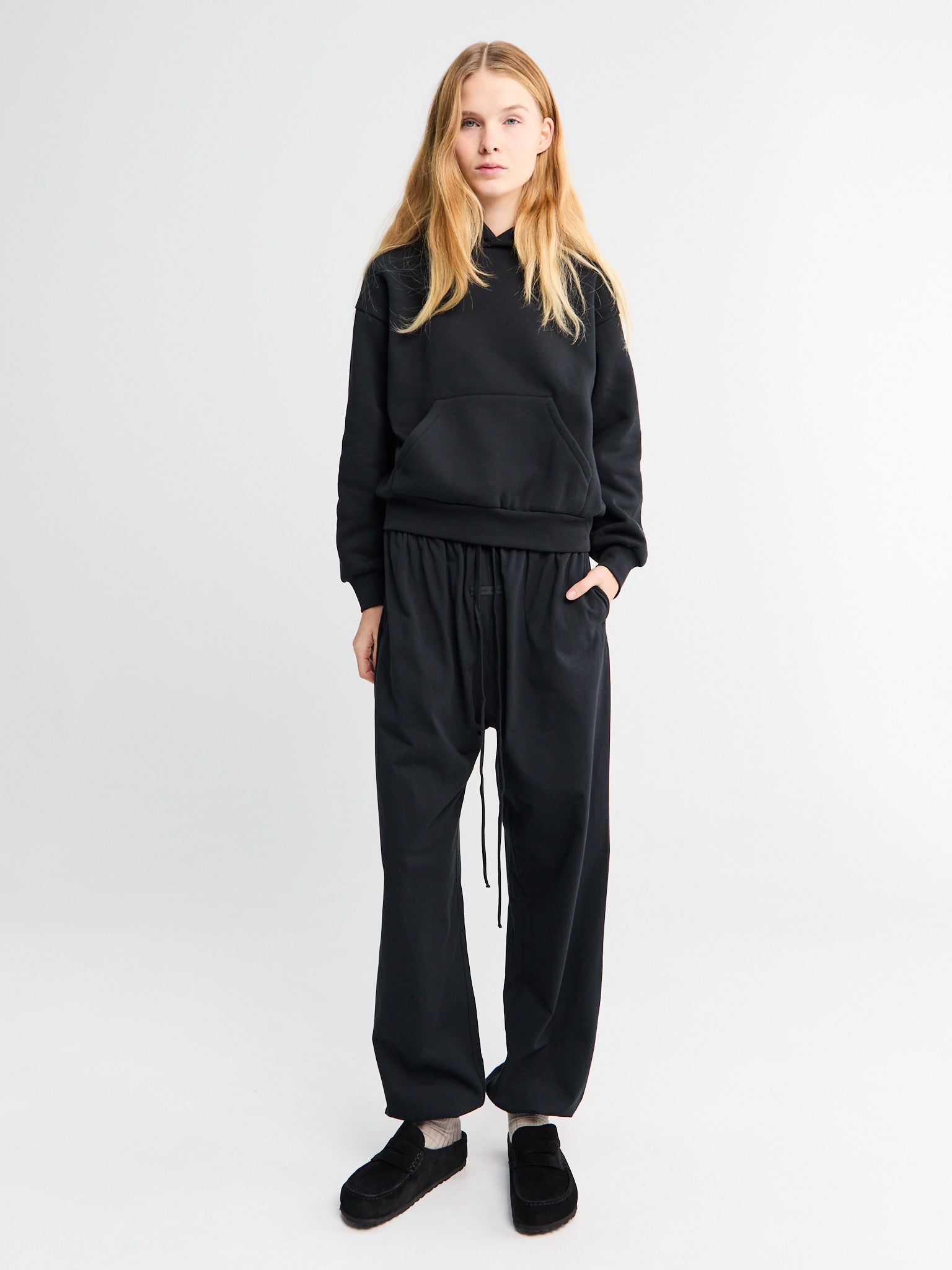 Designed for everyday comfort, these jet black sweatpants offer a relaxed silhouette with a covered elastic waistband and extended drawstrings for an adjustable fit. Soft fleece construction keeps you cozy, while practical side seam pockets and elastic ankle cuffs complete the versatile design. Perfect for lounging or casual outings.