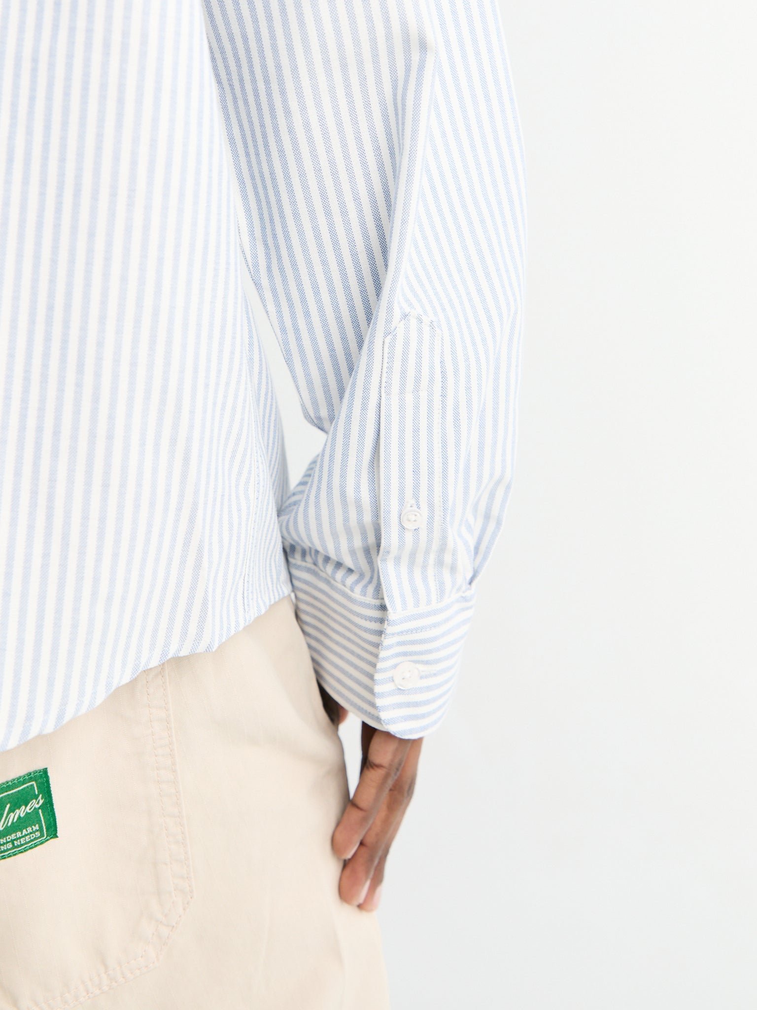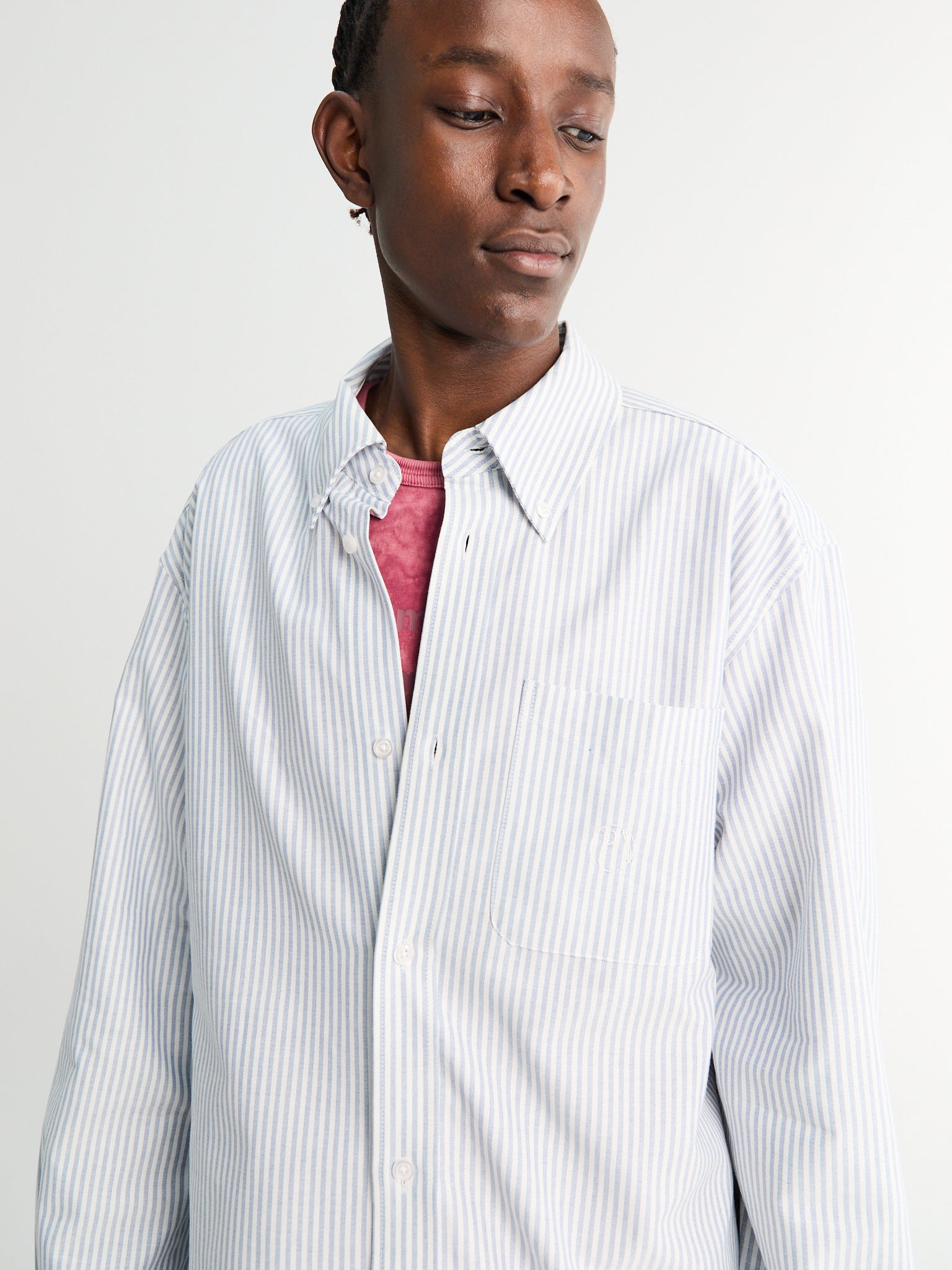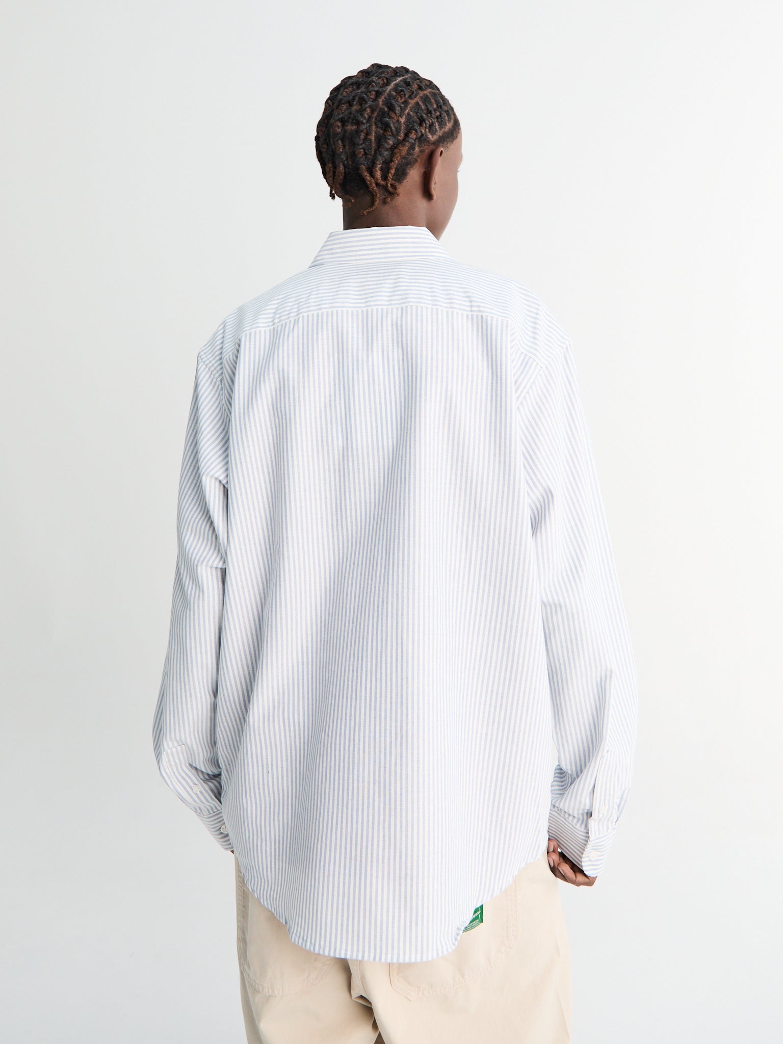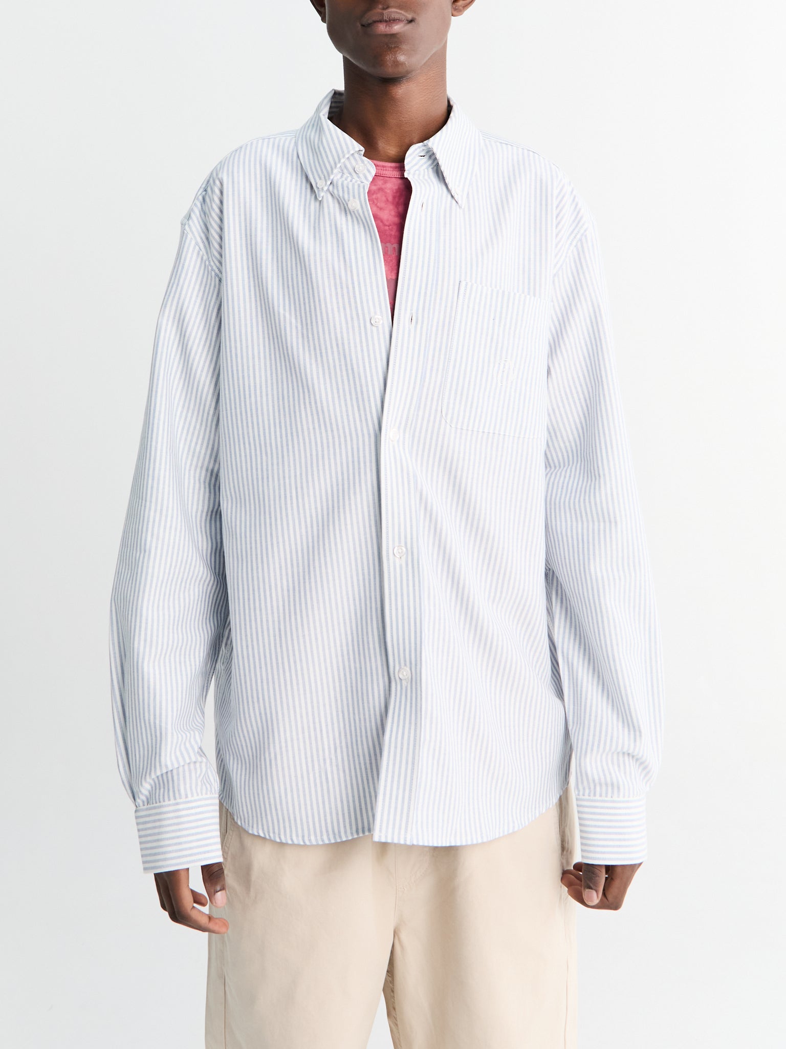 Timeless striped Oxford shirt in crisp white and blue tones, designed with a traditional collar and practical chest pocket.