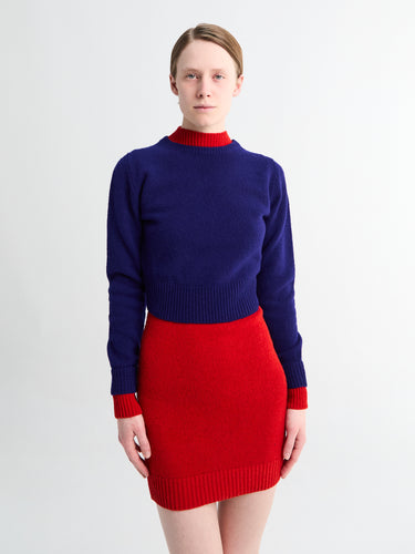 This long-sleeve minidress is defined by an integrated double-layer construction, creating a clean, structural silhouette. The design is finished with a high turtleneck and tailored for a precise fit.