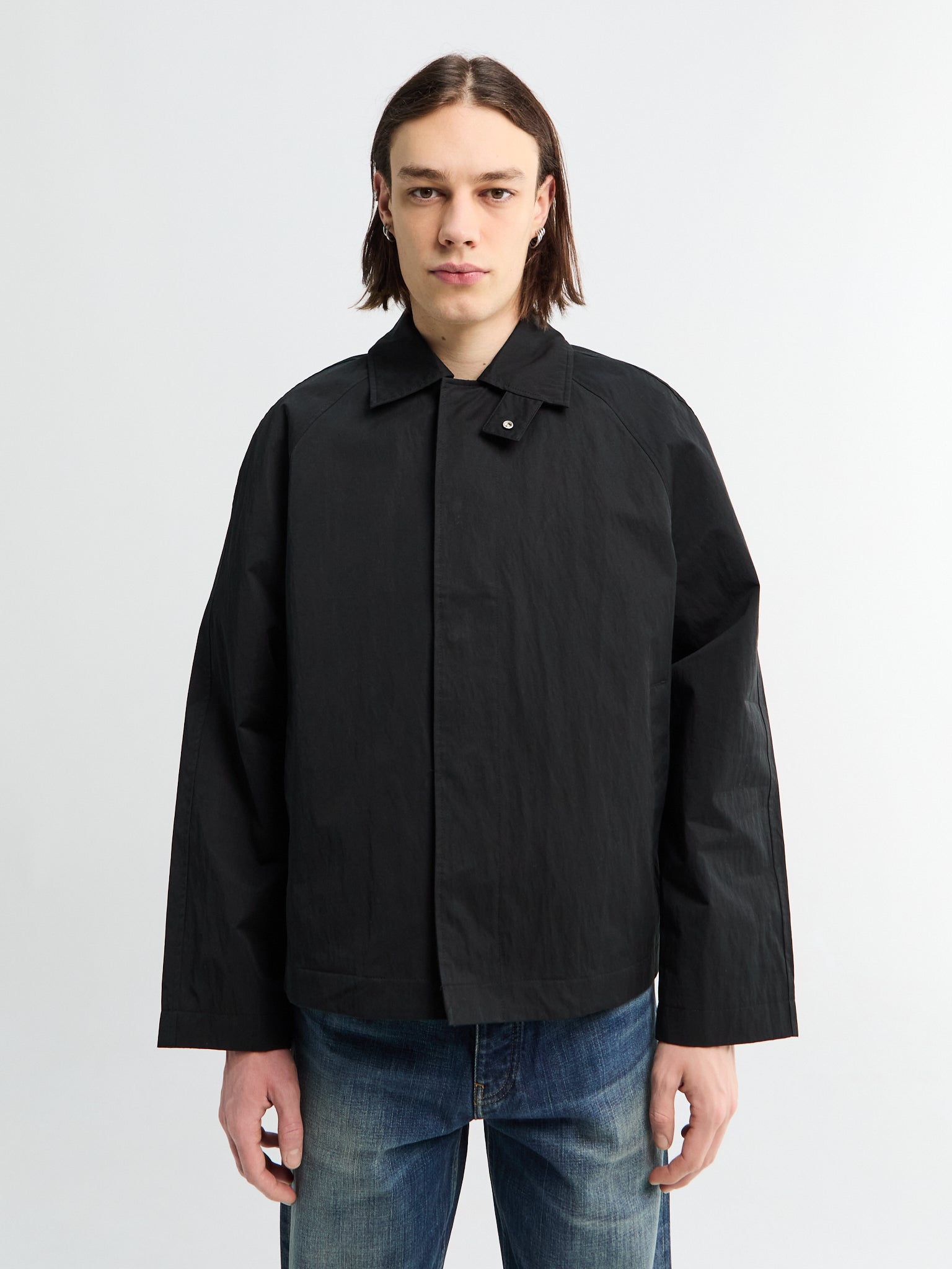 Short Raglan Coat in Black by Sunflower. A cropped trench coat made from cotton blend that protects against wind and rain. Features a collar with buttoned latch, snap button closure, raglan sleeves, and four pockets—two exterior welt pockets and two interior pockets for storage.