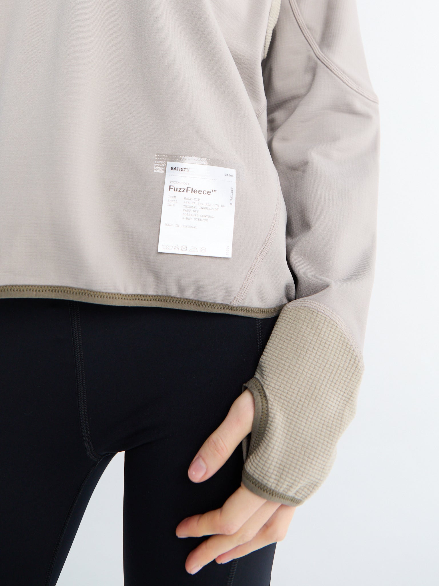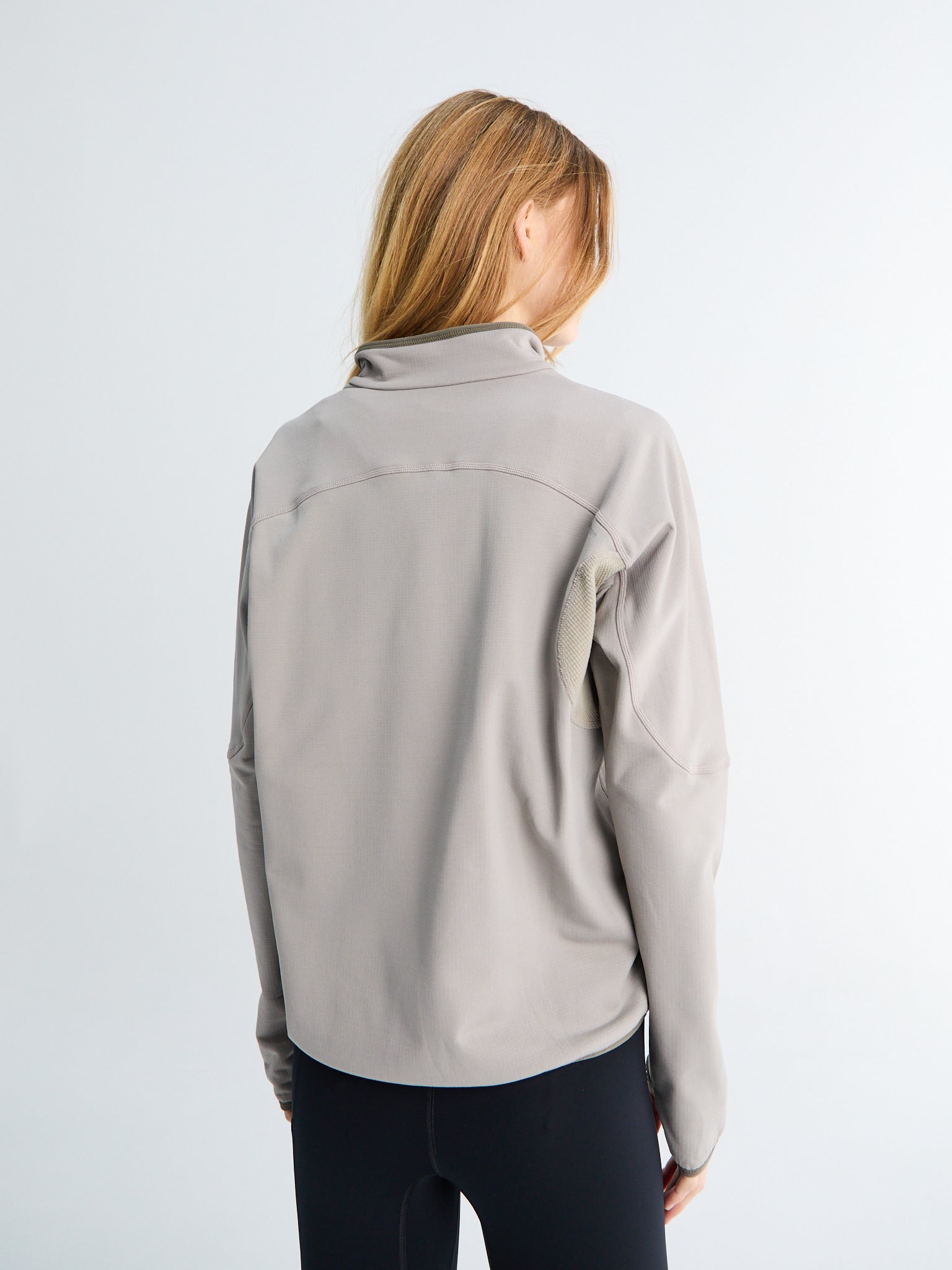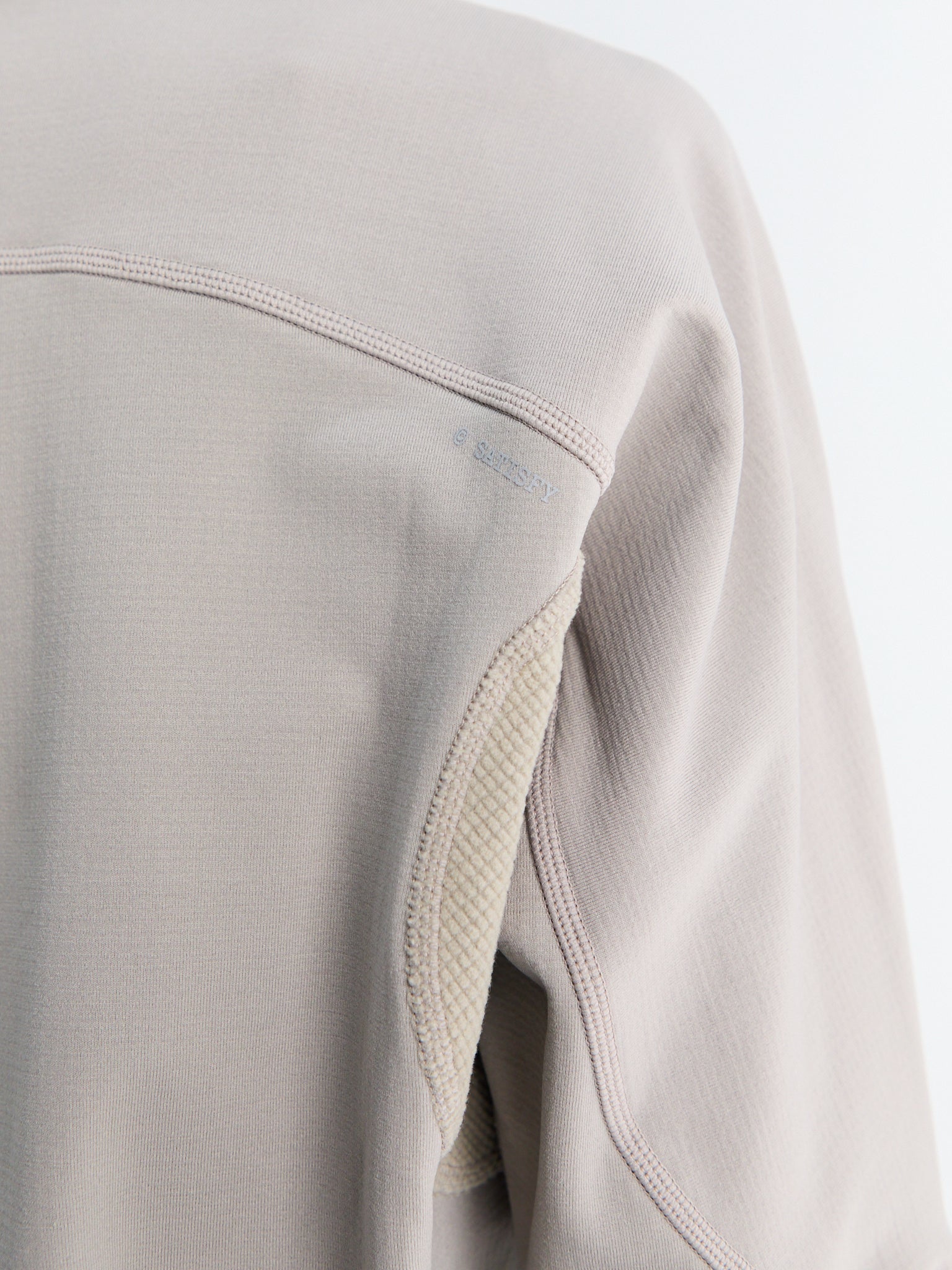 This half-zip sweatshirt combines Polartec® Alpha® Direct with FuzzFleece™ active insulation for runners. The lofted fiber construction traps warmth while the breathable mesh core allows movement and airflow. Lightweight and designed for motion