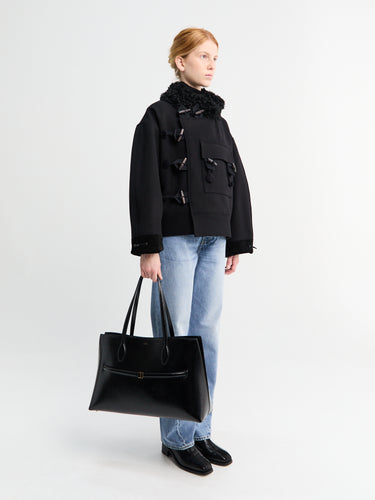The Naplack Lounge Tote Bag in Black features textured palmellato leather with tonal blanket stitching and gold-tone hardware. It has an open top with an internal clasp closure, an internal slip pocket. Natural variations in the leather make each bag unique