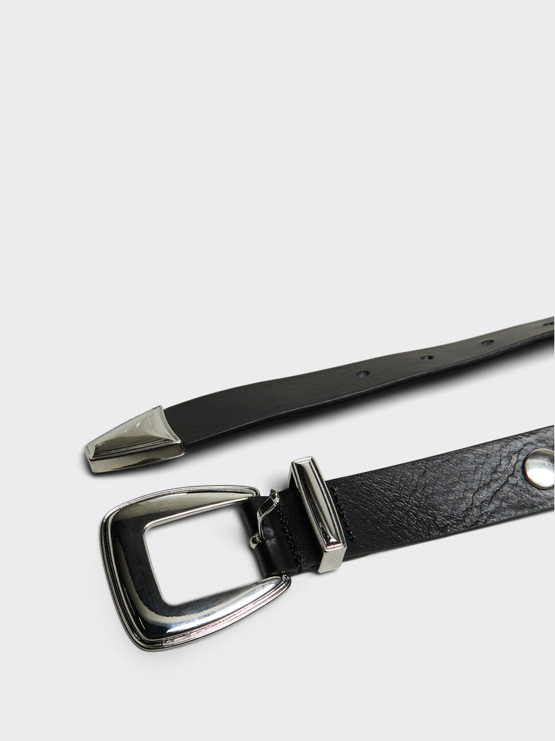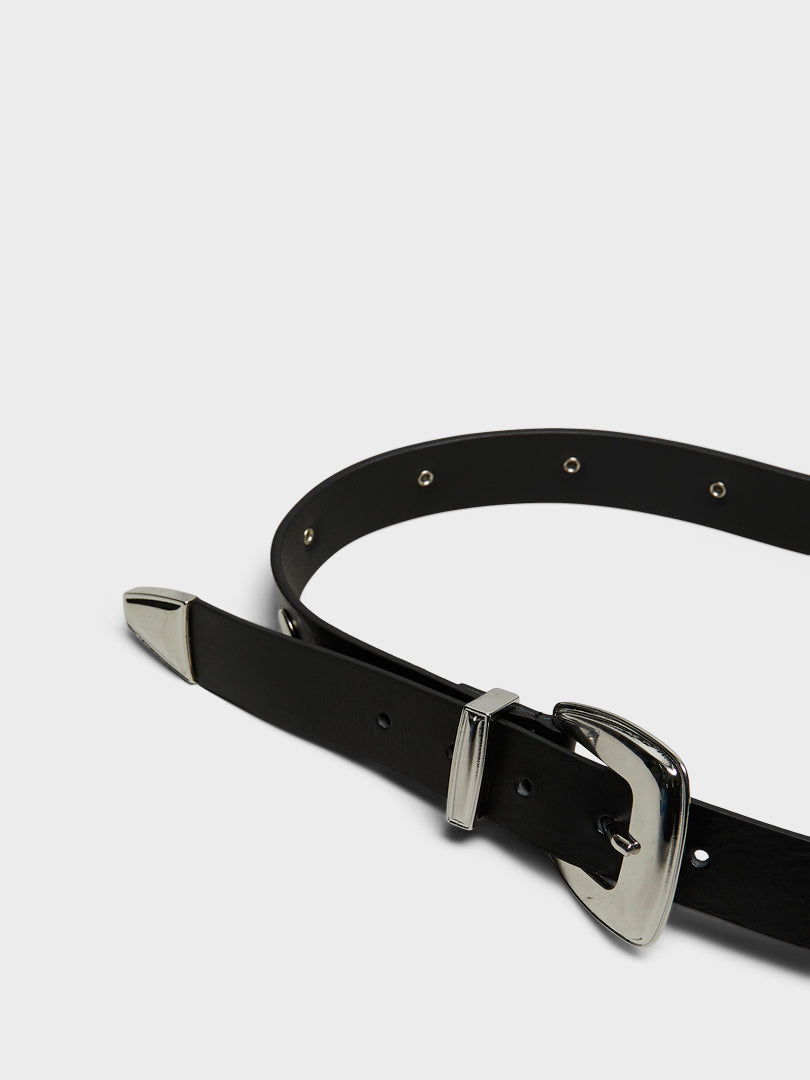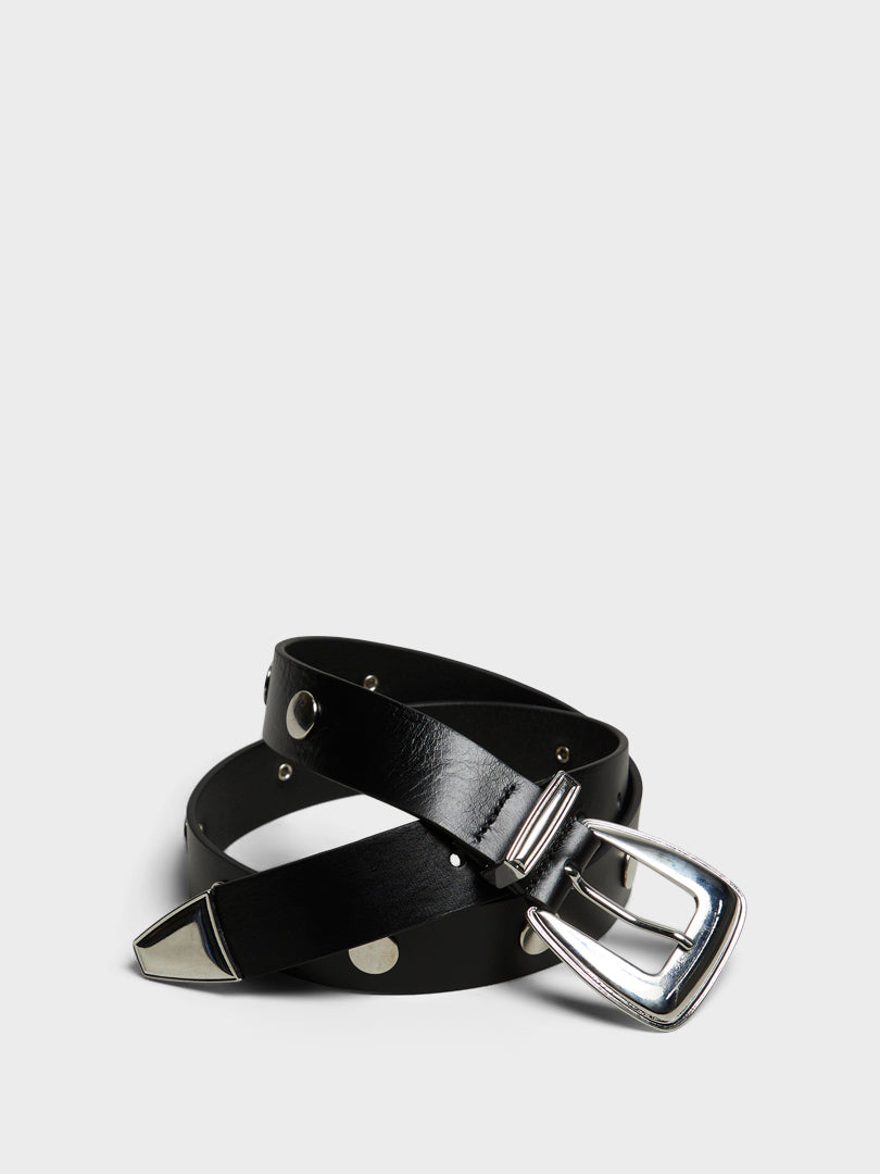 Dette bælte er fremstillet i glat læder, dekoreret med sølvfarvede nitter hele vejen rundt og afsluttet med et sølvfarvet spænde.