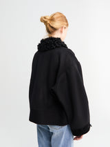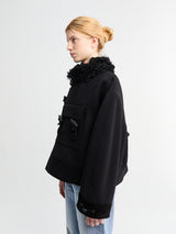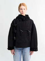 Hainsworth Wool Officer Jacket i sort er lavet af 100% merinould fra det anerkendte britiske væveri Hainsworth. Jakken er designet i klassisk officersstil med skrå lukning, rummelige lommer og en krave i ægte lammeskind. Den tunge uld giver varme og holdbarhed