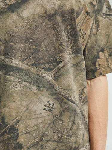 Denne Realtree T-shirt har en oversized pasform. Den er detaljeret med dæksømme i halsudskæringen og fine enkeltsyninger ved skuldrene. Stoffet er ægte Realtree APX-camouflage, som er kraftigt vasket og behandlet for at opnå et autentisk vintage-falmet look.