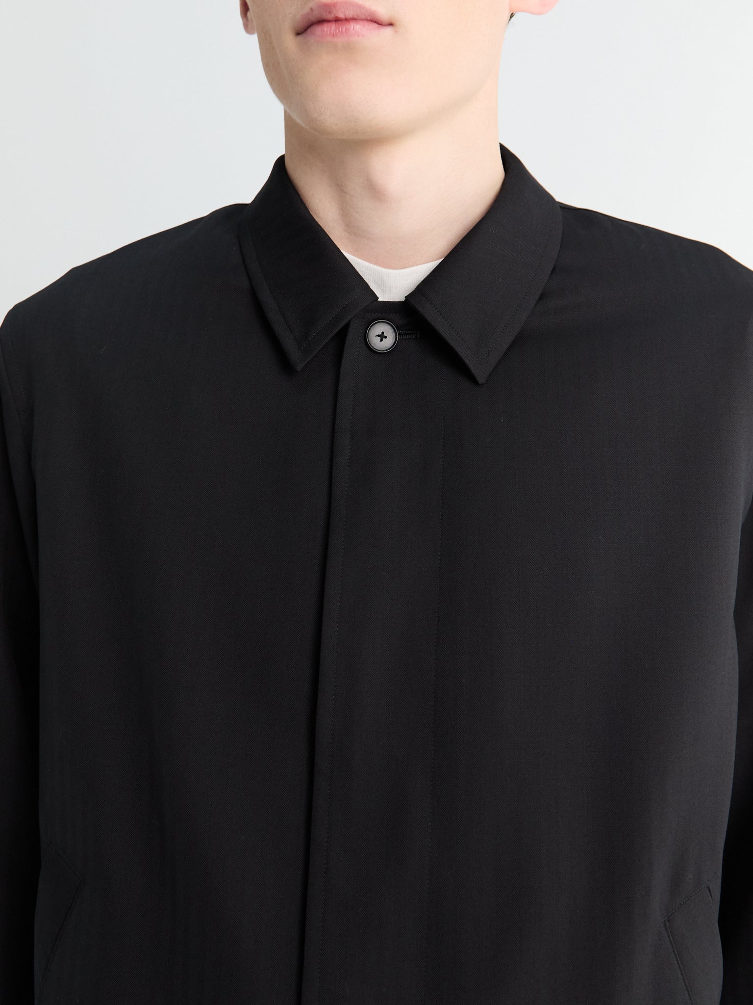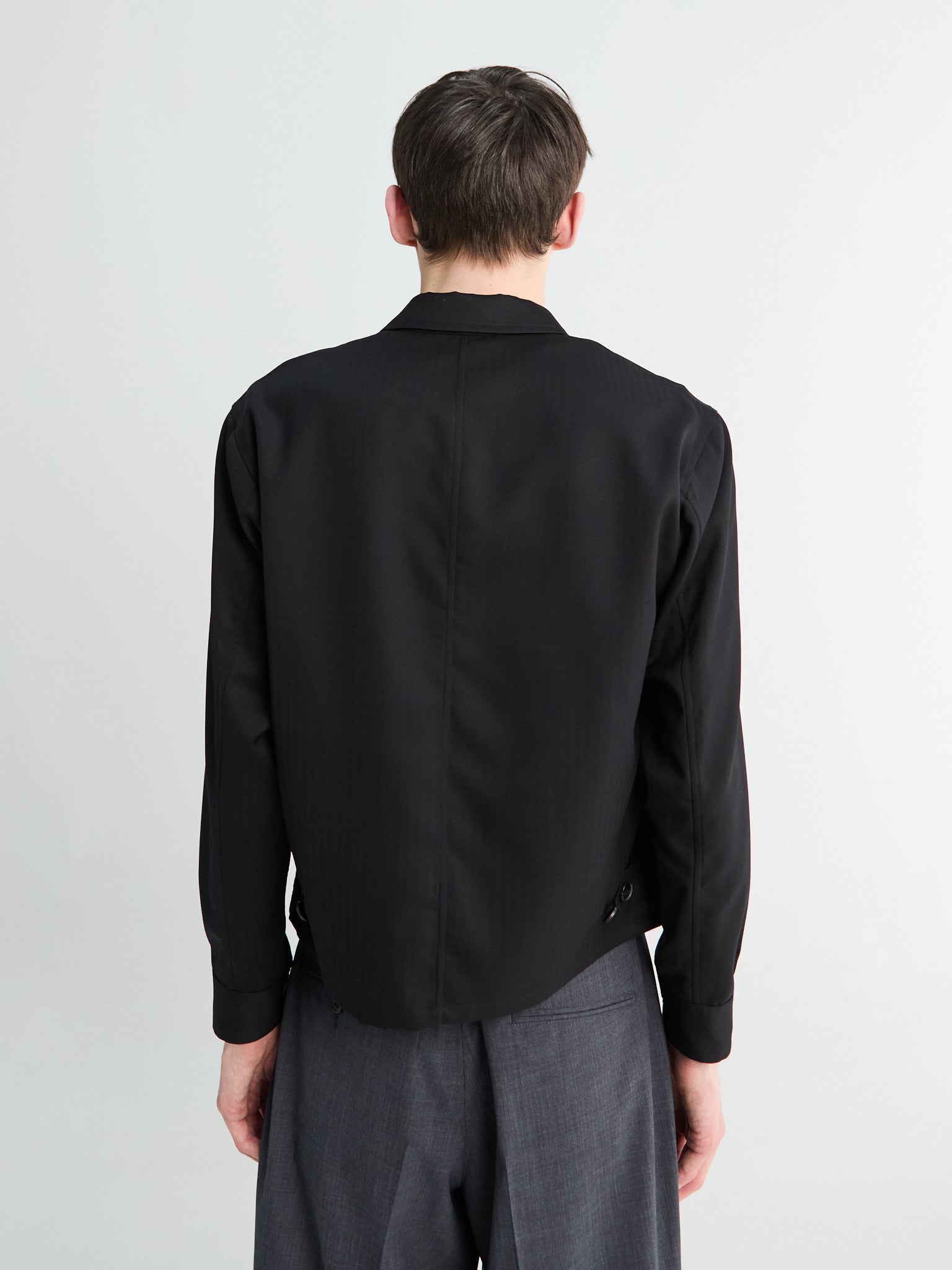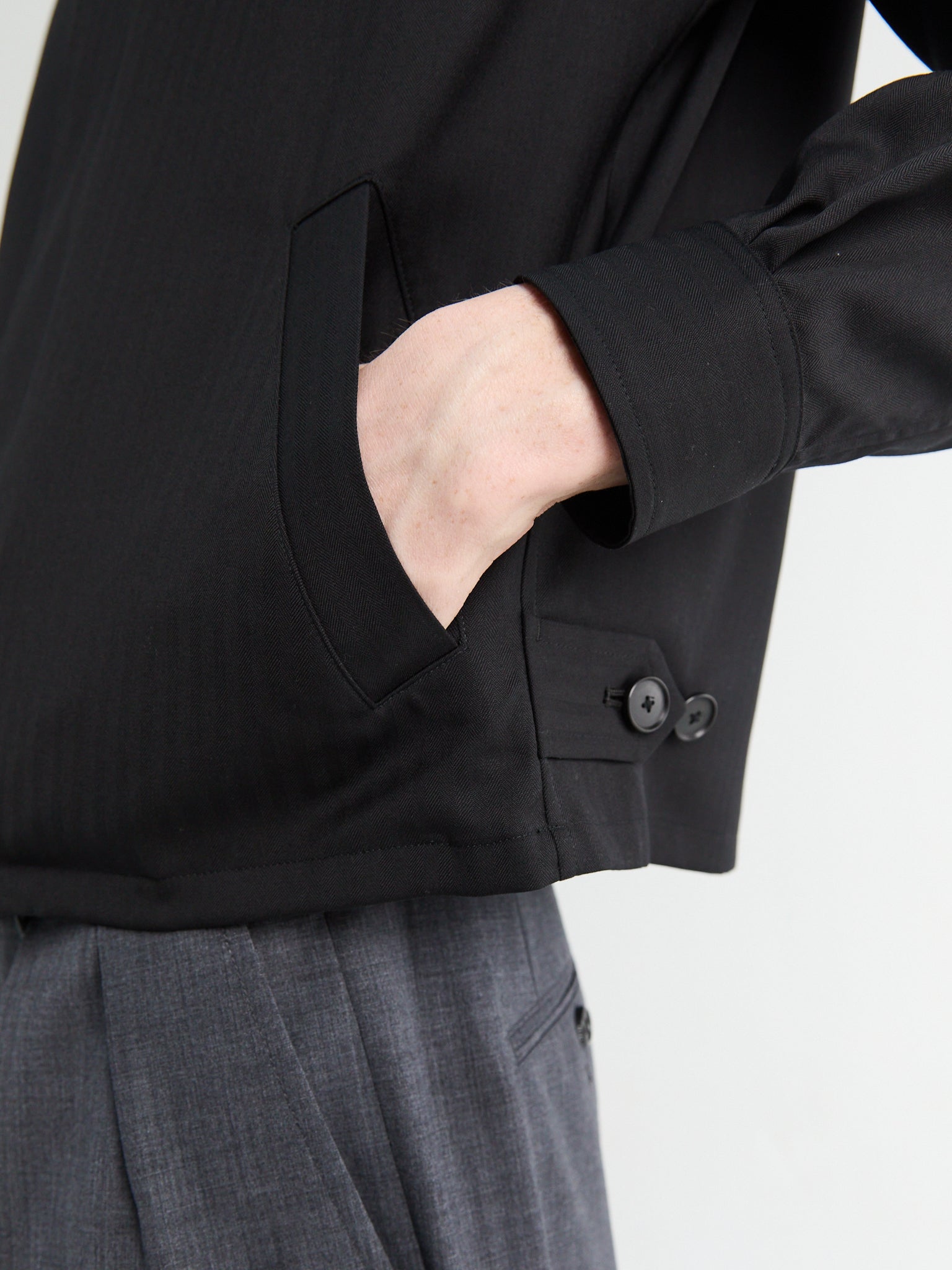 Denne blouson er fremstillet af et specialfremstillet uld-sildebensstof, vævet for en blød følelse og et diskret, tekstureret fald, og tilbyder en afslappet, let cropped silhuet. Jakken er afsluttet med en ren skjult knaplukning og diskrete sidelommer.
