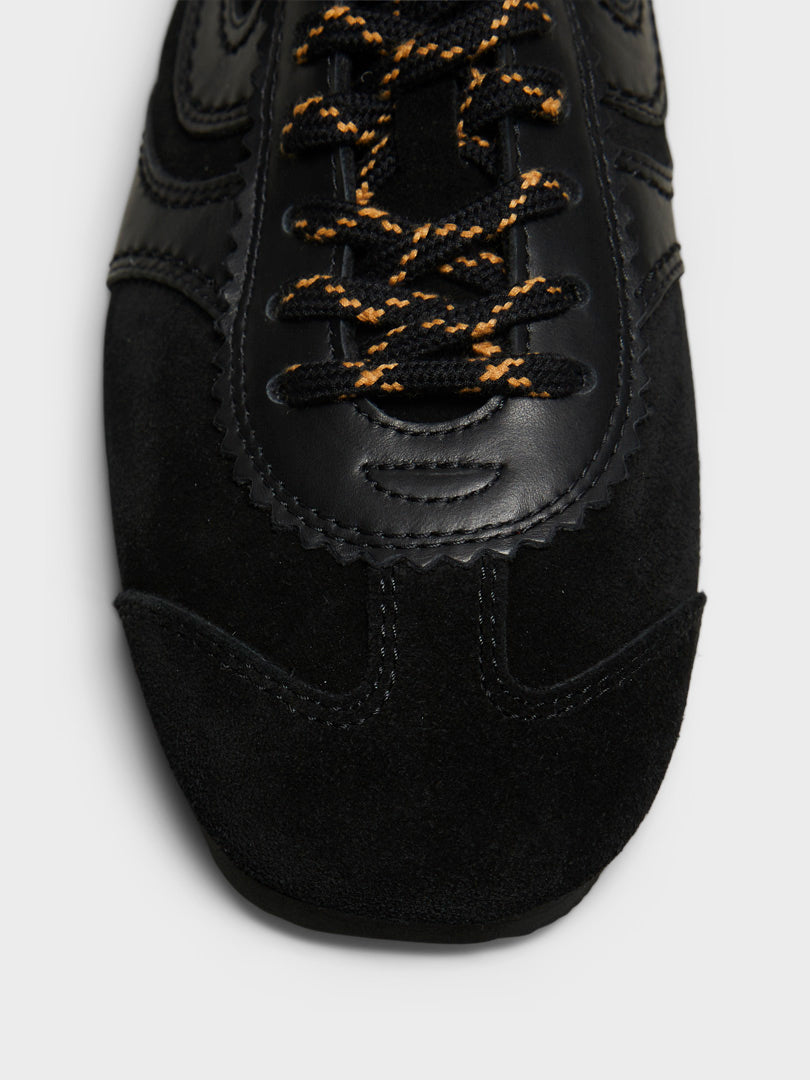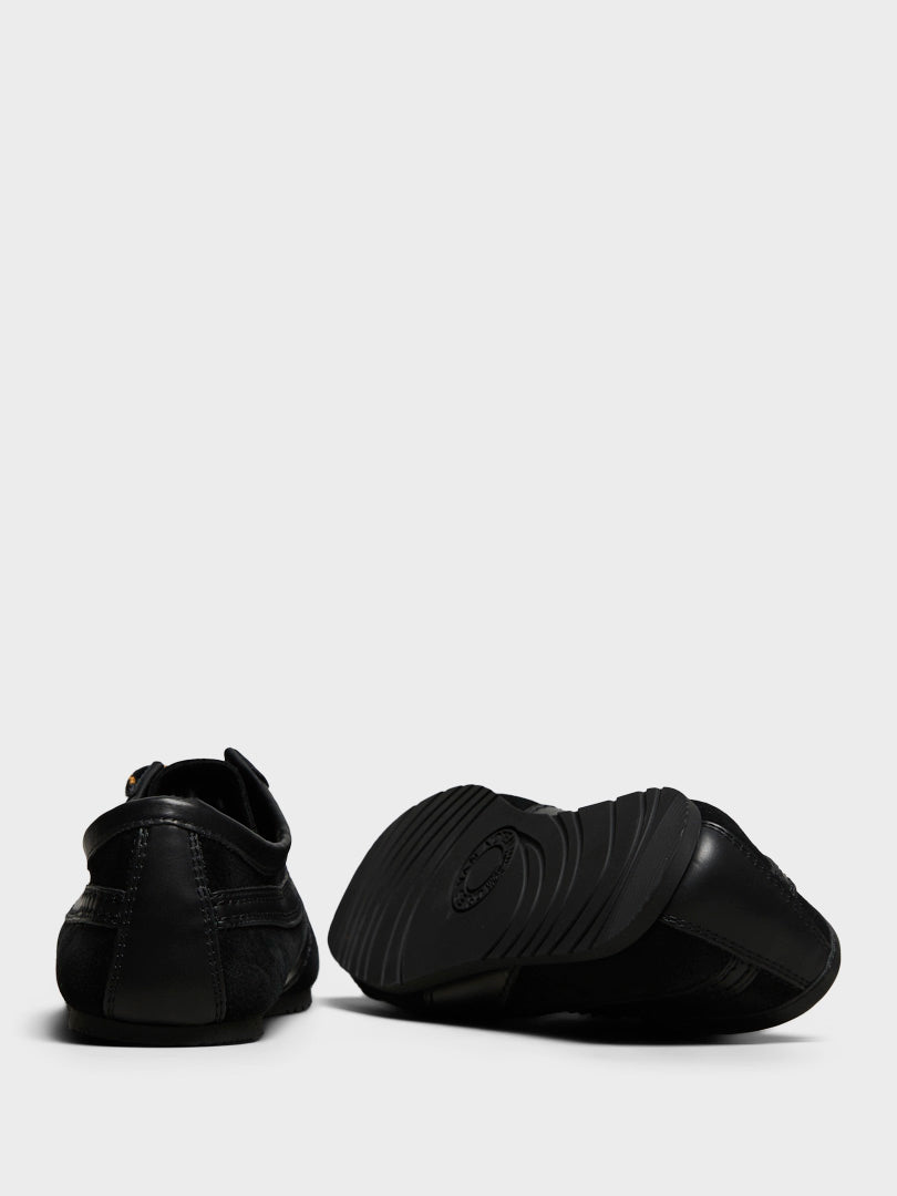 Dries Van Noten retro-inspirerede sneakers med et raffineret twist. Skoene er fremstillet i blødt sort ruskind med bølgede læderkanter og balancerer sporty lethed med sofistikerede detaljer.