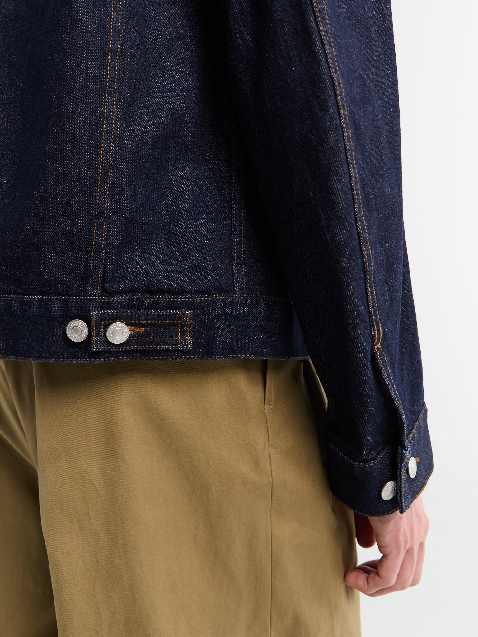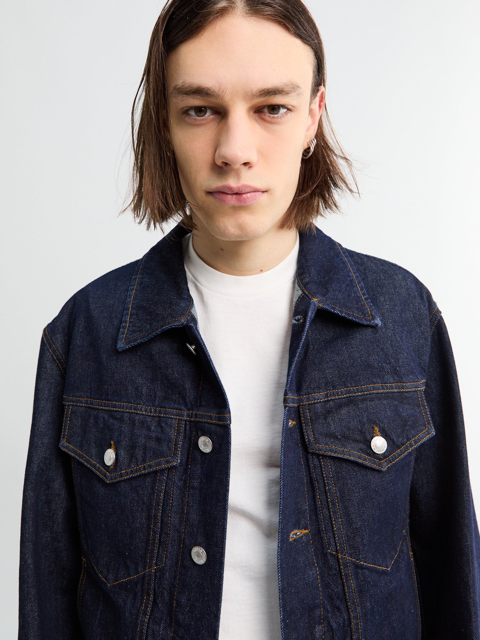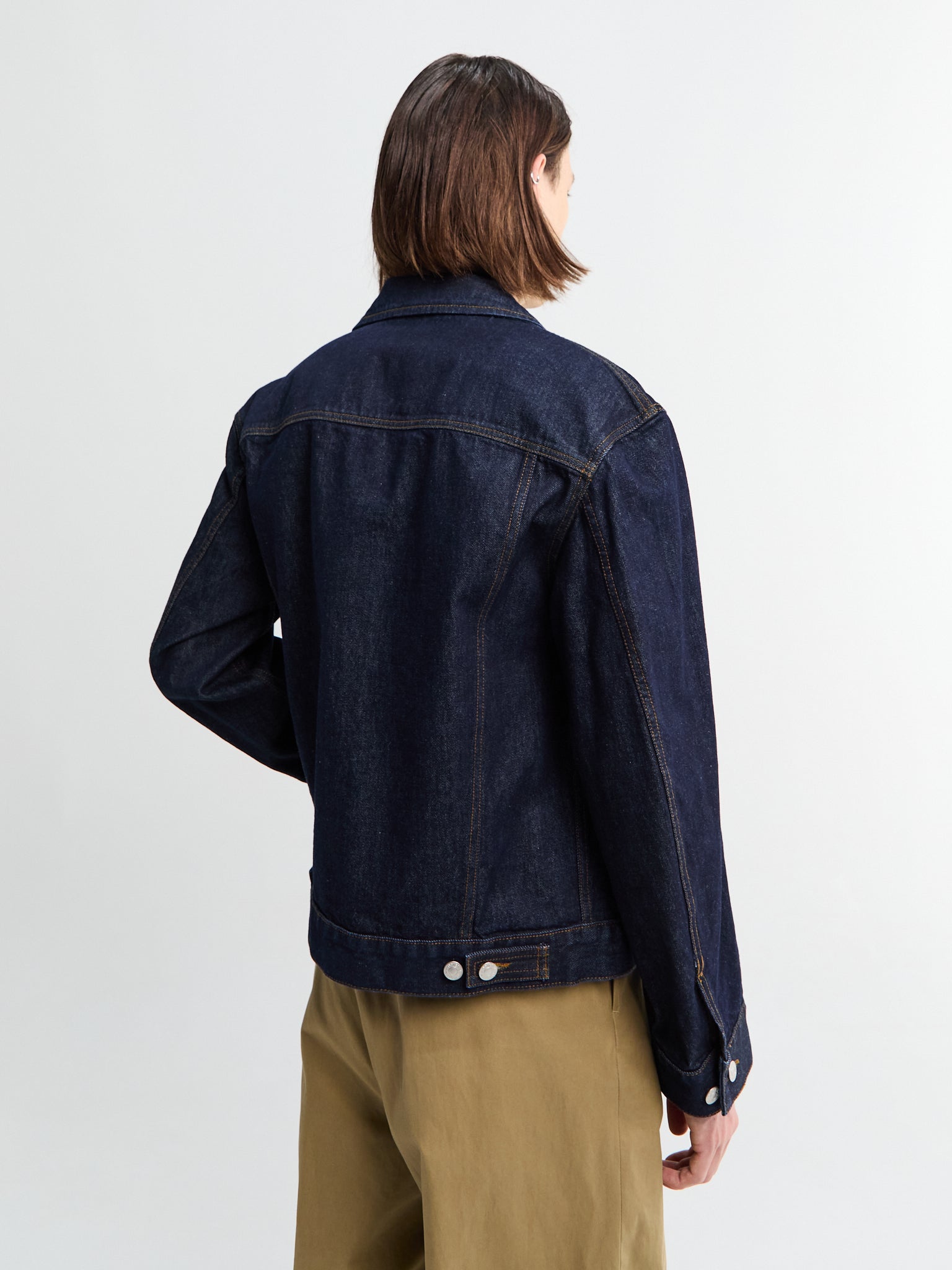 Klassisk denimjakke i dyb indigo med knaplukning, spread-krave og praktiske bryst- og taljelommer.
