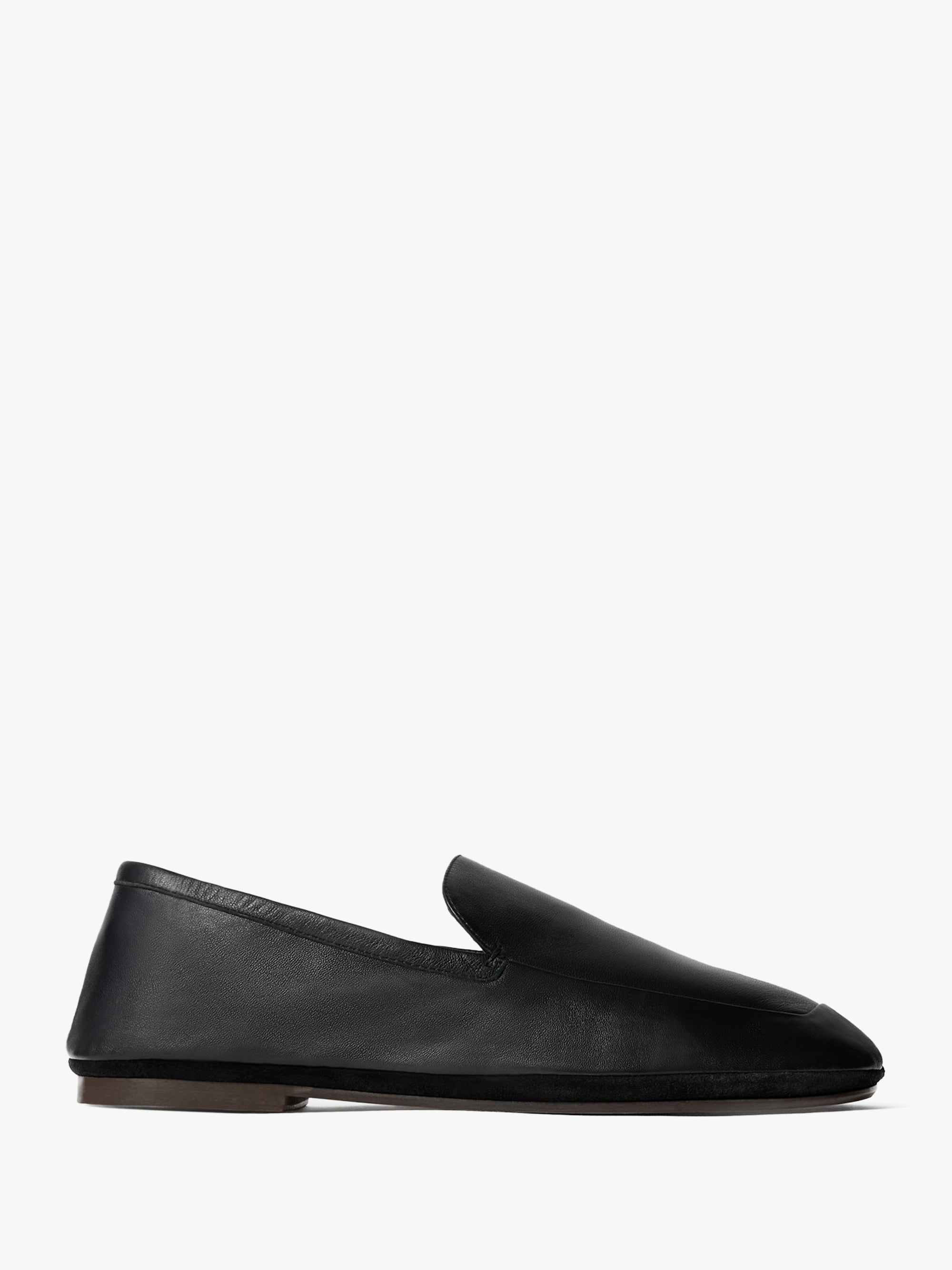 Sorte udendørs tøfler i blødt nappa lammeskind med slip-on design, afrundet firkantet tå og forstærket læderydersål med gummipuder for holdbarhed og greb.
