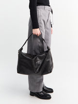 Denne skuldertaske er fremstillet af tyndt, glansfuldt læder i en dyb brun nuance og tager inspiration fra det klassiske hobo-design, kombineret med en rem i canvas. Tasken har en indvendig lomme og en sidekrog til fastgørelse af dekorative charms.