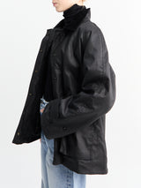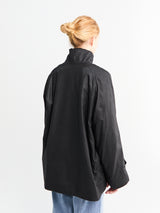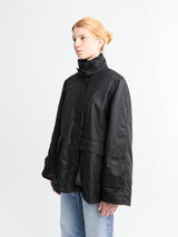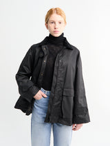 Sort oilskin jakke lavet af slidstærk bomuld med en varm uldforing. Den har en klassisk krave i bomuldsfløjl, skjult lynlås- og knaplukning, forlommer samt stropdetaljer på ærmerne