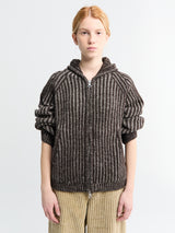 Denne sweater har et stribet ribstrikket design med raglanærmer, en tovejslynlås og en påsyet lomme. Det er færdiggjort med ribkanter ved ærmer og forneden, en lige kant og en afslappet, boxy pasform.