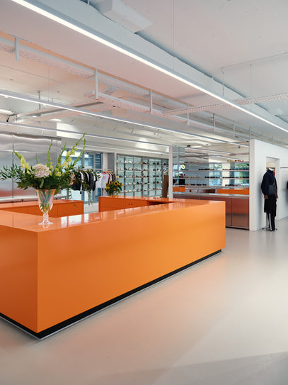before, the space marks a new presence. Every detail — material, sound, flow — has been