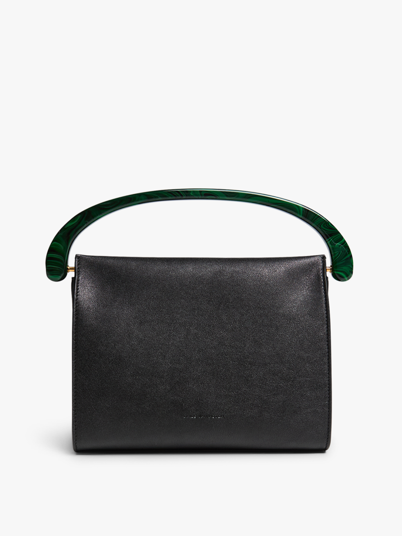 Denne mellemstore taske er fremstillet af glat læder, har et karakteristisk harpikshåndtag og leveres med en aftagelig rem for alsidige bæremuligheder.