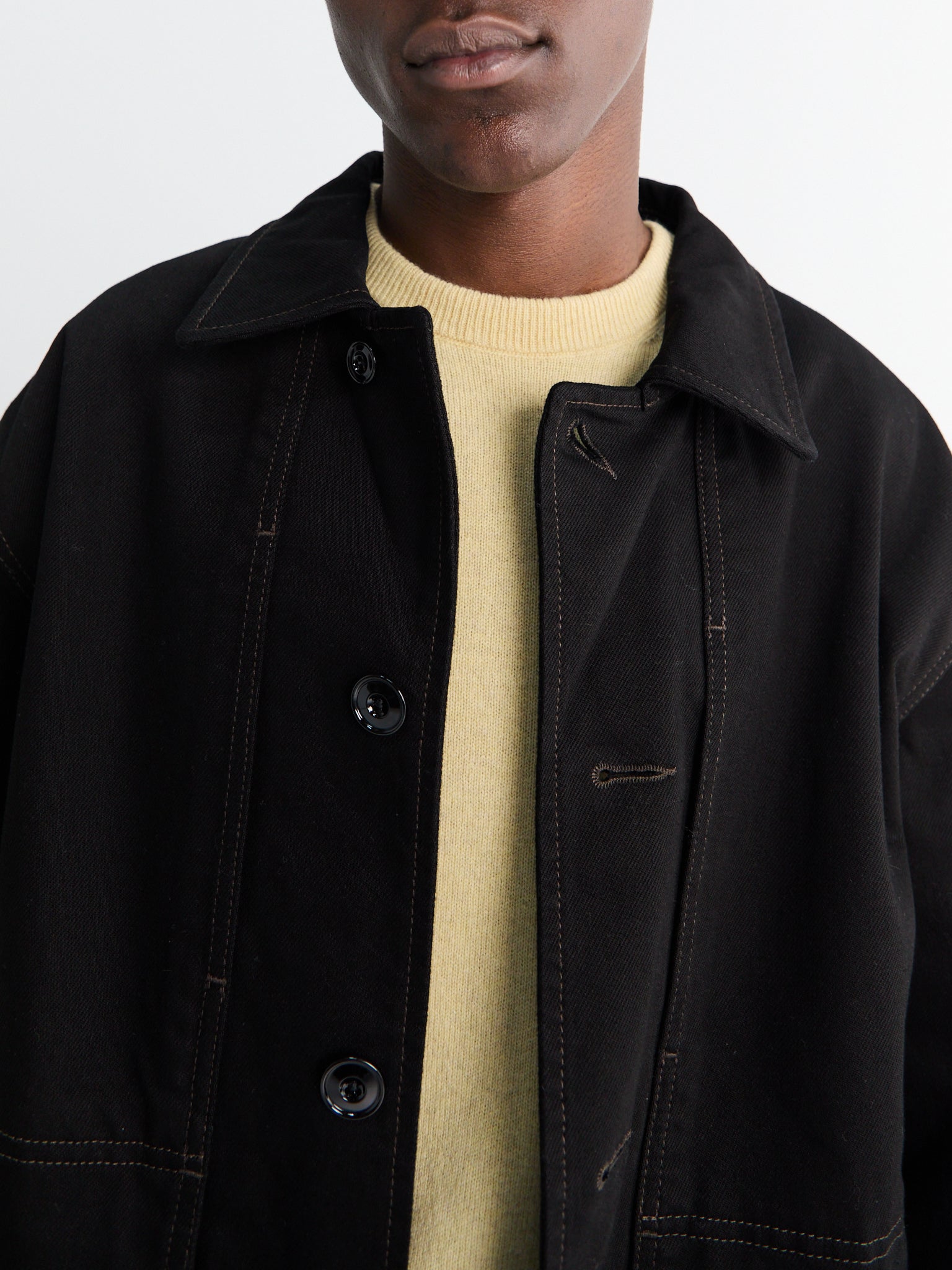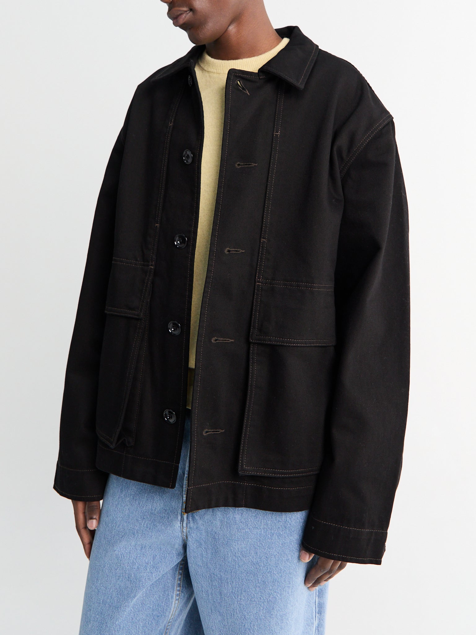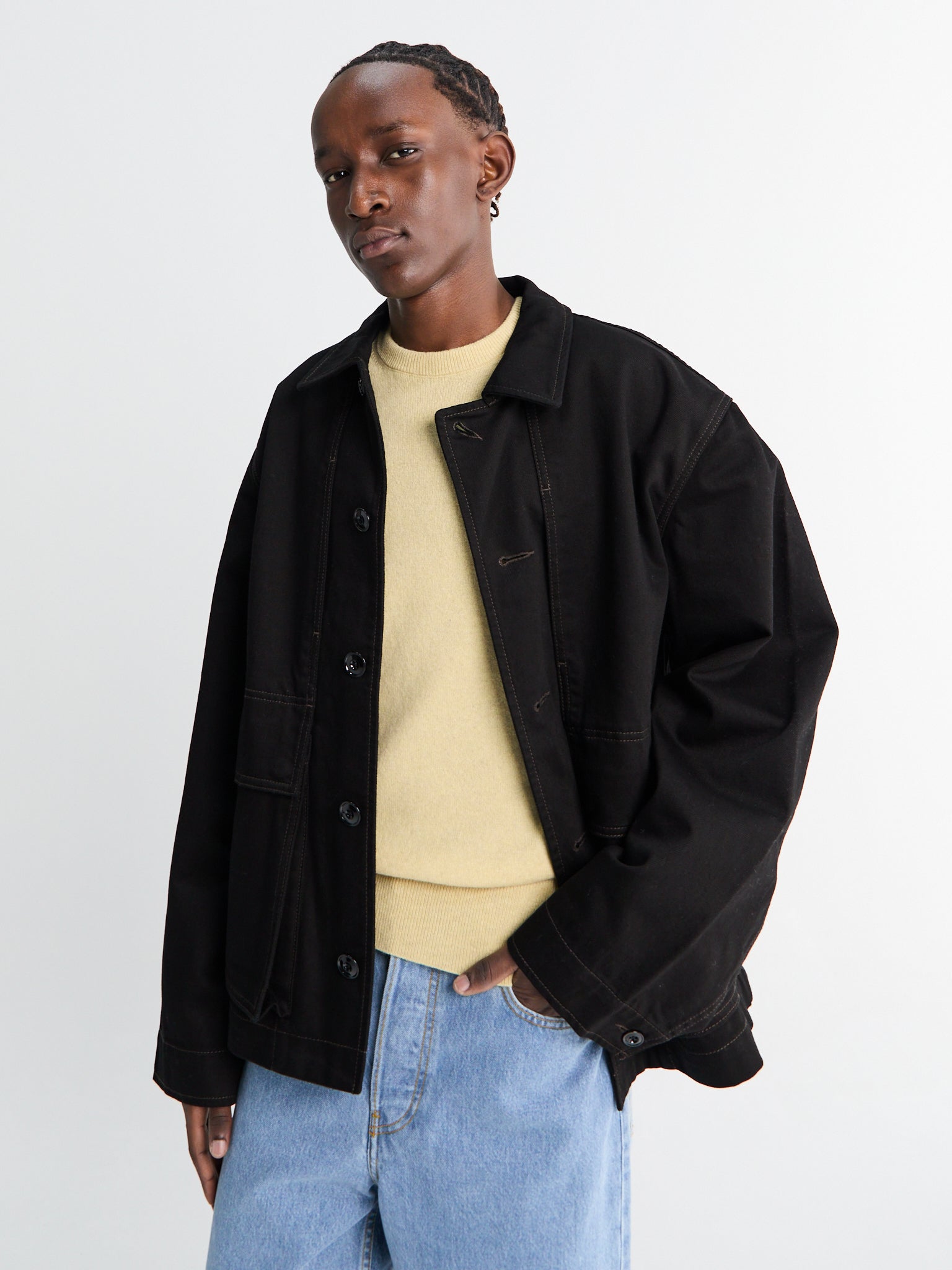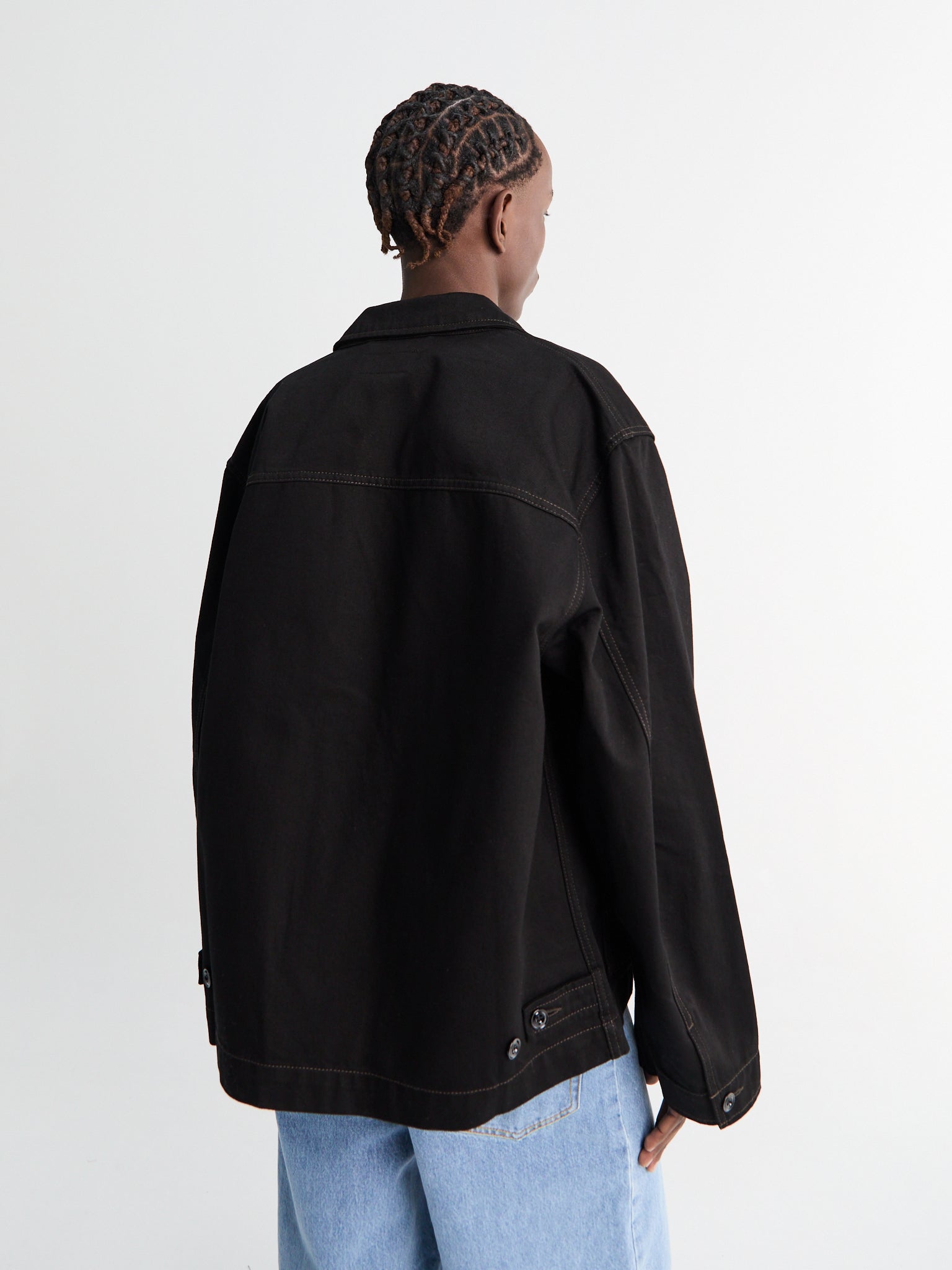 En denimjakke med afslappet pasform i sort, med en tidløs krave, forstærkede syninger og dobbelte frontlommer for hverdagsfunktionalitet. Den boxy silhuet giver alsidig lag-på-lag-stylings muligheder.