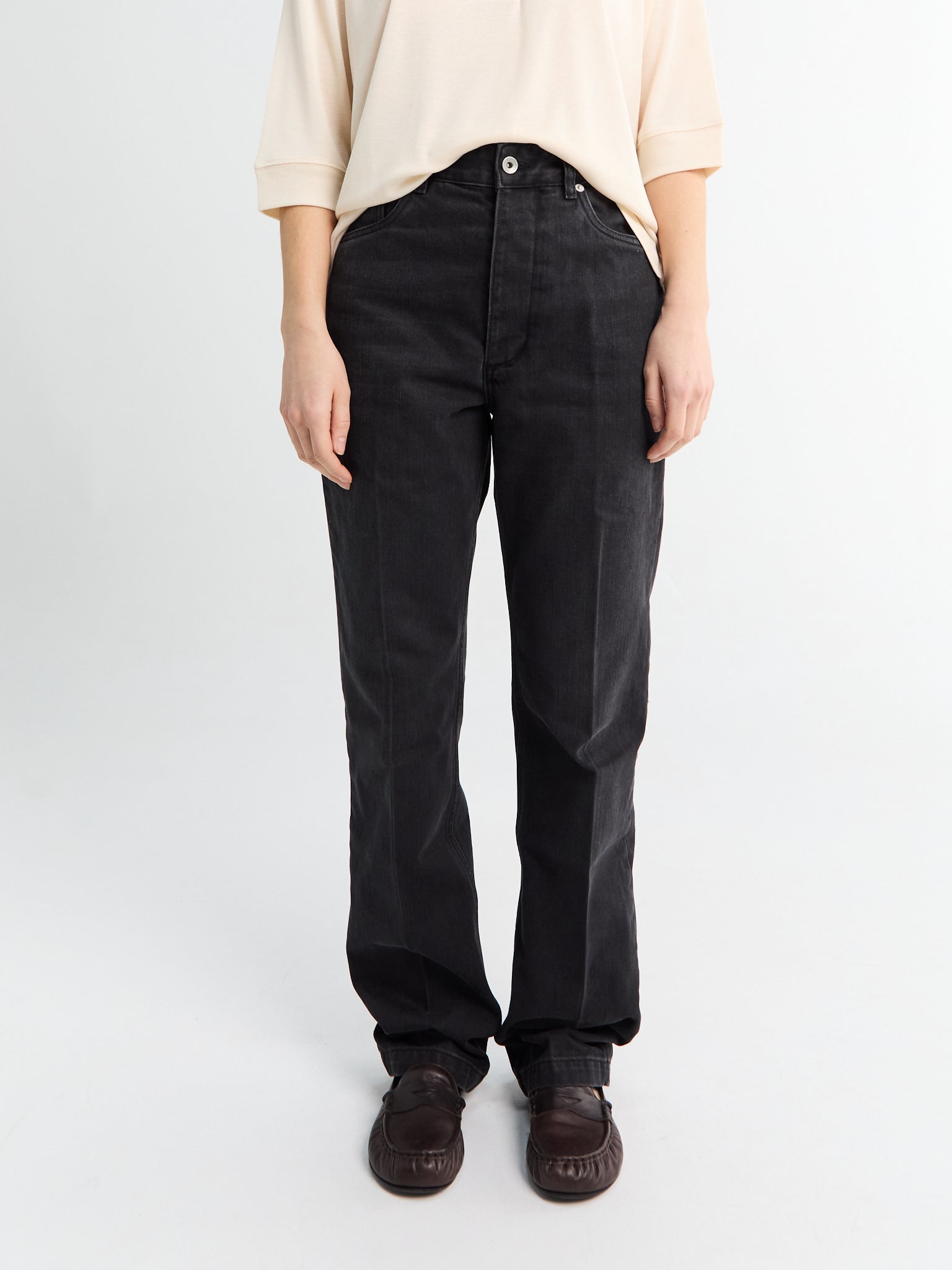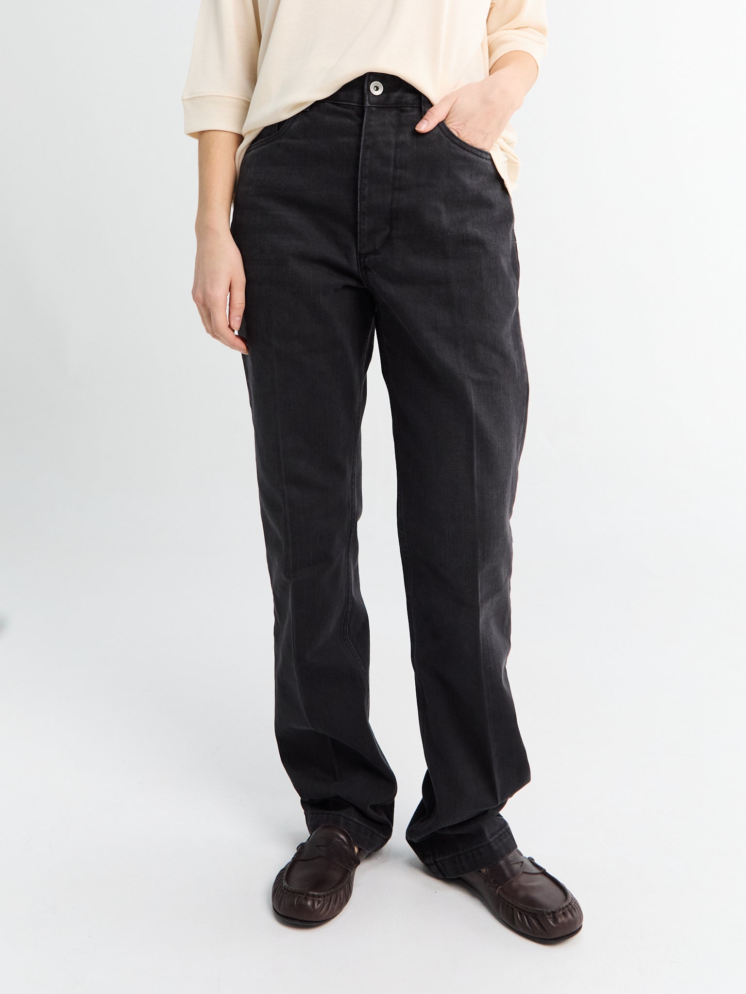 Disse jeans er fremstillet af struktureret denim med en falmet sort vask og er skåret i en ren, lige silhuet. Markante firkantede frontlommer definerer designet og skaber en præcis og arkitektonisk linje fra hofte til søm.