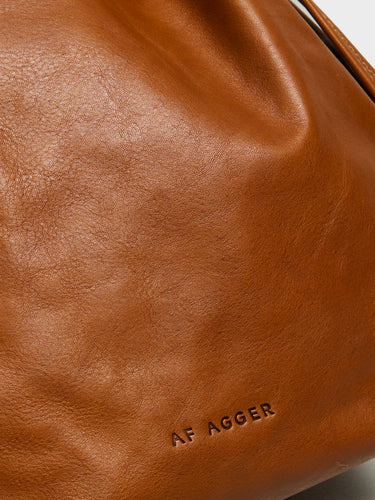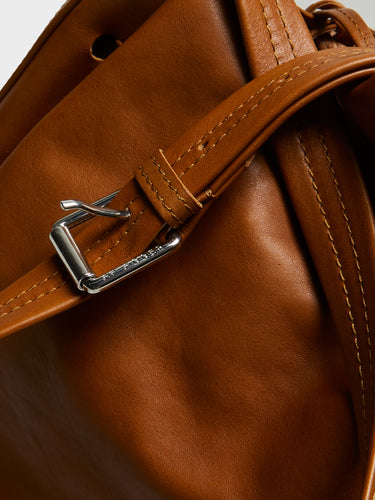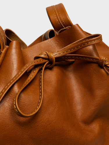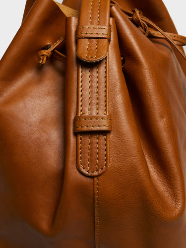 This bucket bag is made from high-quality Italian Pontremolesi leather. It features a tie detail and an adjustable shoulder strap with a silver buckle. The bag also has a discreet embossed logo located on the lower front.