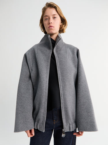 The Garret Jacket features a stand collar, bold, clean lines, and wide sculptural sleeves crafted from Italian double-faced wool. It includes an elasticated blouson hem and a two-way zipper for added functionality.