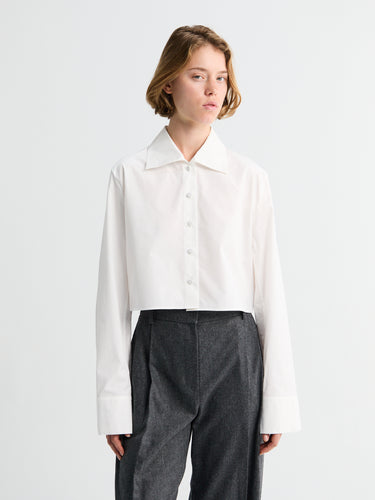 The Jasen Top is a cropped button-up shirt, with a straight and open fit, inspired by outerwear. The shirt features covered buttons and single-button cuffs.