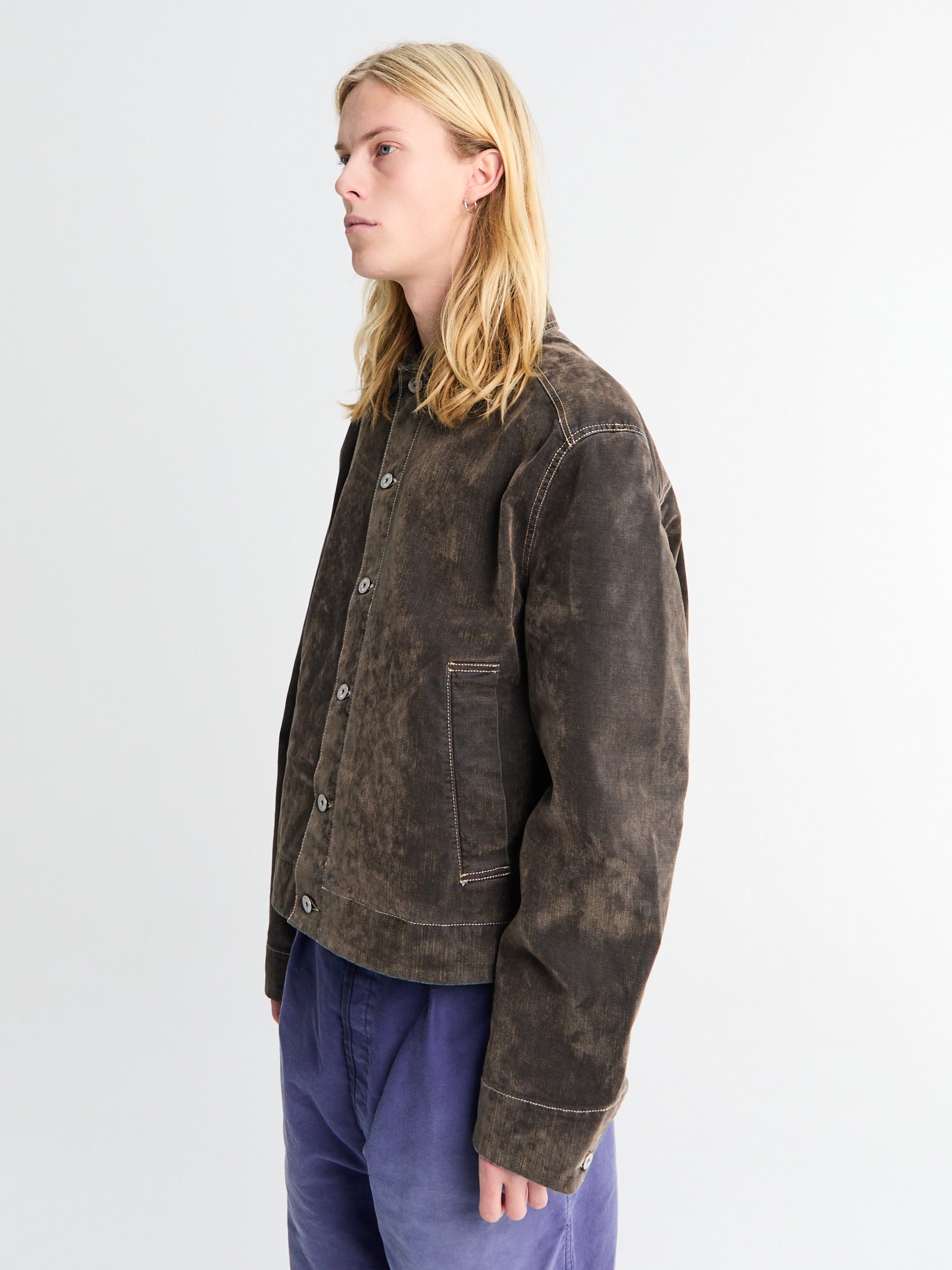 Crafted with a timeless silhouette, this jacket features a classic collar and long sleeves finished with buttoned cuffs. The front button closure and regular fit provide a versatile everyday look, while practical welt pockets keep essentials within reach.