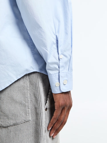 The Convenient Shirt from mfpen has a relaxed fit with drop shoulders and a rounded hem. It features a button placket, spread collar, back yoke pleats, and a divided chest pocket. Made from deadstock cotton poplin fabric.