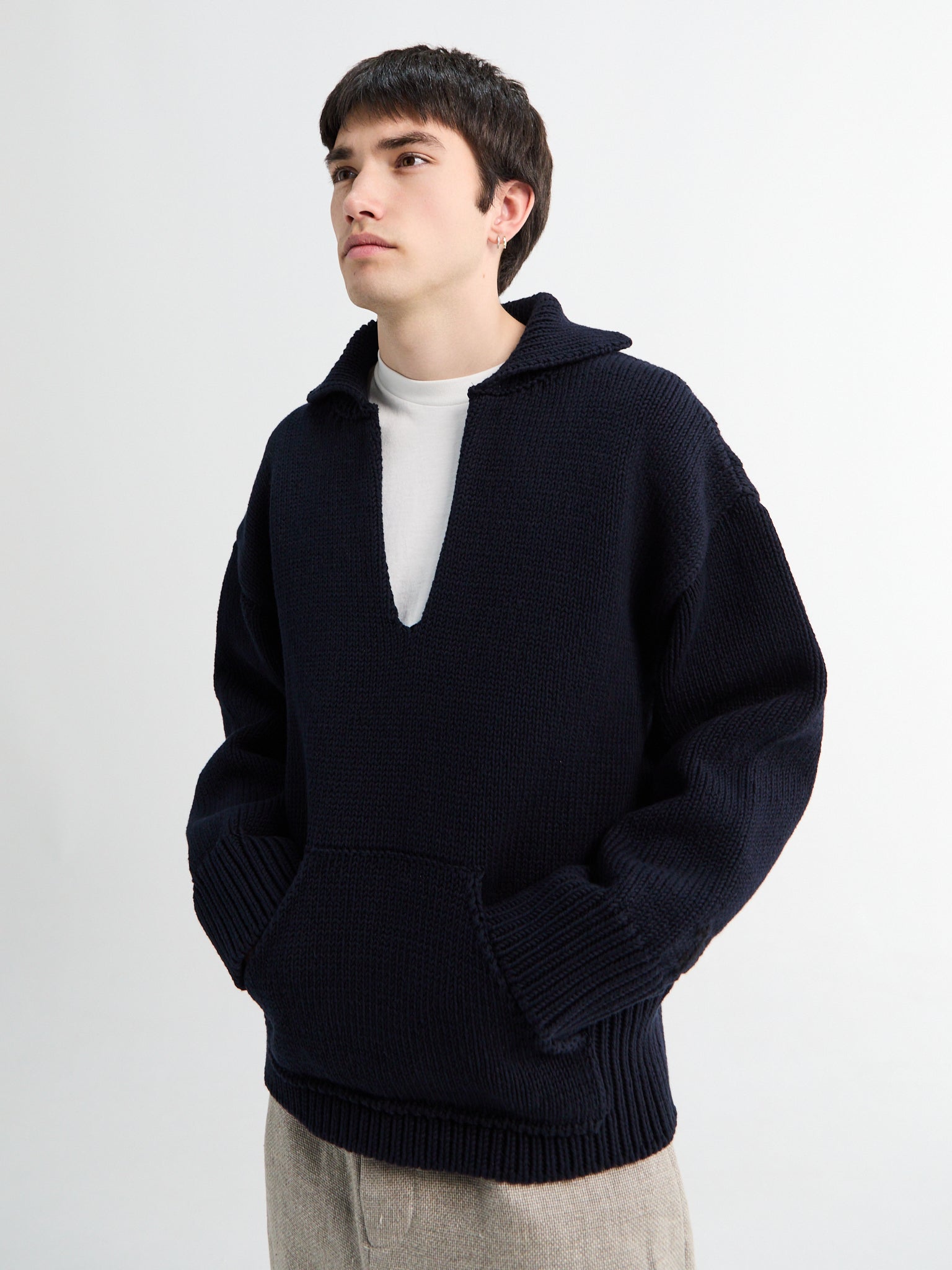 Ivan Chunky Cotton Rib Knit Fisherman Sweater in Midnight Blue