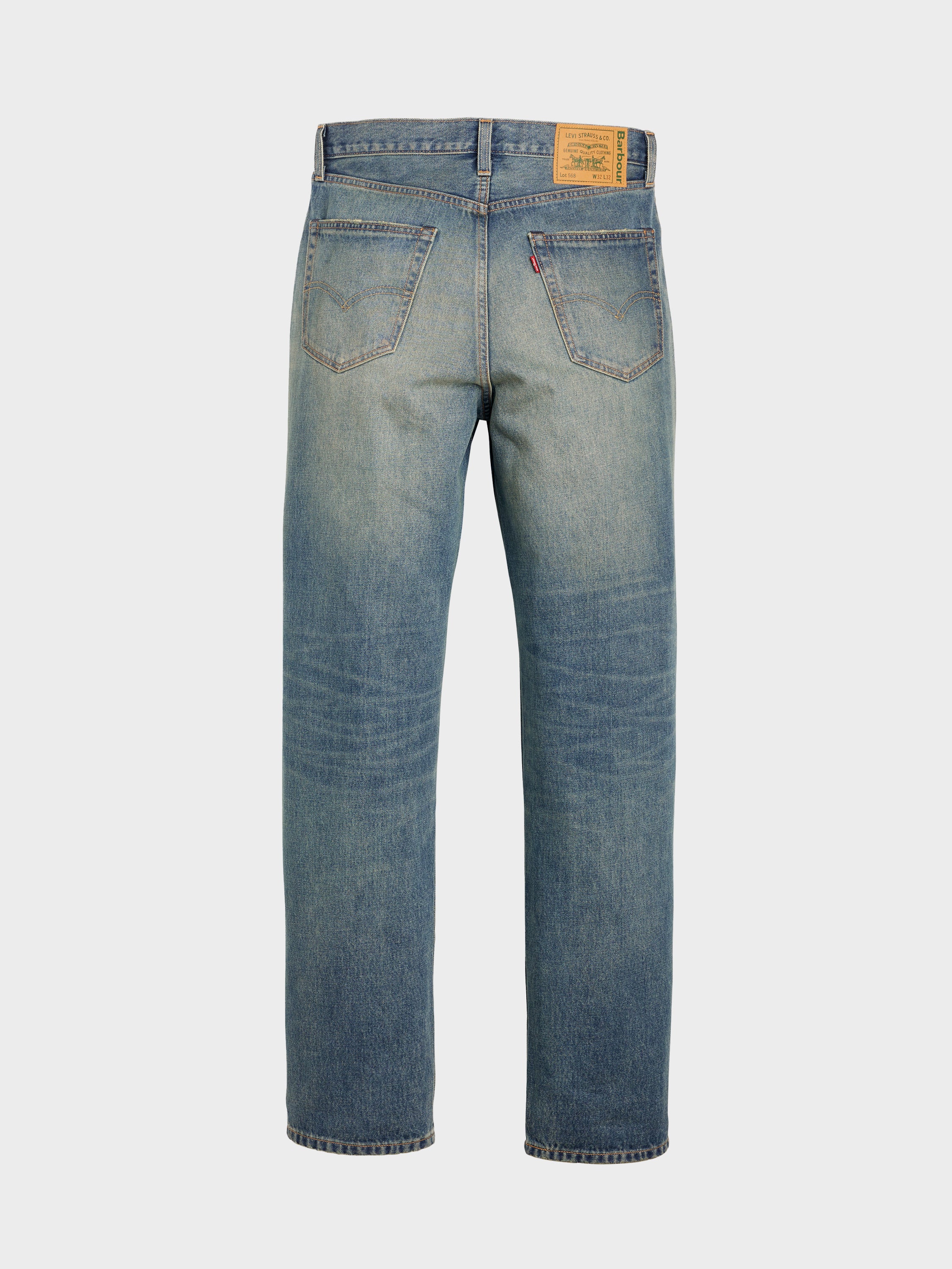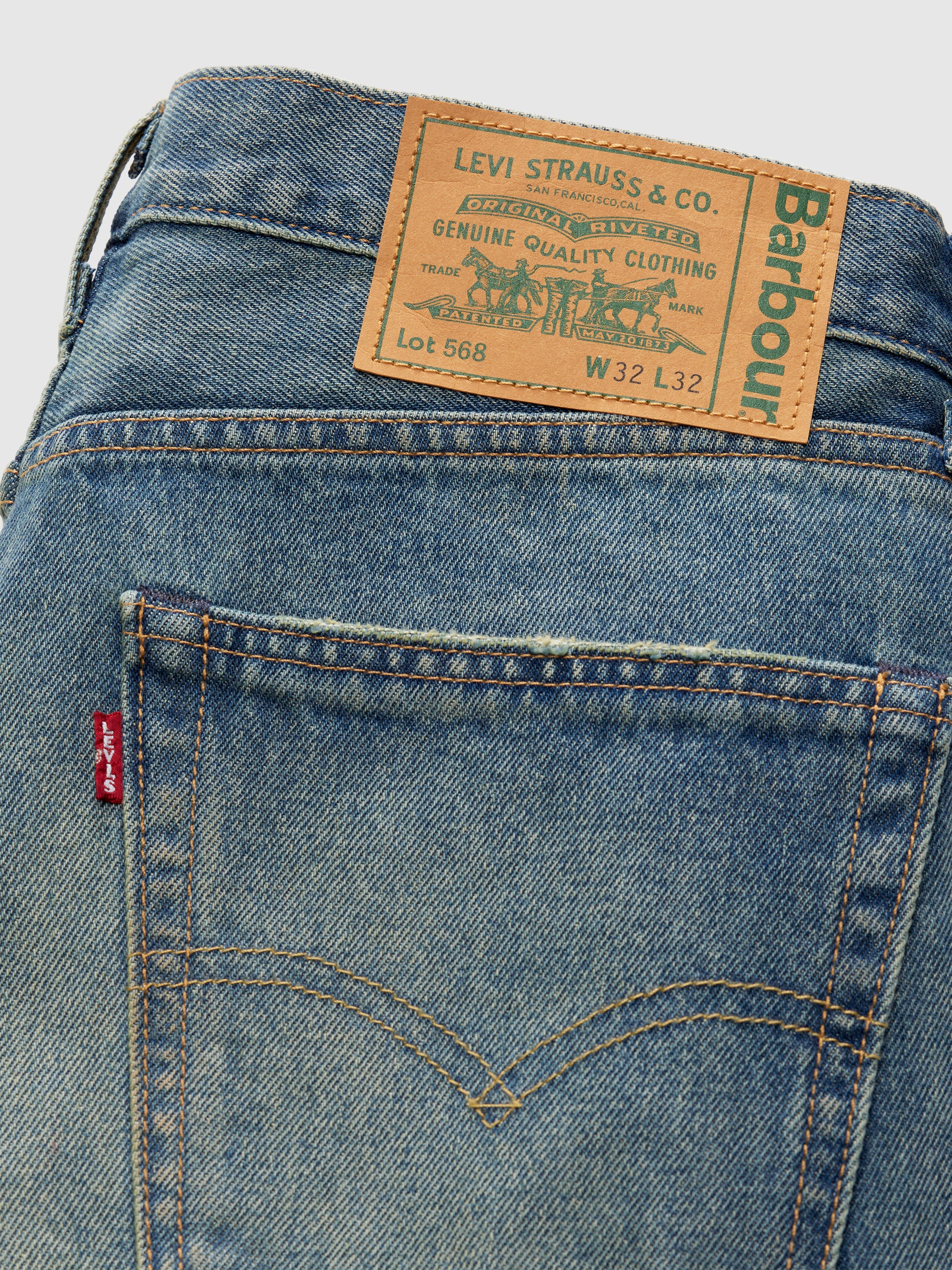 The Barbour x Levi’s 568 Loose Jeans are ‘90s-inspired, relaxed fit in non-stretch, with a subtle “dirty” mid-wash denim. Archival prints on the pockets nod to both brands’ heritage, finished with a co-branded Jacron patch and tartan-bound seams.