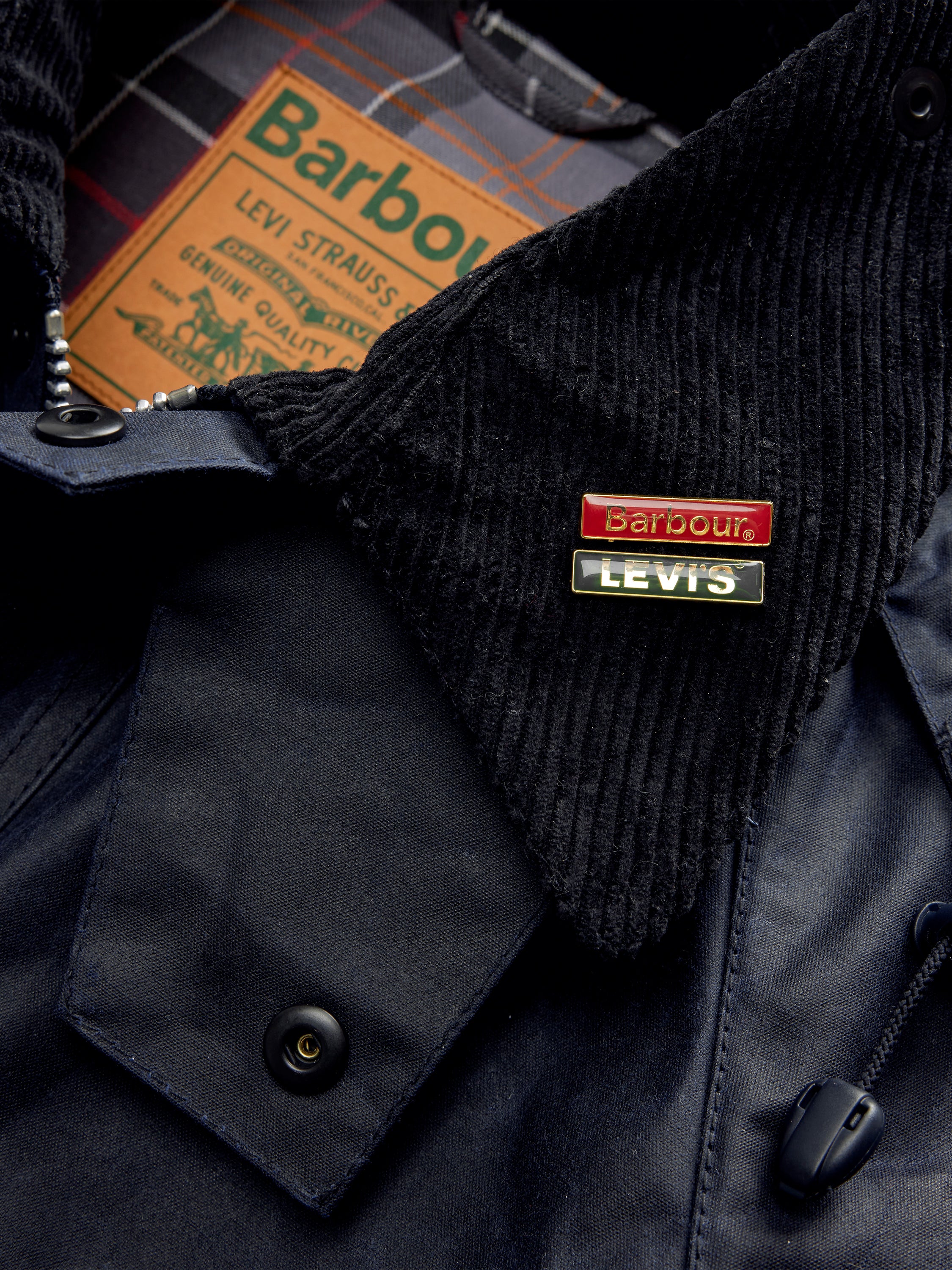 A modern take on Barbour’s iconic Bedale, originally designed in 1980 as an equestrian jacket. This collaboration adds signature Levi’s details — branded snaps, front pleats, and tonal curved stitching on the lower pockets — along with a detachable hood and a co-branded Jacron patch inside.