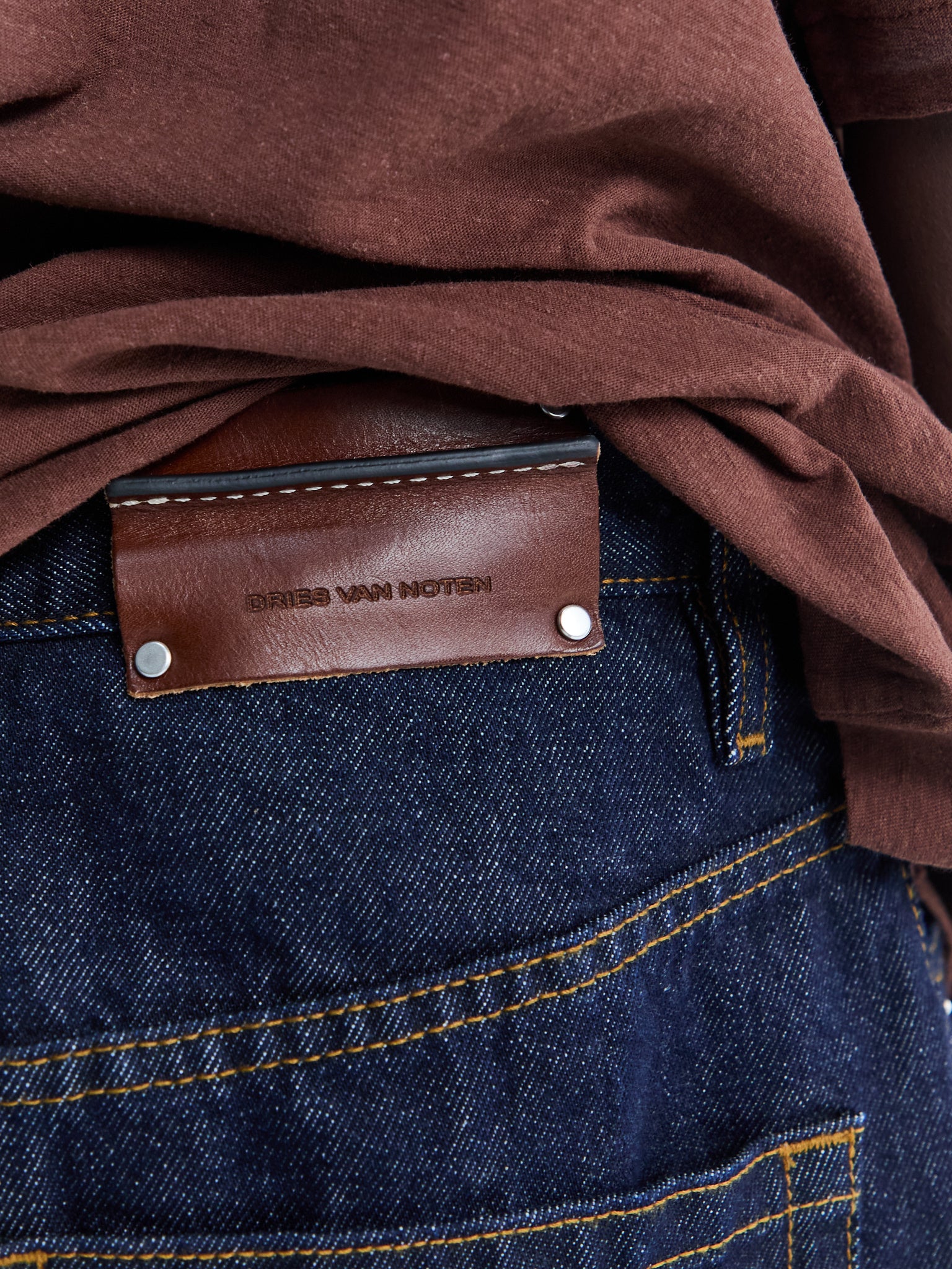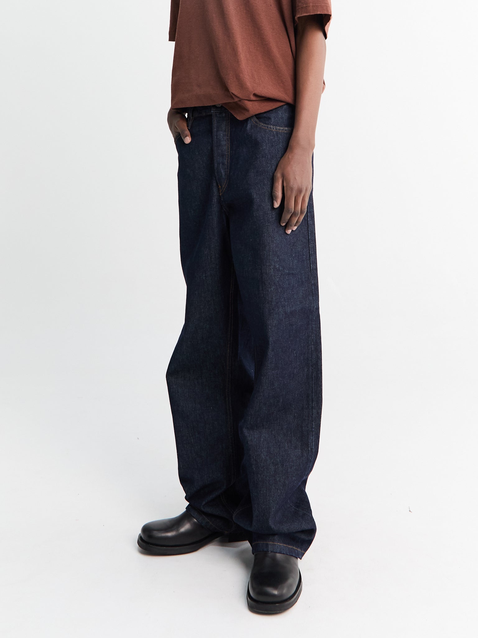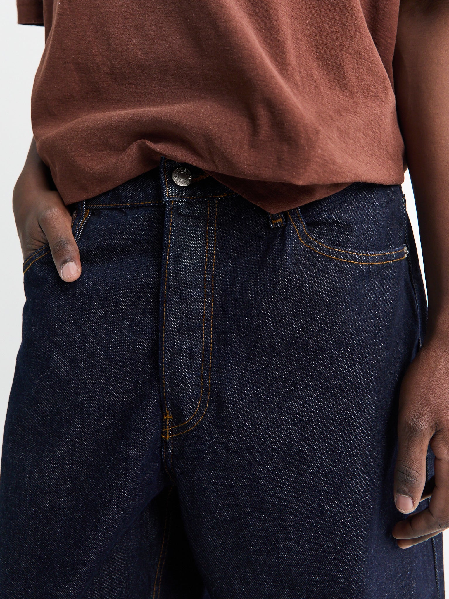 Relaxed silhouette with functional belt loops and classic five-pocket construction. Tan contrast stitching adds subtle detail to this deep indigo blue pair.