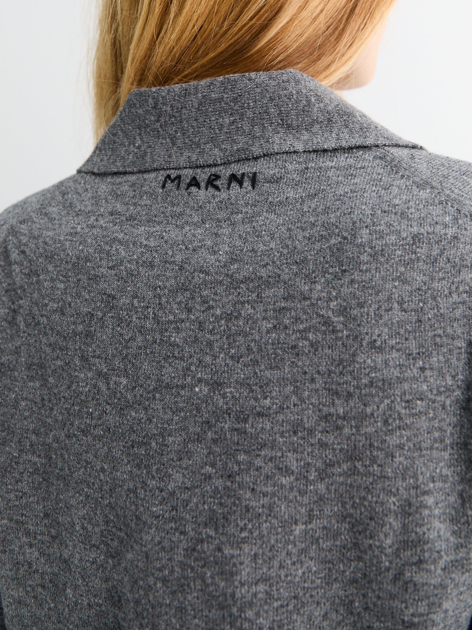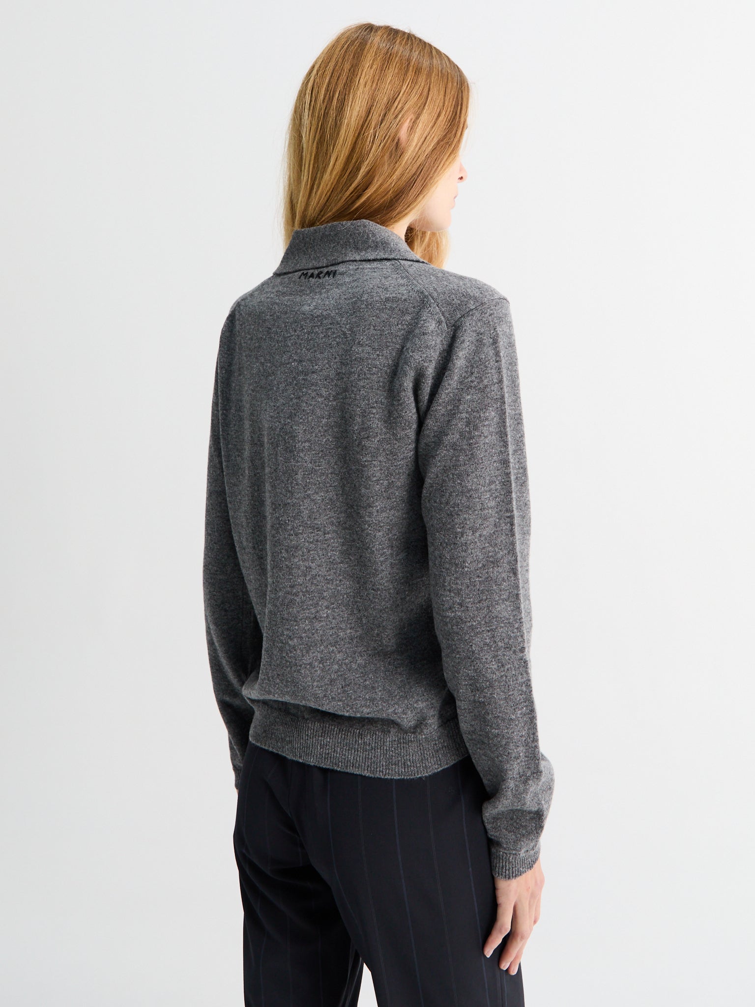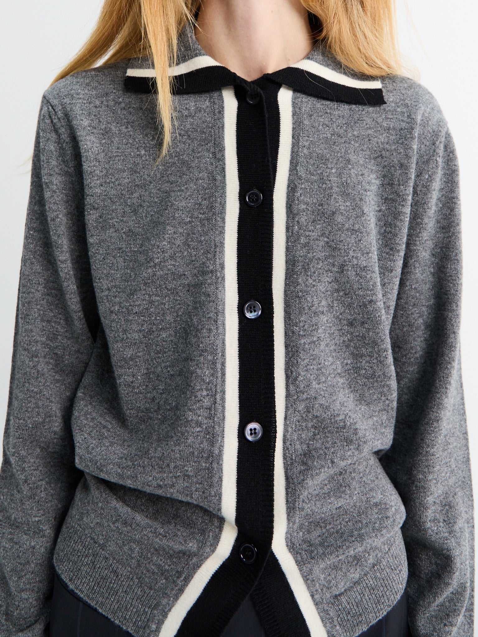 This graphite cardigan offers a polo collar, long sleeves, and a button-front closure. Made from 100% virgin wool, it features a contrasting strip down the front and a hand-embroidered logo on the back for subtle detail