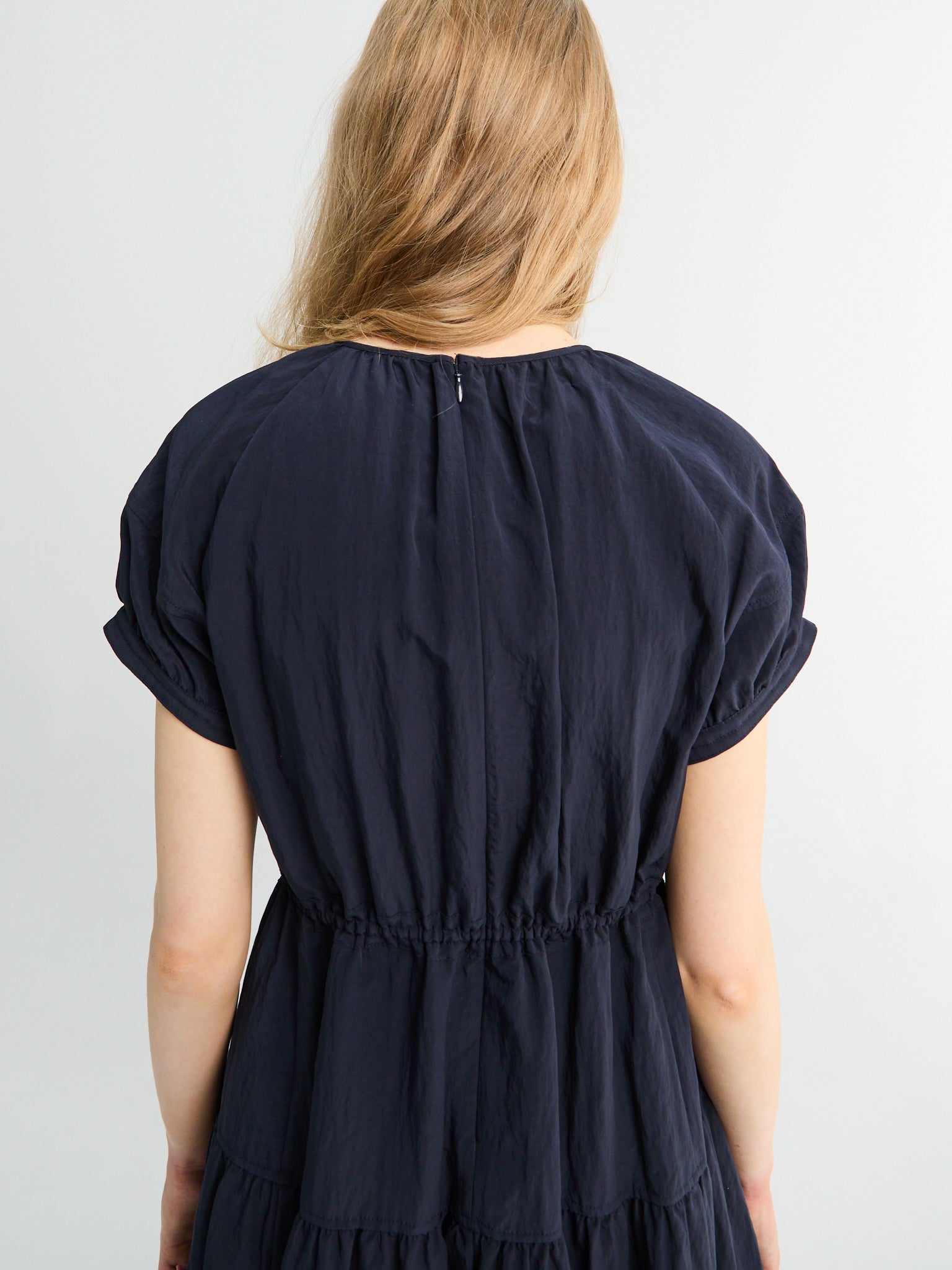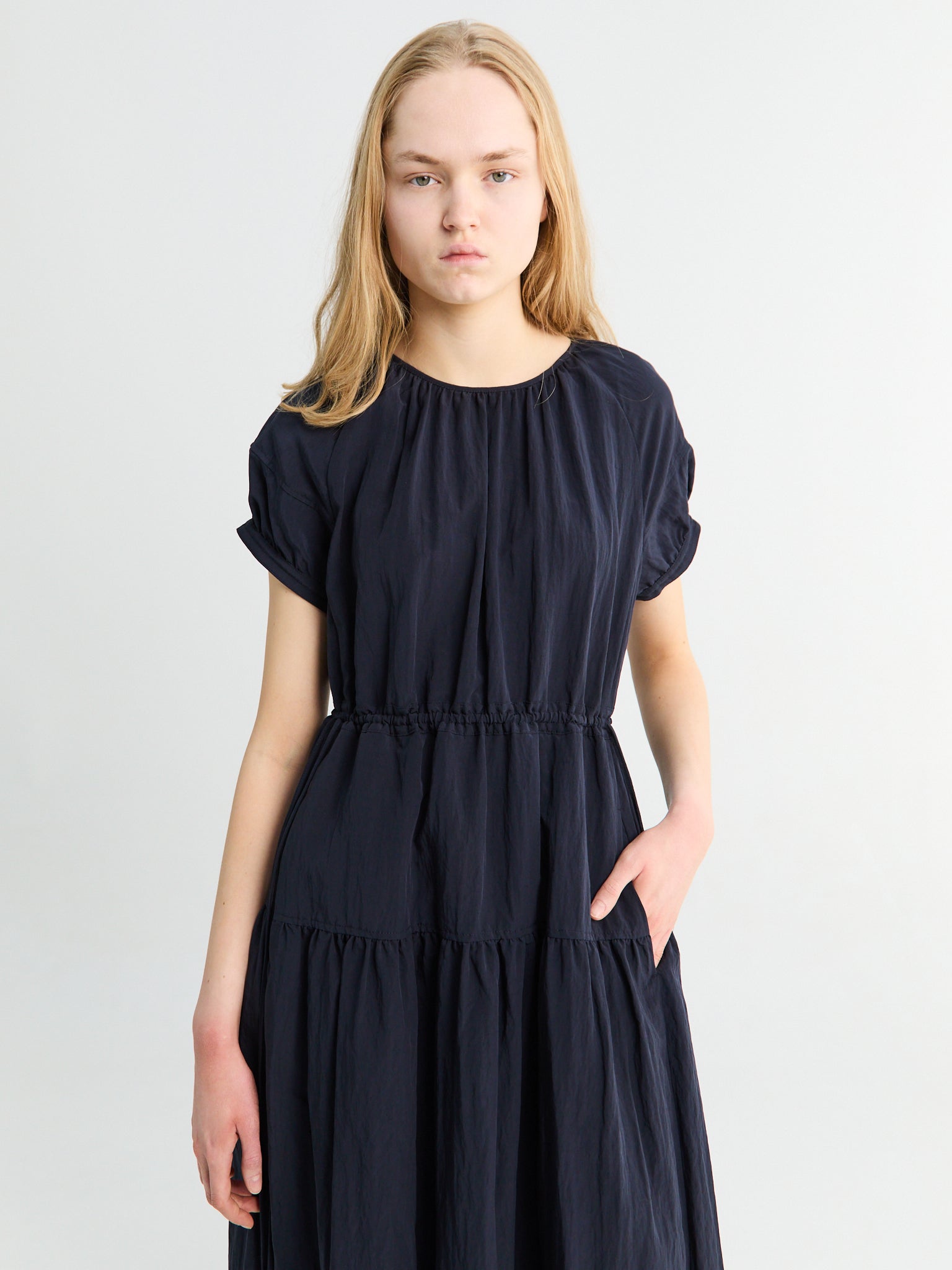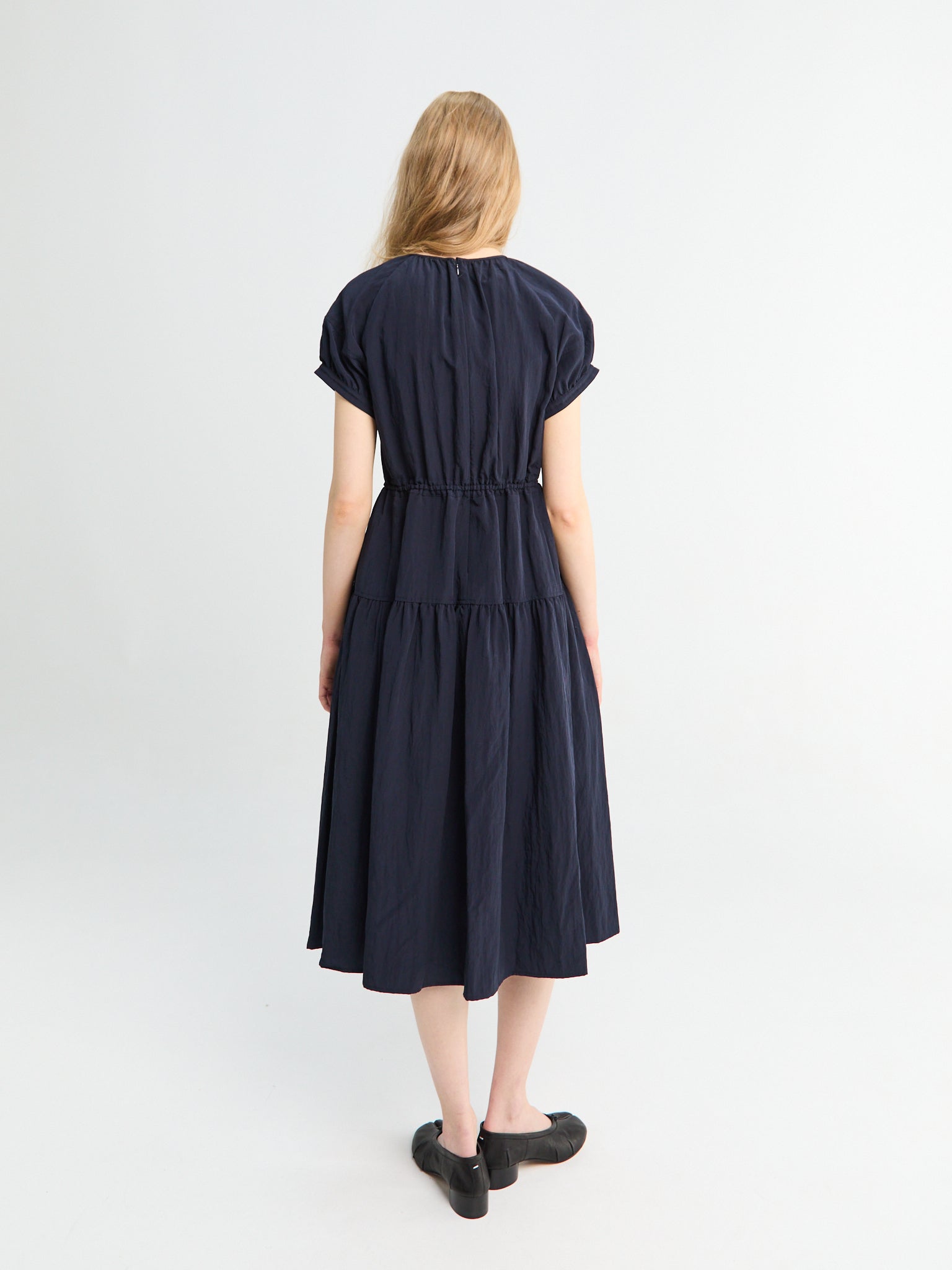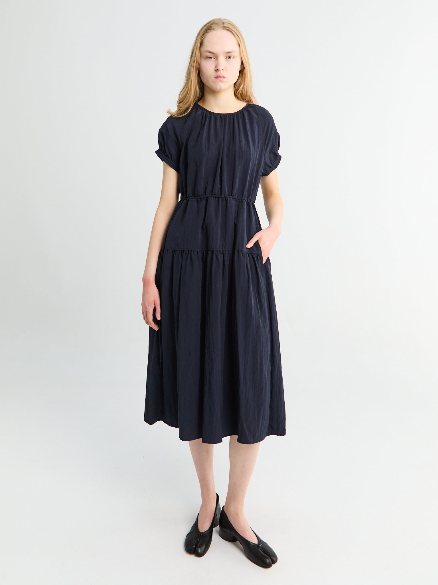 Cut in a deep navy, this half-sleeve dress is designed with a minimal profile and clean construction. Its relaxed silhouette is defined by an adjustable string detail at the waist, creating a fluid and elegant drape.