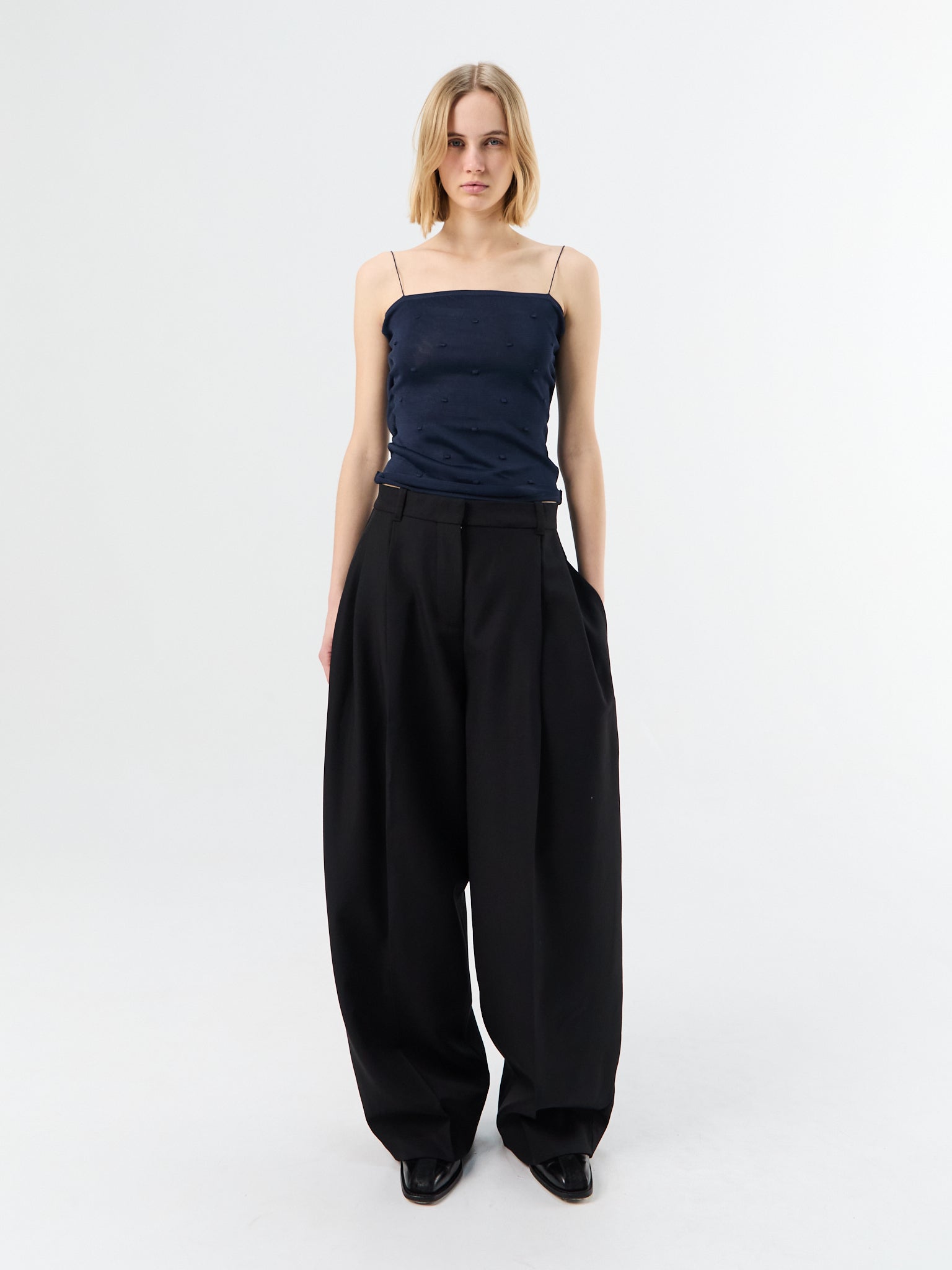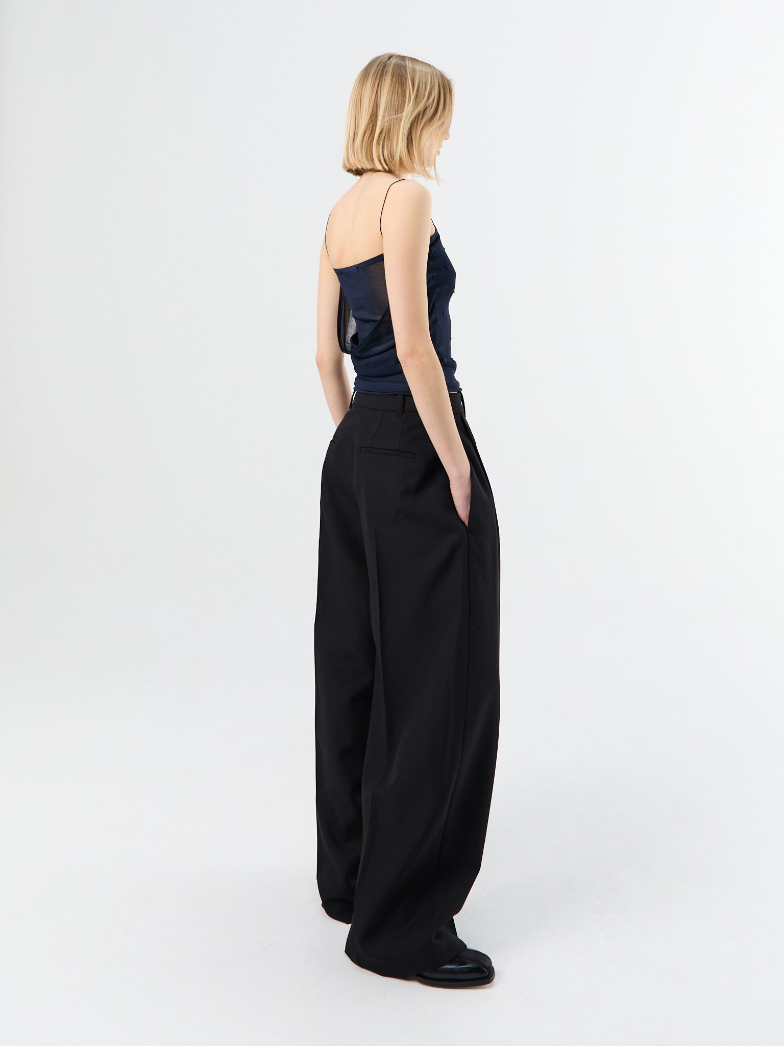 An oversized trouser with fluid suiting fabric and sharp front pleats. The wide leg pools at the hem, anchored by a structured waistband for a refined silhouette.