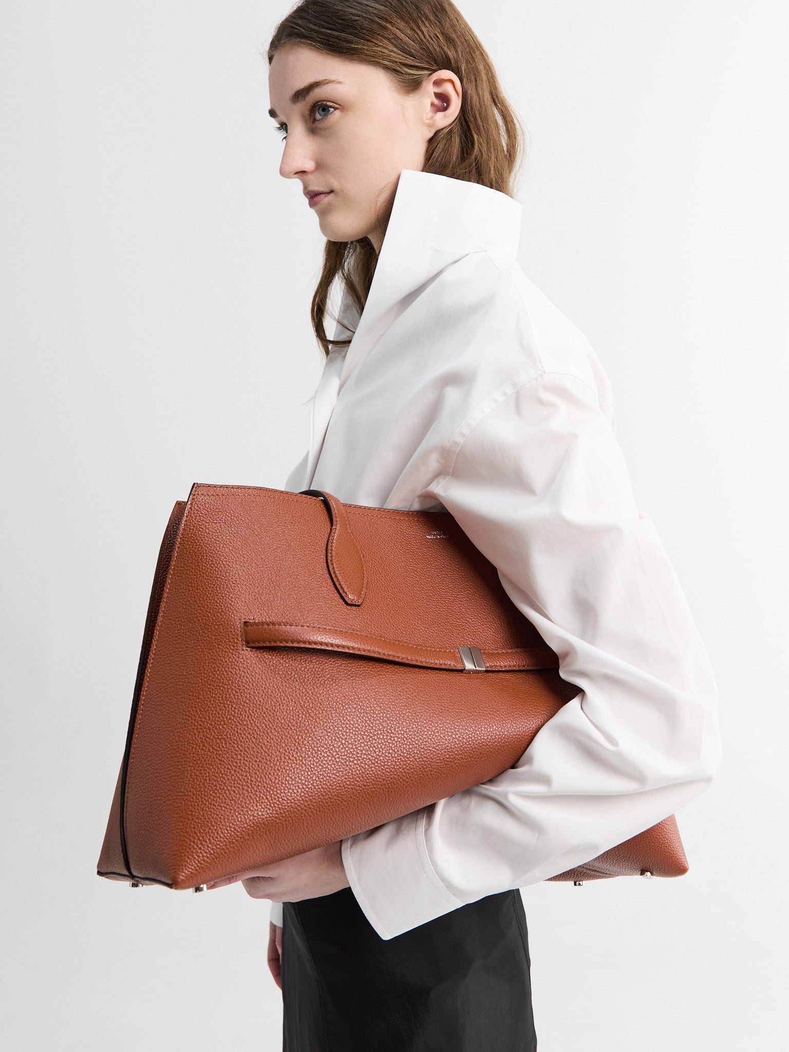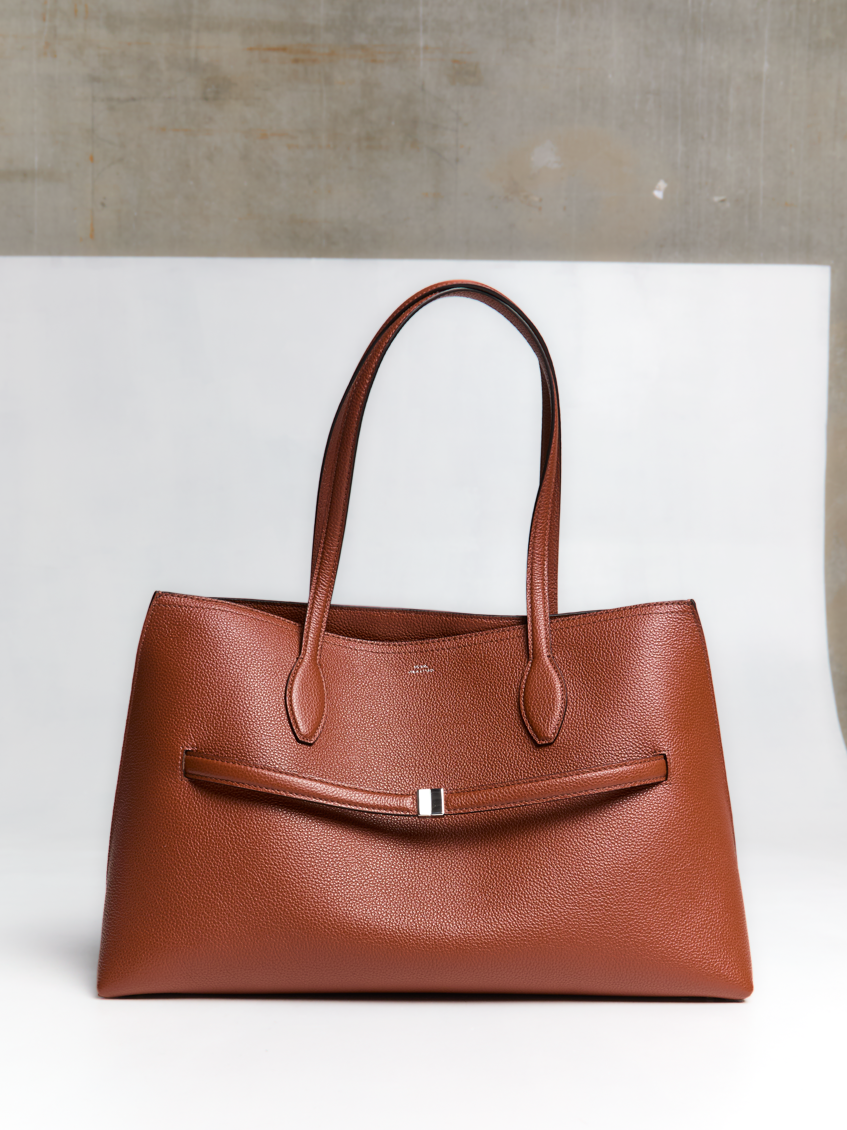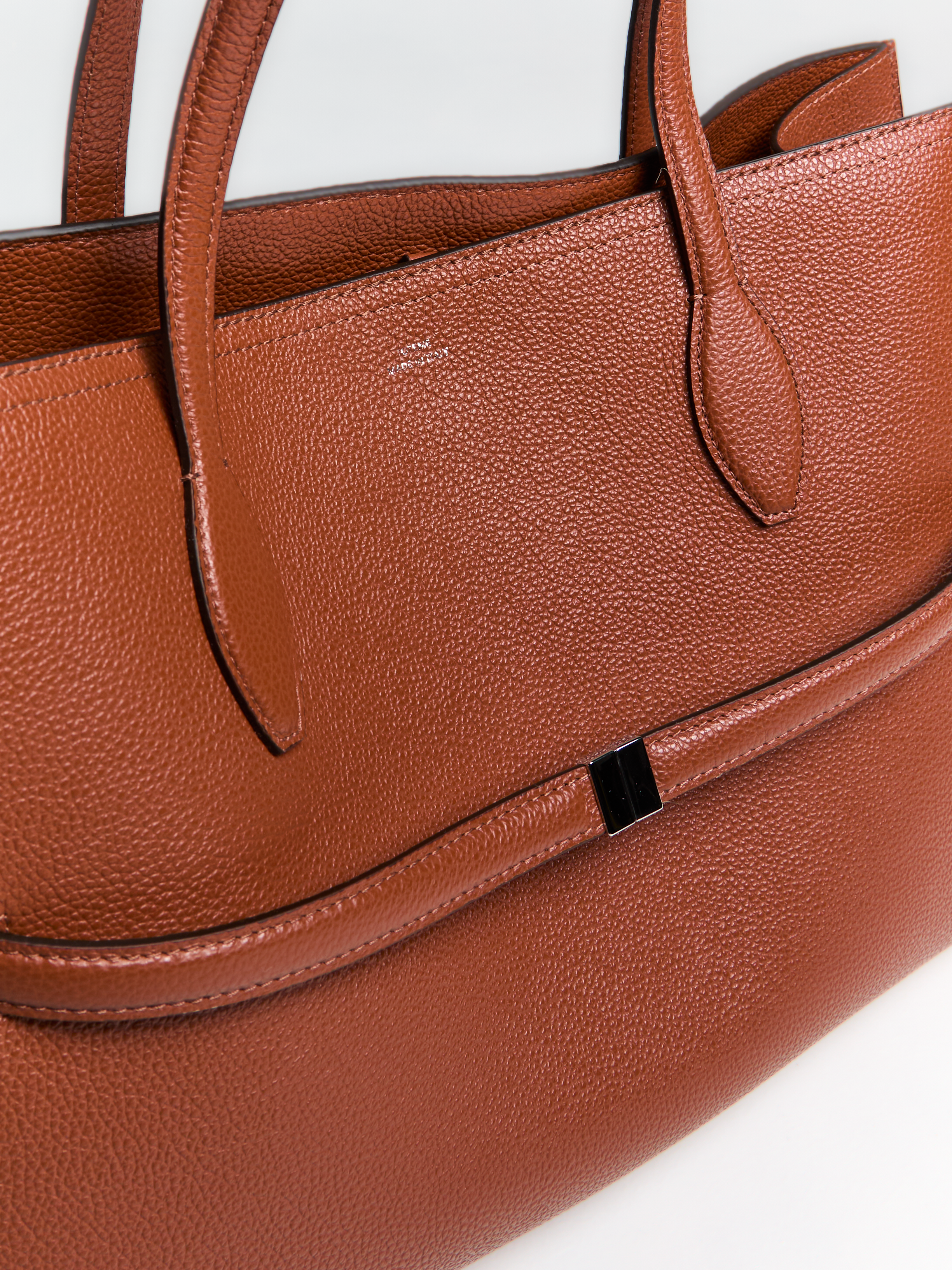 The Lounge Tote features a structured silhouette crafted from grained sienna leather. It is detailed with dual top handles and a distinct flap closure finished with understated hardware. Inside, the spacious and unlined interior showcases the natural quality of the material.