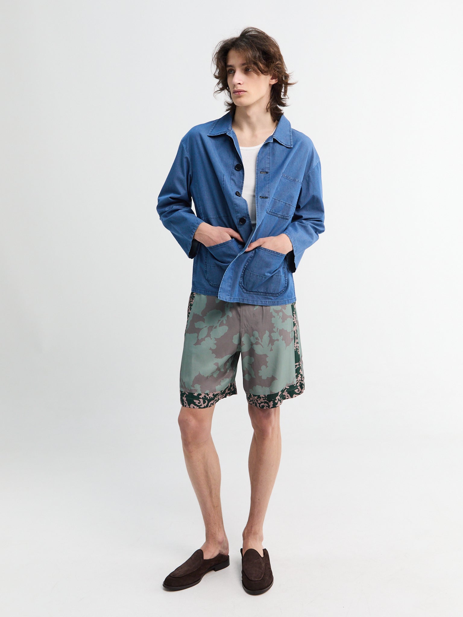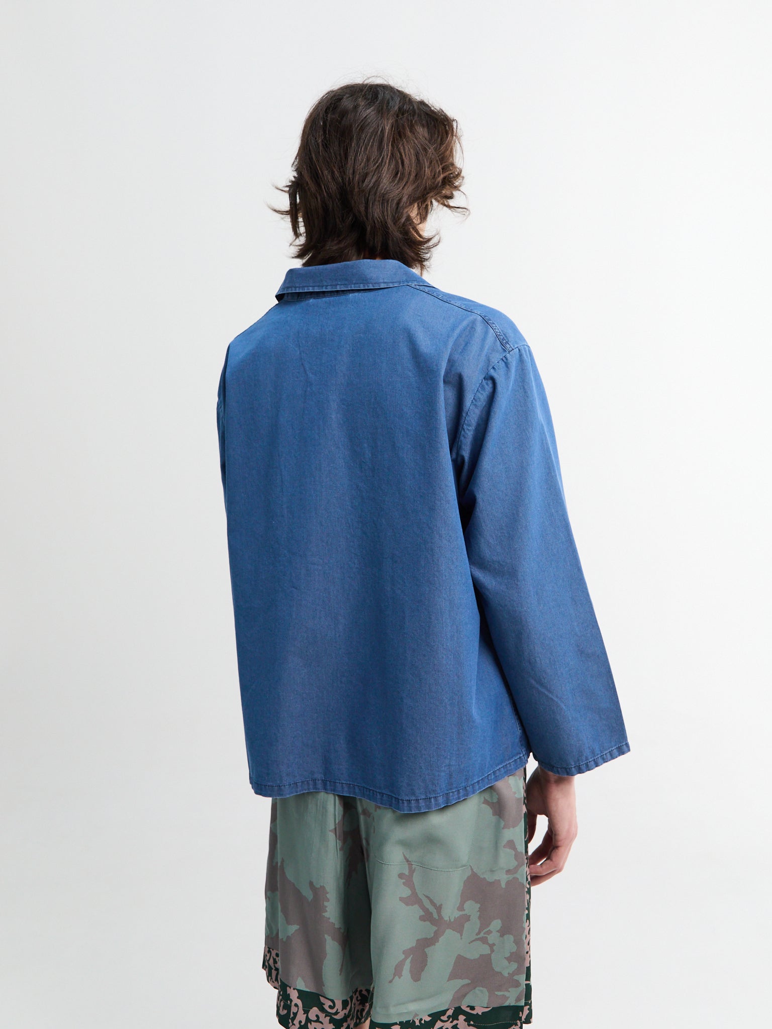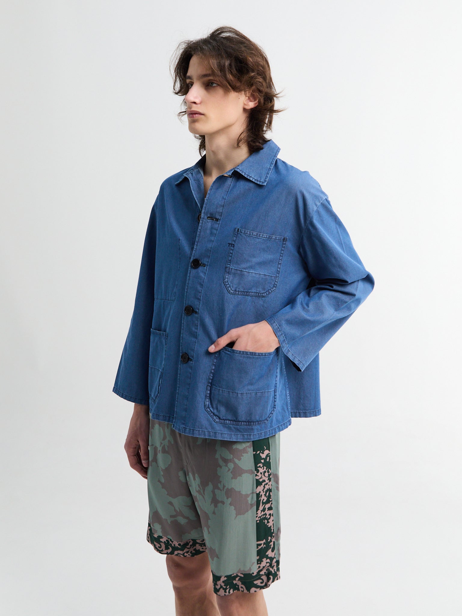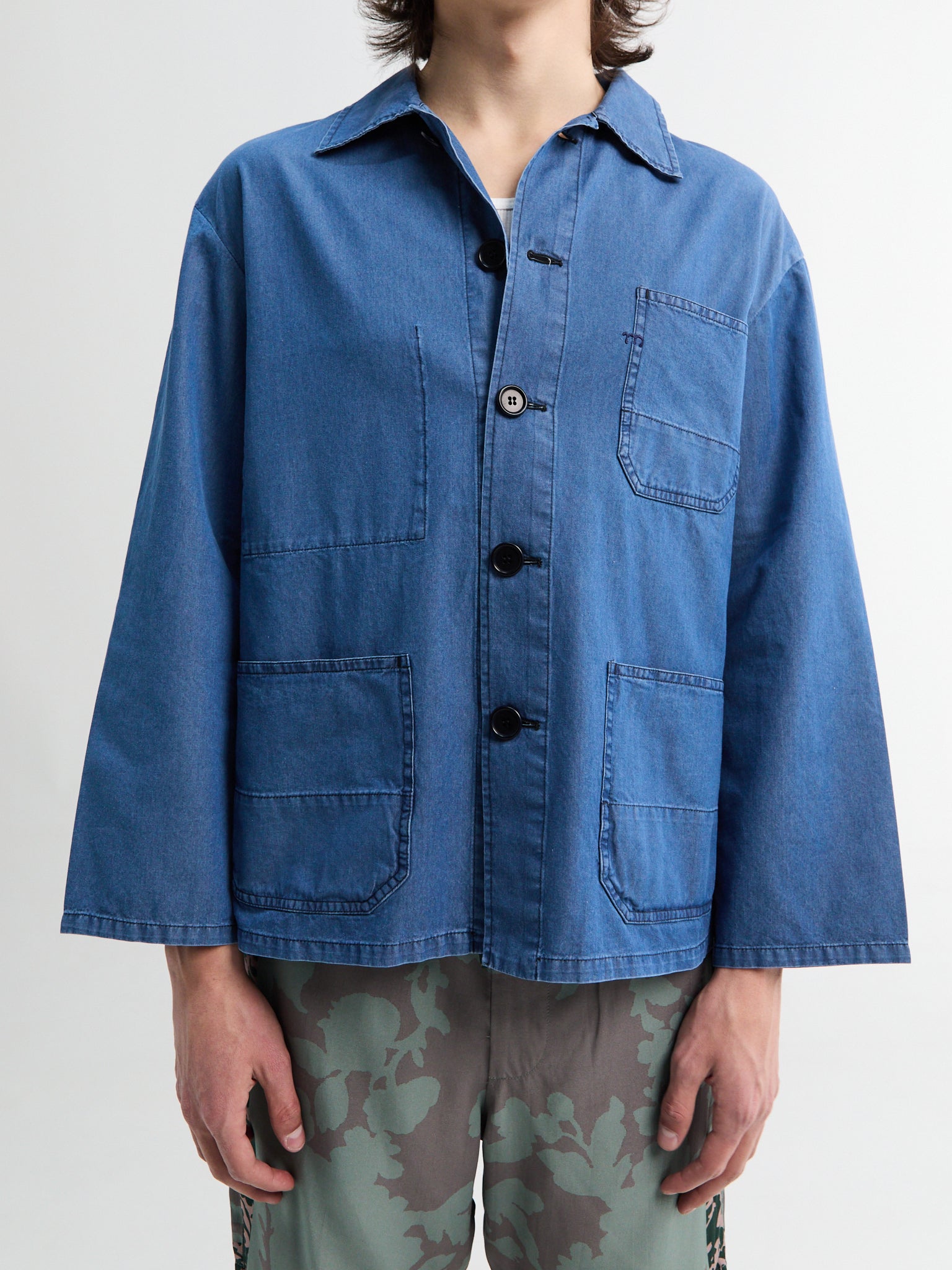 The Bill Jacket is a cropped workwear style in durable cotton denim, defined by a distinct boxy silhouette. A custom teawash finish lends a faded, worn-in appearance, while two large front patch pockets and a classic point collar complete the design.