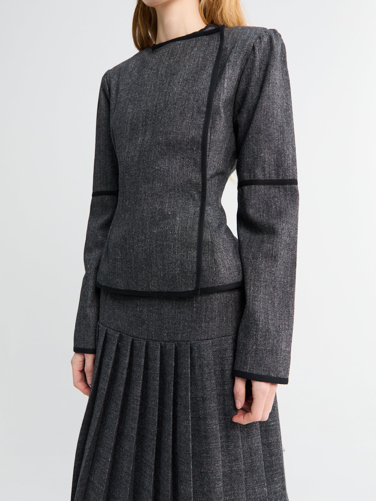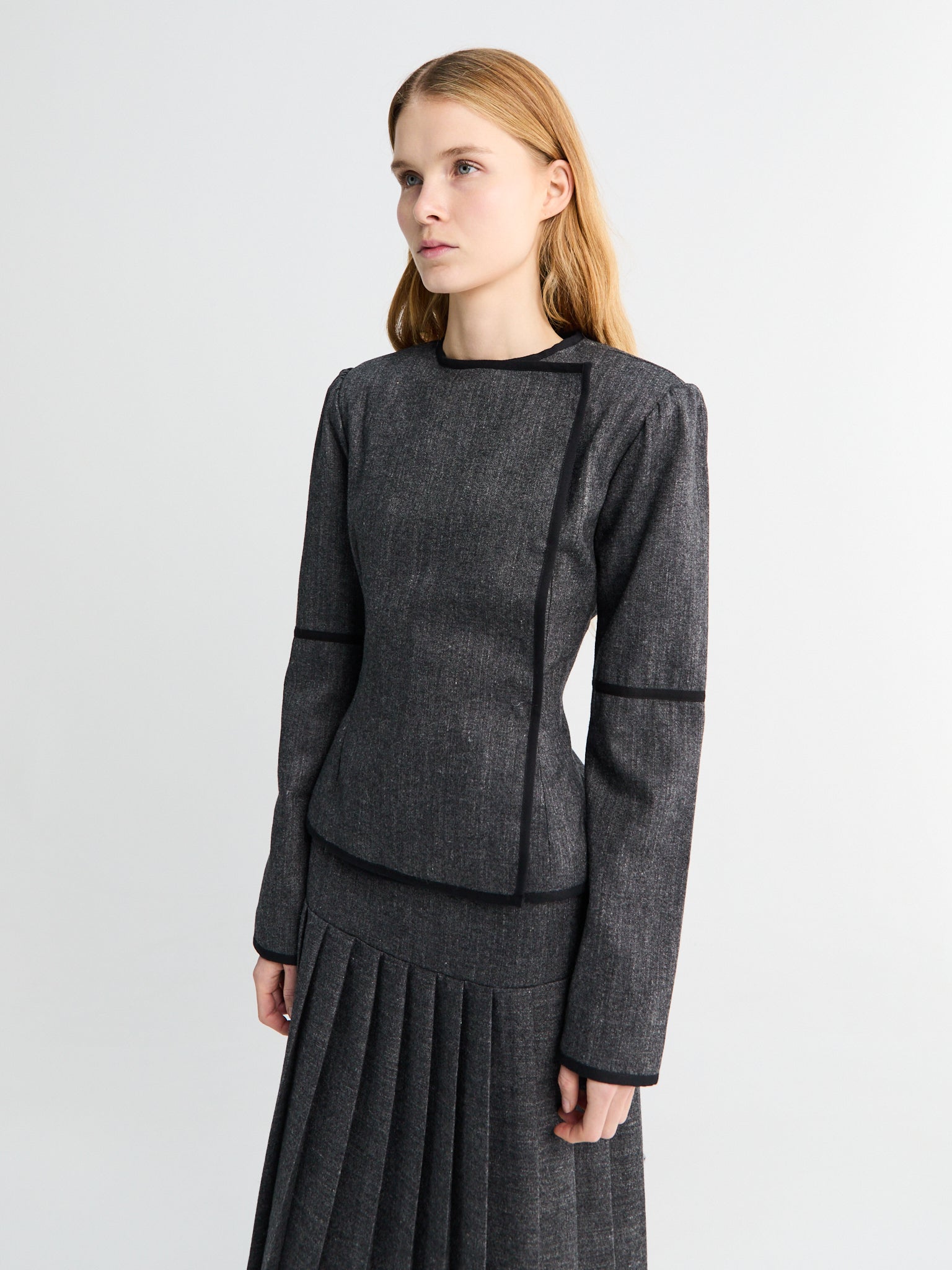 This tailored wool jacket features a distinctive crossover front with black binding along the edges and sleeves. The design showcases gently voluminous sleeves that taper above the elbow, creating an elegant silhouette. Fully lined for comfort and structure, this medium-weight piece offers a refined fit.