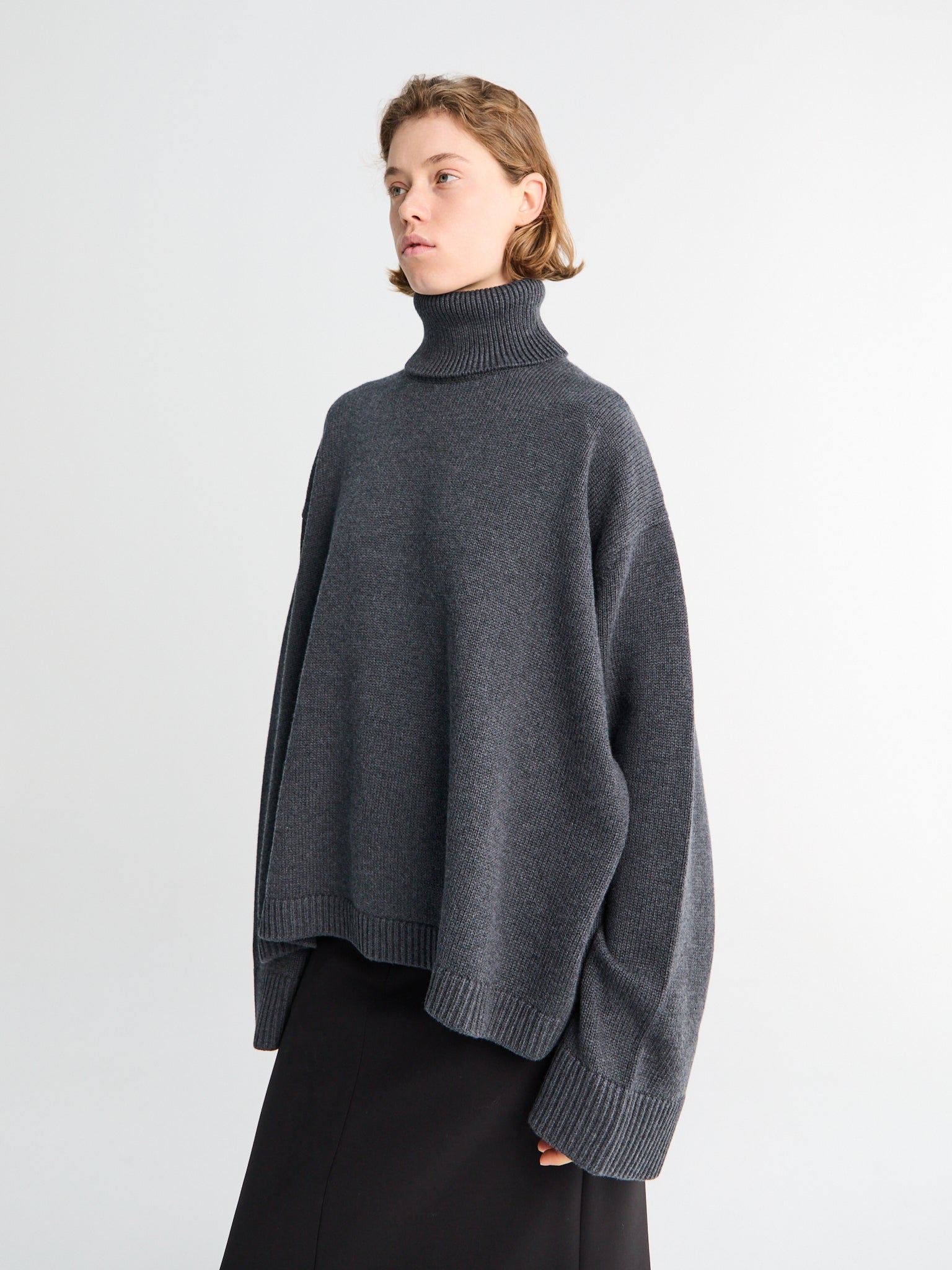 The Rhea Trapeze Turtleneck in charcoal is made from a midweight ribbed knit fabric. It features a turtleneck, drop shoulders, and ribbed knit trim. The design has a boxy, relaxed silhouette and is a slip-on style, unlined for a lightweight feel.