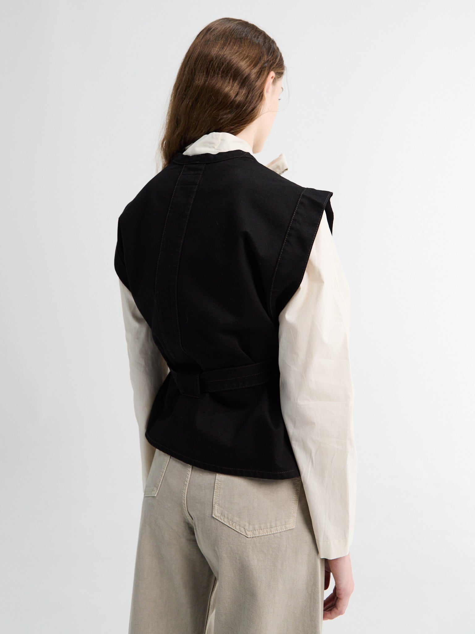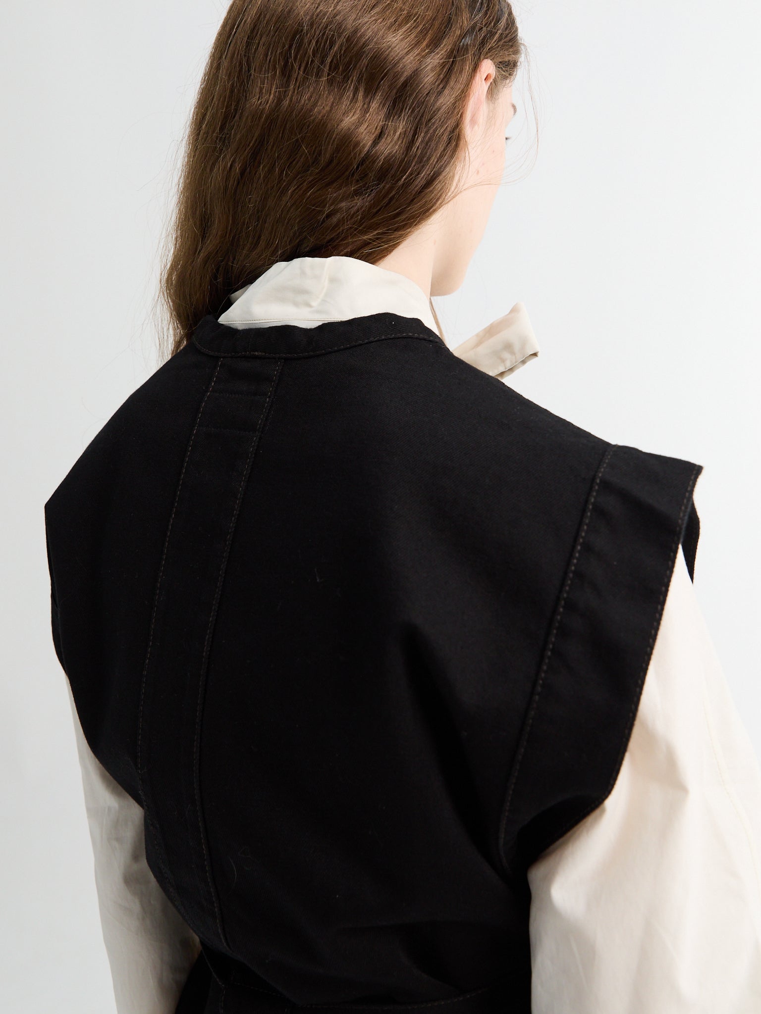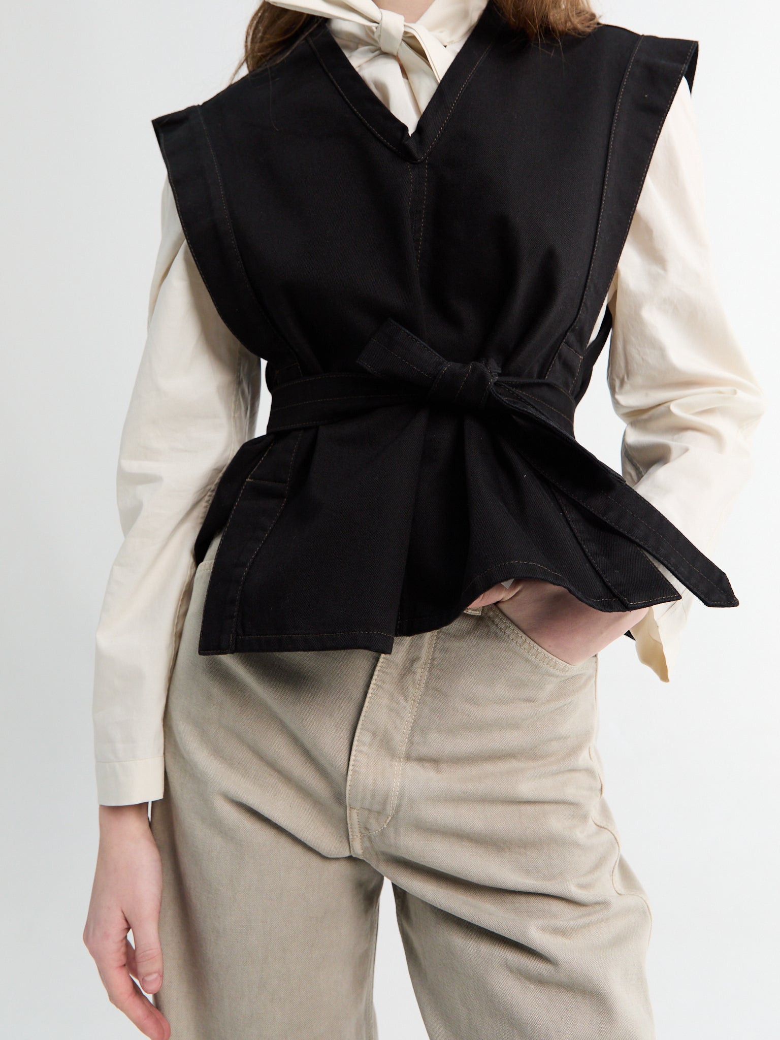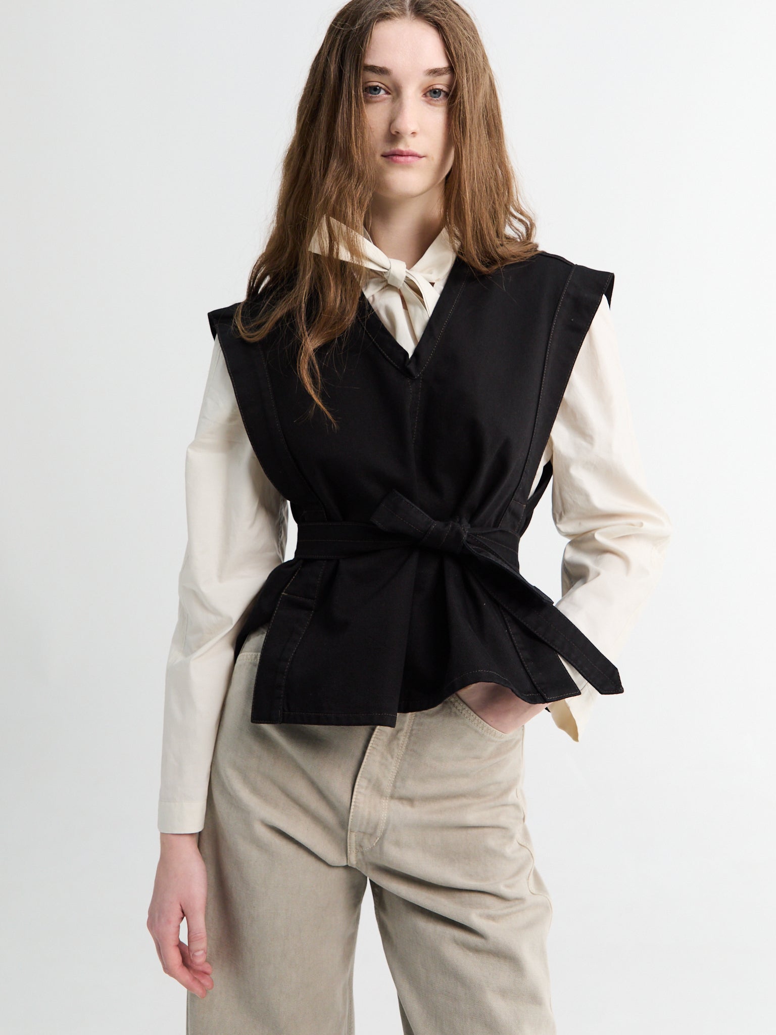 The Chasuble is a signature Lemaire silhouette, designed as an open-sided vest to drape over the shoulders. Crafted from a single panel of fabric, its structured V-neck form falls cleanly down the body, creating both volume and movement.