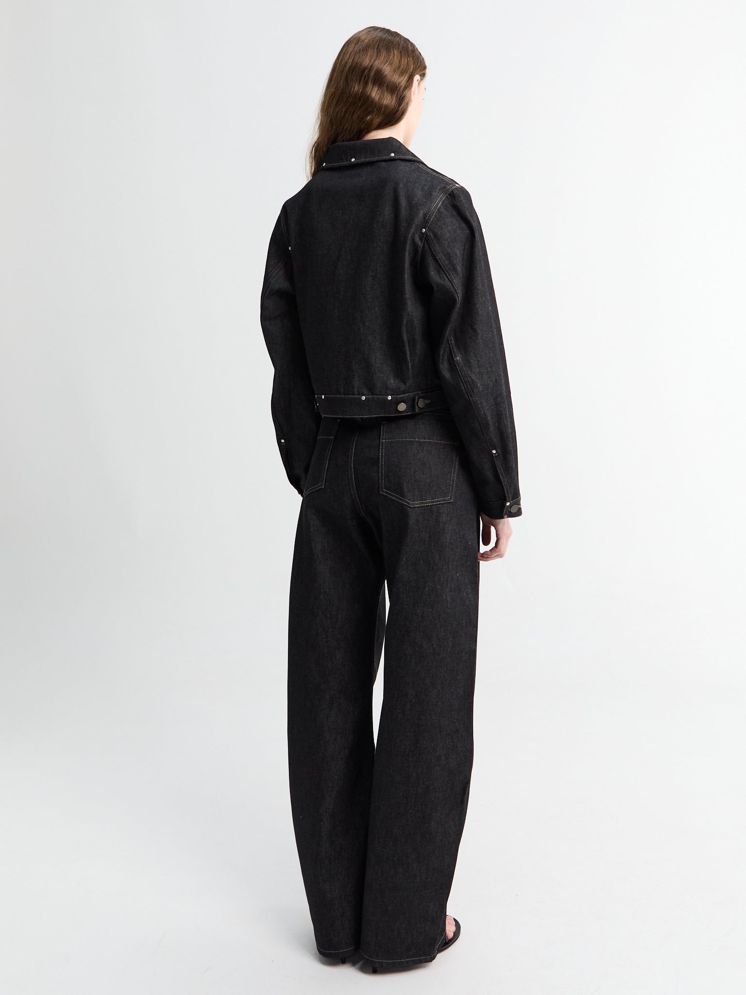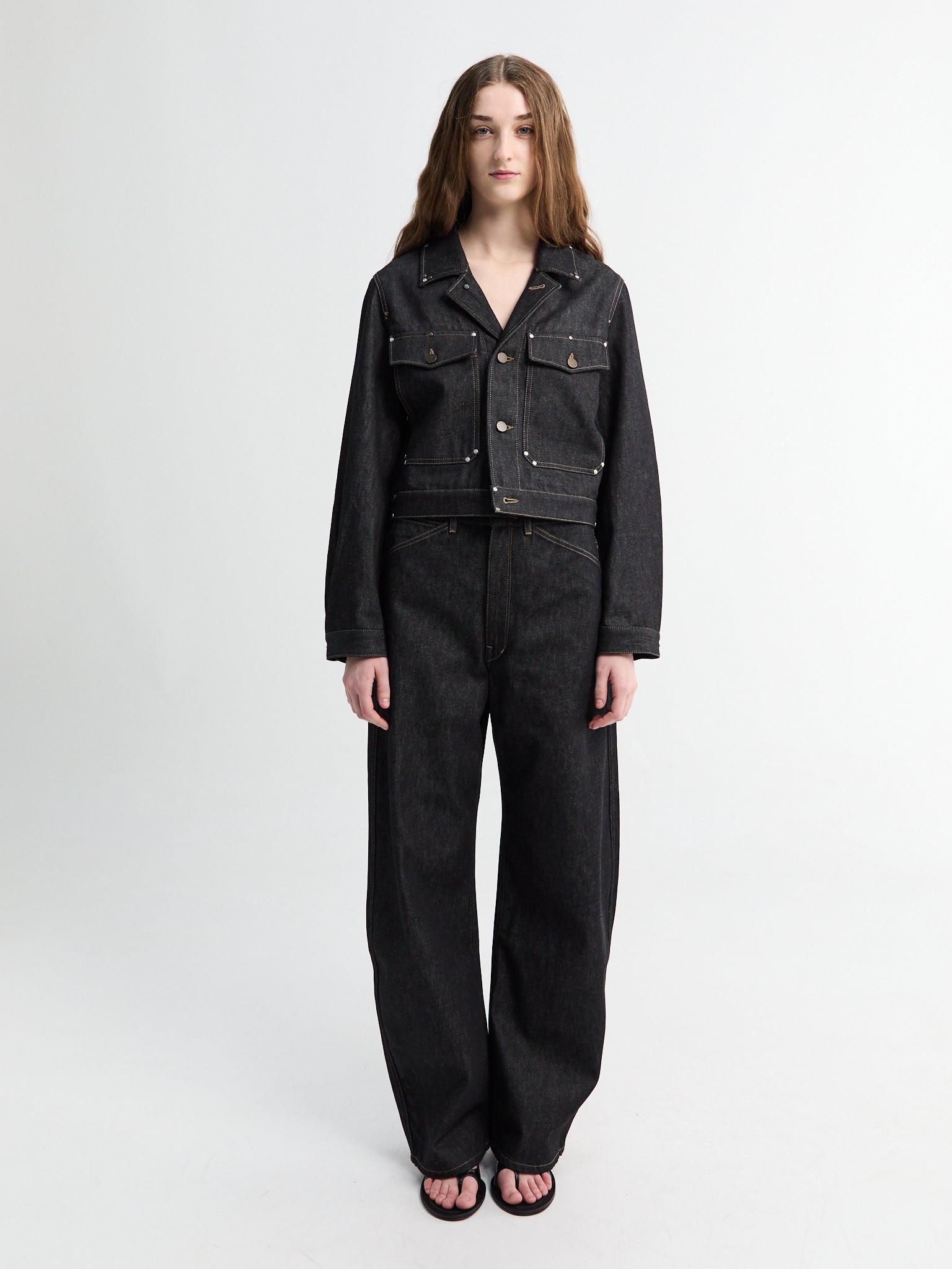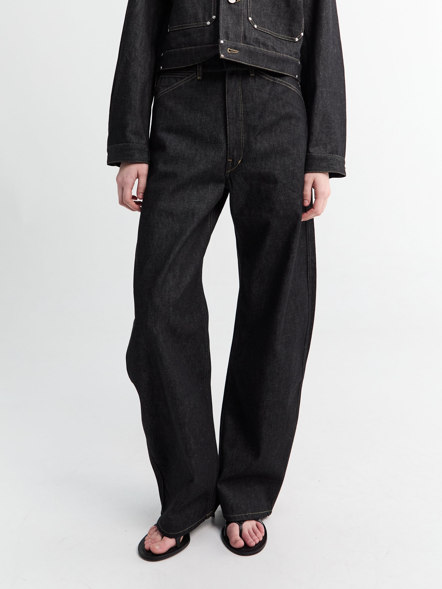 High-waisted curved pants in heavyweight slate denim with a wide, comfortable fit. Features belt loops, concealed fly, side pockets, and back patch pocket. Finished with contrasting topstitching and an embossed leather patch detail.